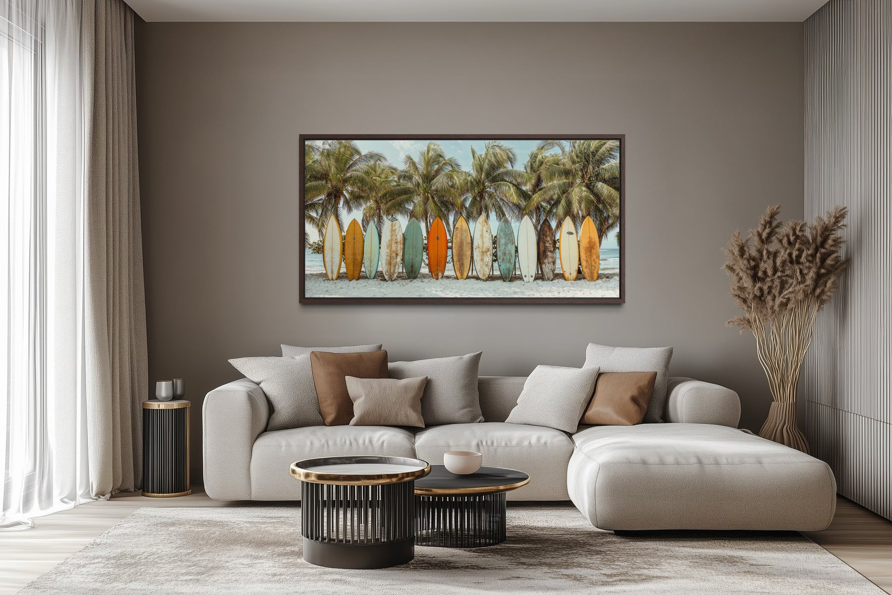 La palette de cette œuvre d'art représentant des planches de surf sur la plage est à la fois ludique et polyvalente, avec un mélange de couleurs évoquant la chaleur, la liberté et la brise marine. Chaque planche se distingue par des teintes telles que le bleu ciel, l'orange brûlé, le vert écume, le rouge délavé et le blanc immaculé, agrémentées de subtiles éraflures et de textures brossées qui ajoutent de la profondeur. Le sable, d'un beige doré doux, ancre la composition d'une chaleur naturelle, accueillante et apaisante. Les troncs de palmiers sont peints dans des bruns superposés et des gris discrets, leur rugosité contrastant avec le vert tendre de leurs frondes ondulantes. En arrière-plan, un ciel nuageux et doux apporte un mélange de bleus pastel et d'ivoire baigné de soleil, créant une ambiance légère et aérienne. Cette décoration murale représentant des planches de surf sur la plage s'intègre parfaitement aux intérieurs côtiers, aux murs blanchis à la chaux ou aux touches de rotin, permettant à l'œuvre de se fondre et de se démarquer. Les couleurs, ensoleillées et organiques, créent une harmonie plutôt qu'une contradiction. Avec son équilibre de couleurs et son calme, cette œuvre apporte une joie naturelle à chaque regard. La couleur rencontre le littoral dans cette œuvre murale vibrante représentant des planches de surf sur la plage.