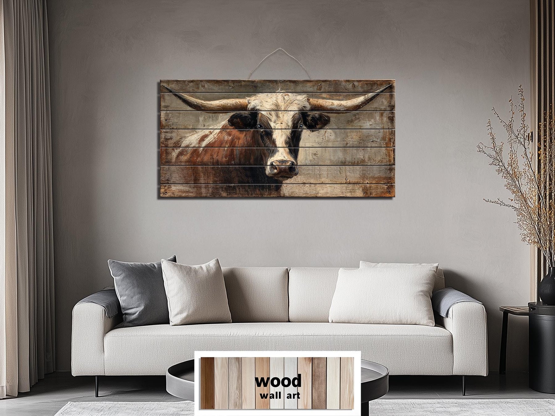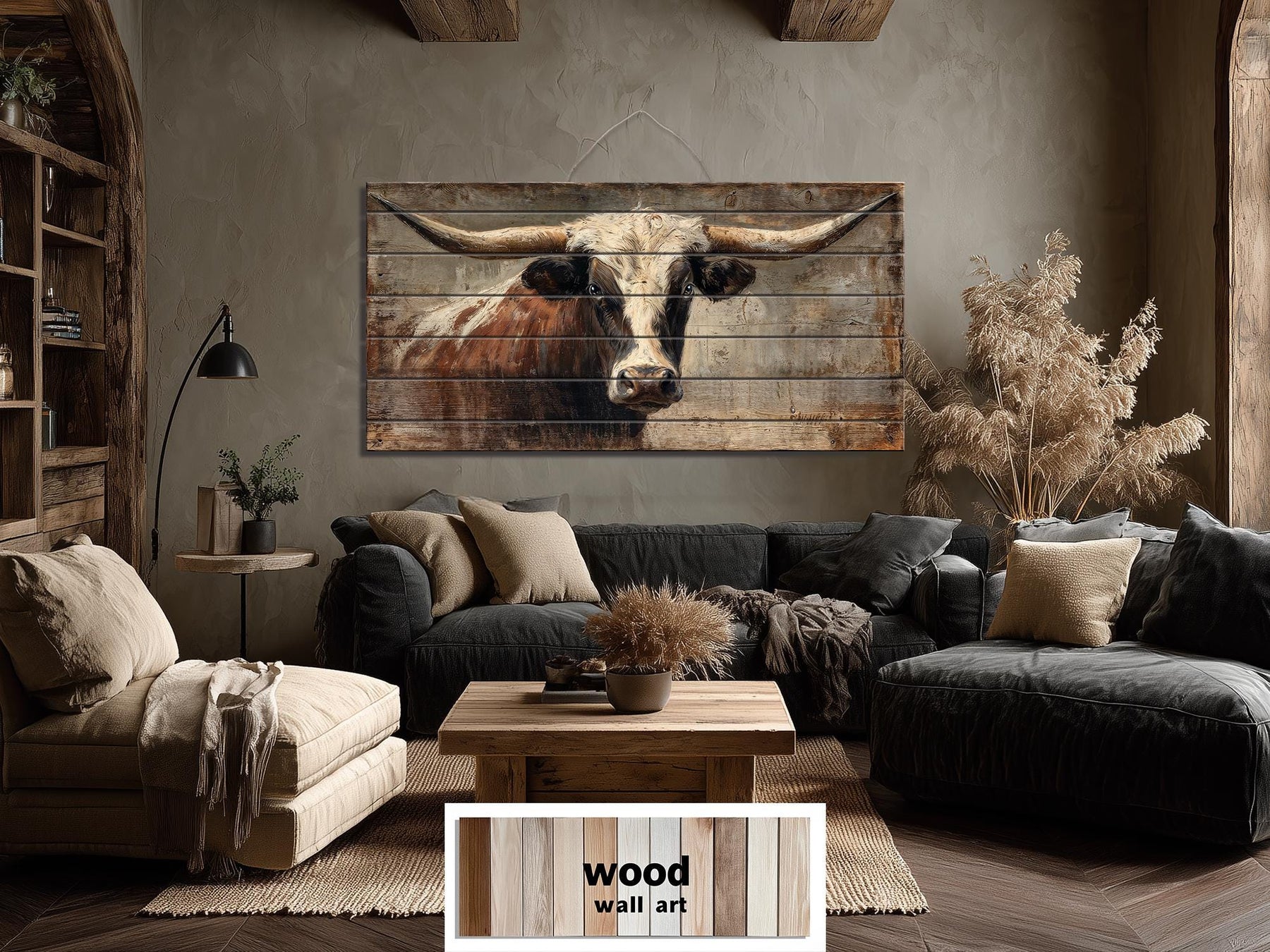 Cette pièce a été conçue pour le salon western et la ferme au caractère texan authentique — des espaces où le ranch, la prairie ouverte et l'héritage culturel du Sud-Ouest américain ne sont pas de simples références esthétiques mais de véritables parties de l'identité des personnes qui y vivent et des maisons qu'elles ont construites. Un salon western avec des sièges en cuir foncé, des meubles en bois recyclé, des tapis en peau de vache, des accents en fer vieilli et l'atmosphère chaleureuse et tranquille d'une maison qui sait exactement ce qu'elle aime et l'assume entièrement, trouvera dans cette œuvre d'art murale de taureau Texas Longhorn une pièce maîtresse si parfaitement alignée avec l'identité visuelle et culturelle de la pièce qu'elle semble absolument inévitable. L'envergure extraordinaire des cornes du Texas Longhorn rend cette pièce particulièrement adaptée aux grands murs d'accent des grands salons western ou de ferme — les cornes s'étendant presque d'un bord à l'autre de la toile horizontale déjà grande, créant une présence visuelle qui remplit même le mur le plus généreux avec une autorité totale et sans aucun sentiment d'être submergé par l'espace. Au-dessus d'une cheminée en pierre, au-dessus d'un grand canapé, ou centré sur un mur d'accent en lattes dans un salon western ou de ferme, cette pièce ancre toute l'esthétique de la pièce autour d'une seule image si culturellement spécifique et si visuellement puissante que chaque autre choix de design dans la pièce s'oriente naturellement autour d'elle. La ferme moderne qui souhaite un caractère western authentique à côté de ses lignes épurées et de sa palette neutre trouvera que cette pièce apporte ce caractère avec une authenticité totale — les tons chauds fauves et l'arrière-plan en bois rustique s'harmonisant magnifiquement avec le crème, le lin, le bois chaud et le fer vieilli d'une manière qui semble sélectionnée plutôt que dépareillée. Une maison de ranch ou toute propriété avec de véritables terres d'élevage visibles depuis ses fenêtres trouvera que ce portrait de Longhorn relie l'intérieur et l'extérieur de la manière la plus directe et la plus significative possible. Laissez cette décoration murale en bois de taureau Texas Longhorn faire de votre salon western ou de ferme la pièce la plus audacieuse, la plus authentiquement texane et la plus inoubliable qu'il n'ait jamais été.
