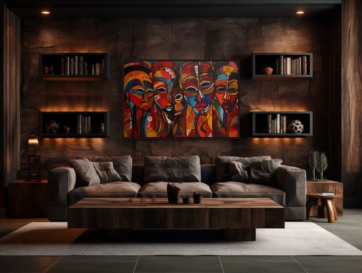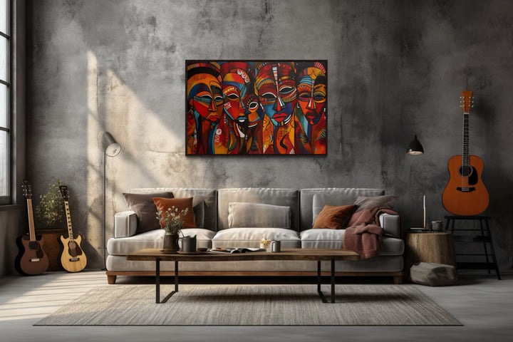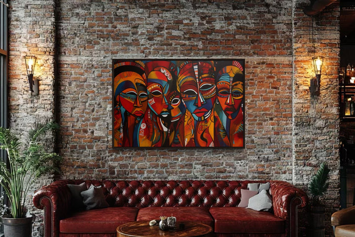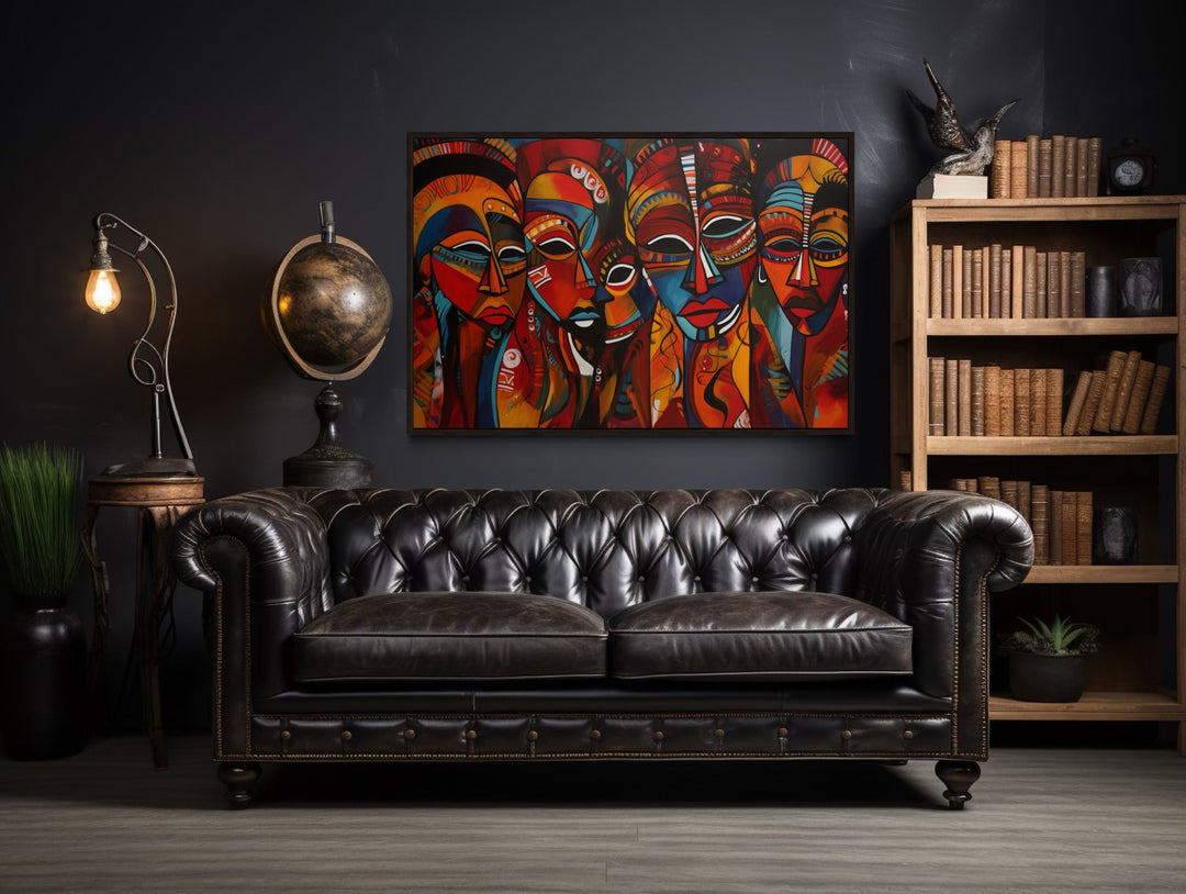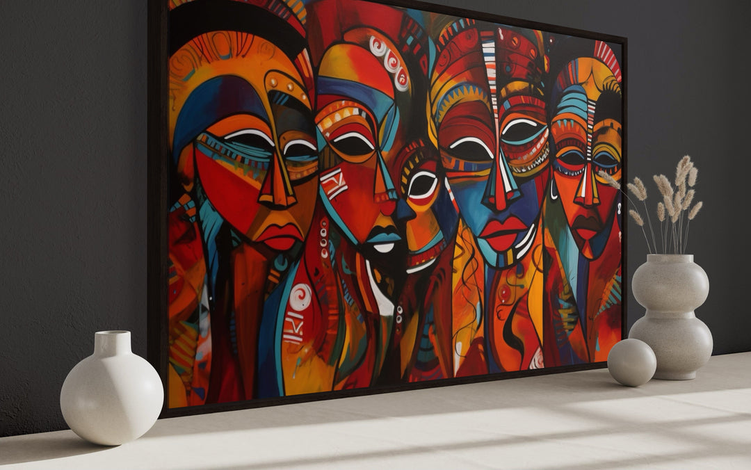 Toile encadrée représentant des masques africains traditionnels rouges