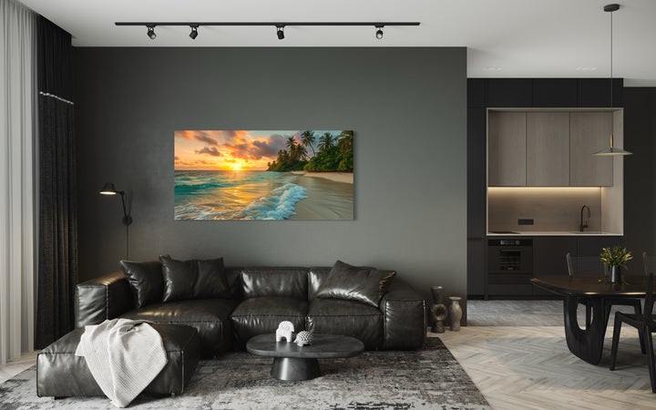 Toile encadrée représentant une plage tropicale au coucher du soleil