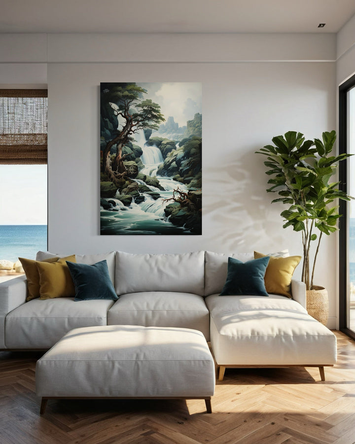 La palette de couleurs de cette toile murale représentant une cascade est un mélange apaisant de verts atténués, de bleus doux et de tons de terre chauds. Ces couleurs créent une sensation de profondeur et de tranquillité, tandis que la cascade coule doucement sur un fond de feuillage luxuriant. Les nuances de vert mettent en valeur la vie végétale abondante, tandis que les bleus subtils apportent une ambiance fraîche et fraîche à l'eau en cascade. Des touches de brun chaud et de beige ancrent la pièce, ajoutant une richesse naturelle à la scène. Cette palette de couleurs est idéale pour mettre en valeur les environnements paisibles, que ce soit dans les salons ou les espaces de méditation. Les tons apaisants créent une expérience visuelle sereine, encourageant la relaxation et la réflexion. Cette peinture de cascade sert de point focal accrocheur qui équilibre sans effort la couleur et l'harmonie. Elle complète une gamme de styles d'intérieur, du minimaliste au traditionnel, avec sa palette intemporelle.