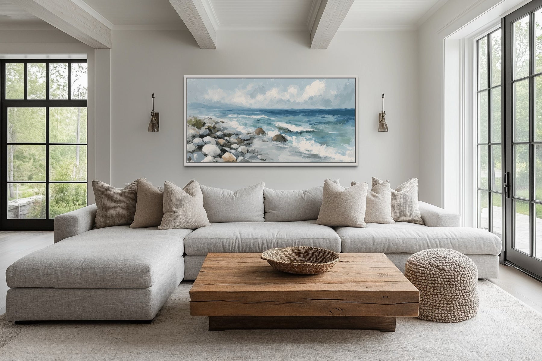 Cette œuvre d'art s'intègre parfaitement aux intérieurs à la simplicité côtière, à la chaleur d'un cottage ou à l'élégance transitionnelle, notamment dans les pièces qui privilégient la lumière naturelle, les textures patinées et les palettes de tons doux. Elle s'intègre parfaitement aux salons d'inspiration balnéaire, avec des meubles recouverts de housses, des éléments tissés et des textiles superposés dans des tons bleu pâle, ivoire et sable chaud. Sa structure encadrée et sa disposition horizontale lui permettent de s'intégrer naturellement au-dessus d'un canapé, d'un buffet ou d'un banc d'entrée, où elle ancre le mur tout en préservant la luminosité et l'espace. Dans les chambres décorées avec du linge de maison impeccable, des meubles en bois clair et des accessoires côtiers sobres, l'œuvre d'art apporte profondeur visuelle et sophistication discrète. Son ton nostalgique s'harmonise avec des détails vintage comme des miroirs anciens, des cadres en bois flotté et des vases en céramique, tandis que sa finition épurée lui confère une touche de fraîcheur dans les espaces modernes. Elle convient également parfaitement aux intérieurs transitionnels, où des éléments de style campagnard, rustique ou minimaliste se marient à une inspiration balnéaire. Pour les propriétaires qui recherchent une œuvre d'art qui les relie à la côte sans recourir à des couleurs vives ou à des thèmes criards, cette décoration murale de paysage marin offre une alternative élégante et intemporelle. Simple, gracieux et évocateur, il complète n'importe quelle pièce avec la présence paisible d'une impression sur toile côtière vintage.
