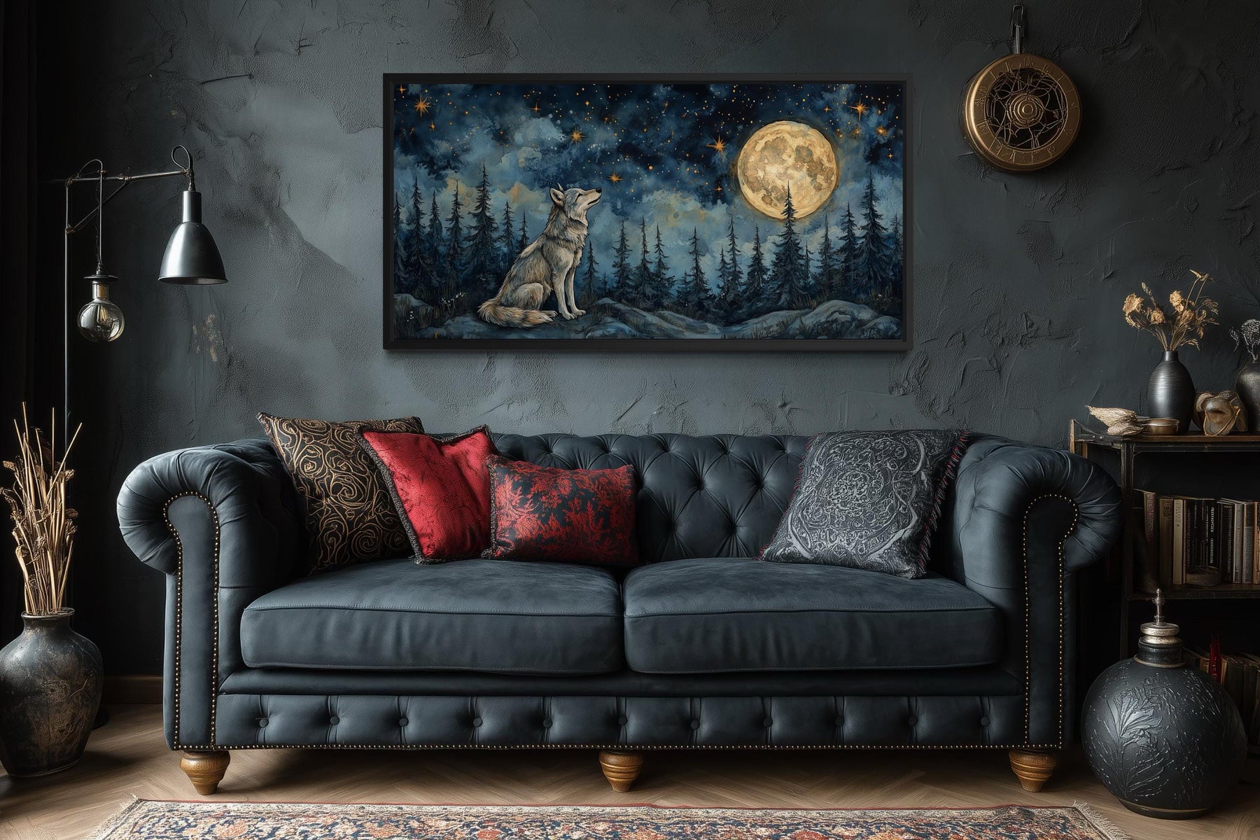 Toile murale Loup – Loup sous la pleine lune, œuvre d'art en forêt nocturne | Décoration rustique pour chalet