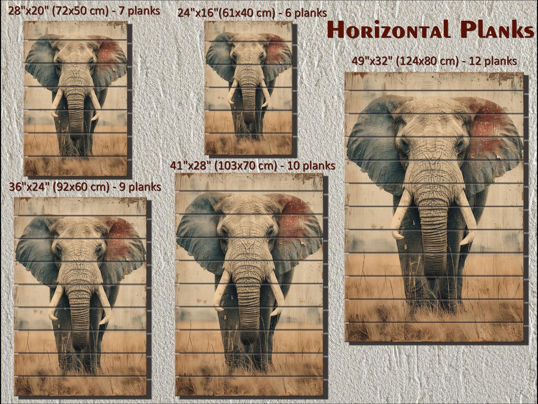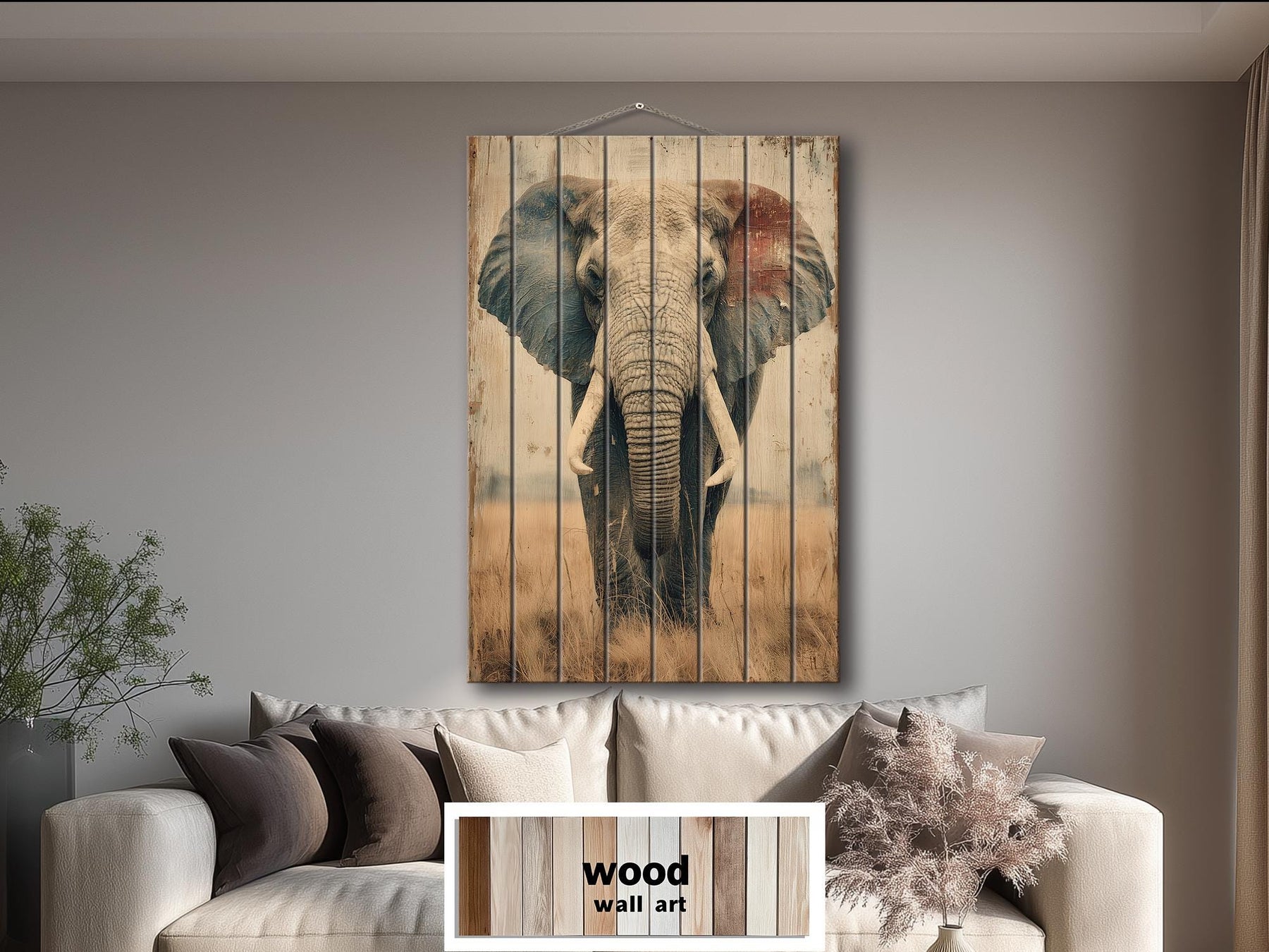 Our African elephant wood wall decor captures the raw strength and majestic presence of one of nature’s most iconic animals, printed in a distressed painting style on new vertical wood planks. The artwork features a powerful African elephant walking directly toward the viewer, its massive form centered in the composition with ears extended and trunk lowered. Dust trails rise subtly behind the animal, as if it has just stepped forward from the savanna into your home. The tusks are prominent, curved and aged, while the textured skin is rendered in thick, rough brushstrokes that amplify its natural toughness. The entire painting appears weathered and vintage, with intentional fading, paint cracks, and scuff effects that simulate age and wear. Despite this visual distressing, the wood is new and smooth, making it sturdy and durable for modern spaces. Vertical plank lines add to the rustic charm, giving the illusion of hand-painted boards while reinforcing the rugged character. The elephant’s gaze is steady and calm, conveying silent dominance without aggression. This design fuses wildlife realism with artistic grit, offering a centerpiece that radiates presence. Bring the wild indoors with this African elephant distressed wall art.
