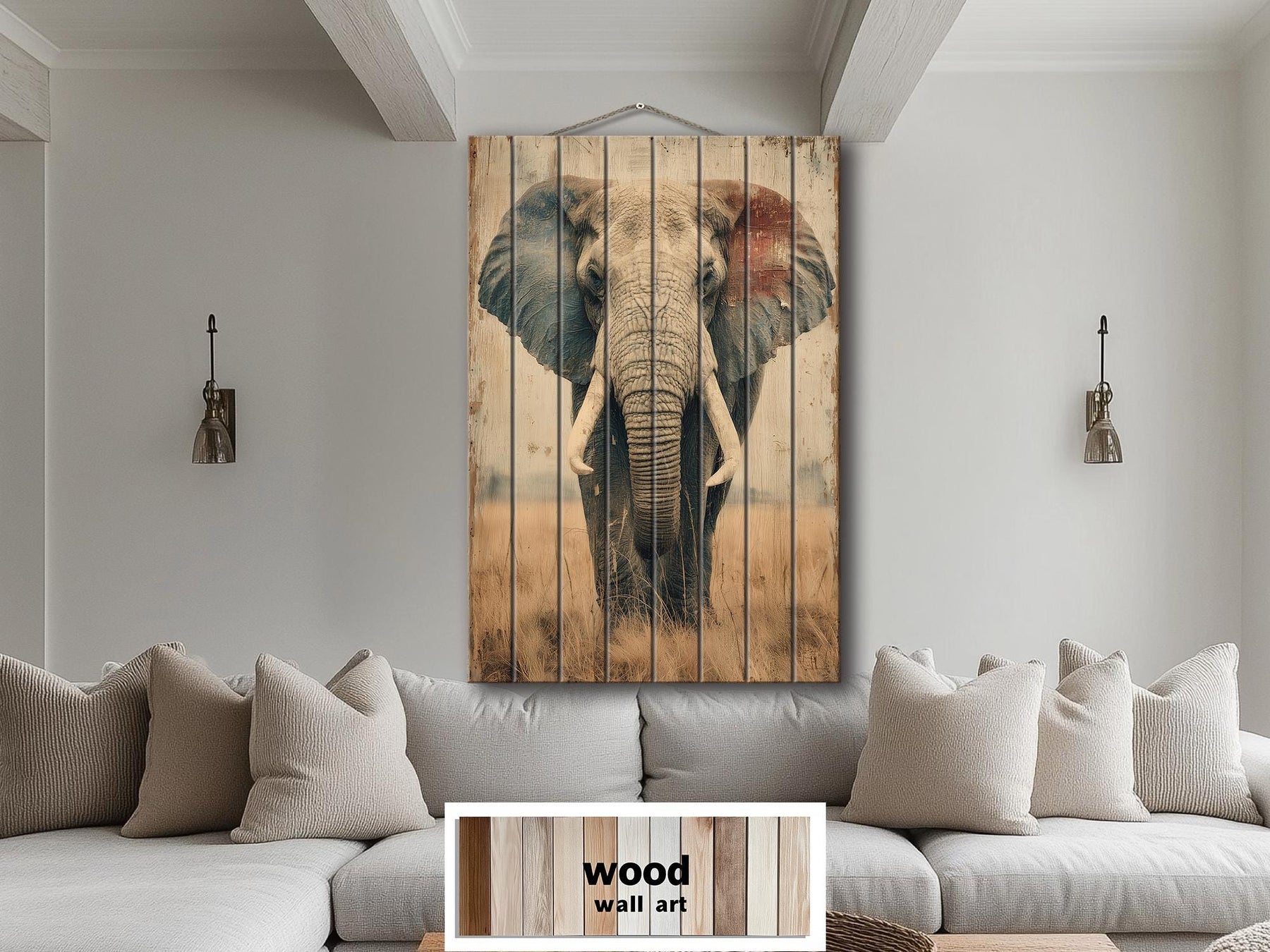 Designed for bold, grounded interiors, this piece is an ideal addition to man caves, dens, and rustic spaces that celebrate strength and heritage. Whether mounted above a fireplace built from stone or paired with dark leather seating, it immediately becomes a commanding focal point. In a man cave surrounded by hunting memorabilia, bourbon shelves, or vintage gear, the elephant fits with primal elegance. The vertical composition works especially well in rooms with tall walls, lodge beams, or barnwood accents. Its rugged texture pairs beautifully with exposed brick, weathered metals, and reclaimed wood. This artwork also suits safari-themed rooms, masculine home offices, or cabins with an African influence. It offers a narrative of calm power and ancient legacy without being flashy or over-stylized. The distressed look complements interiors that lean into raw materials and earthy finishes. It feels at home among heavy textures and simple, enduring materials like wool, stone, or iron. Complete your man cave with this African elephant distressed wood wall art.