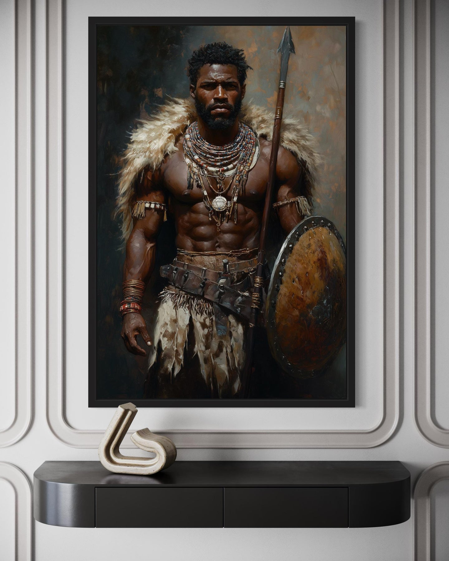 Our African Tribal Warrior wall decor fits seamlessly in homes or personal spaces designed with a masculine or African-inspired theme. It pairs naturally with rich leather furnishings, dark wood furniture, and stone accents, creating a bold and harmonious environment. In a man cave, home office, or study, it commands attention and sparks conversation about culture and courage. The African Tribal Warrior canvas print also complements contemporary lofts where exposed brick and industrial elements highlight its rugged strength. Its striking portrait adds depth and dimension to spaces with earthy tones and textured fabrics, reinforcing a grounded, powerful atmosphere. Art collectors drawn to tribal history will find it an inspiring centerpiece that honors tradition while enhancing modern interiors. Displayed above a fireplace, behind a desk, or on a feature wall, it provides a captivating focal point that unites heritage and style. The combination of detailed craftsmanship and powerful subject matter makes it ideal for anyone curating a room around strength and cultural significance. Every glance at this artwork reveals layers of symbolism and pride that resonate deeply. Our African Tribal Warrior with Shield and Spear masculine canvas wall art concludes as a bold and enduring statement piece for spaces that celebrate history and strength.