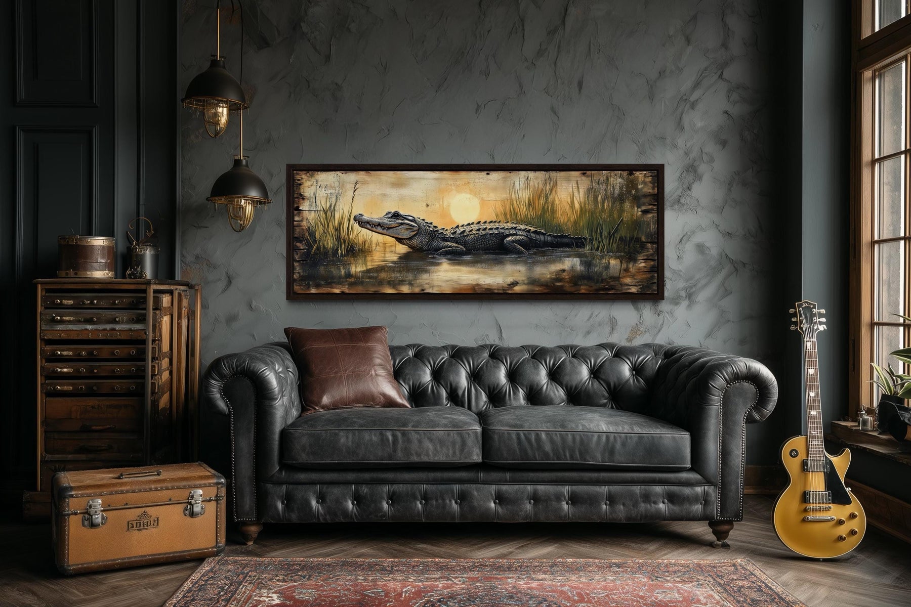 Alligator Wall Art – Marshland Sunset Art | Long Horizontal Wildlife Wall Decor for Men