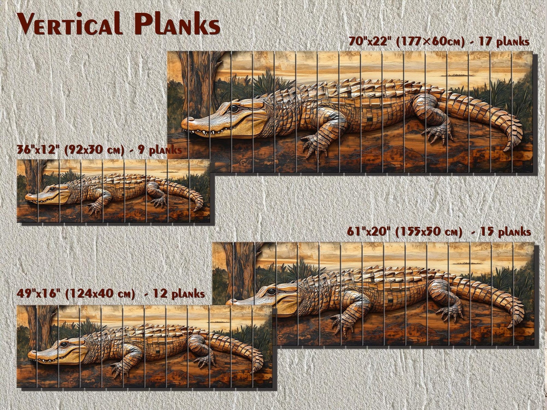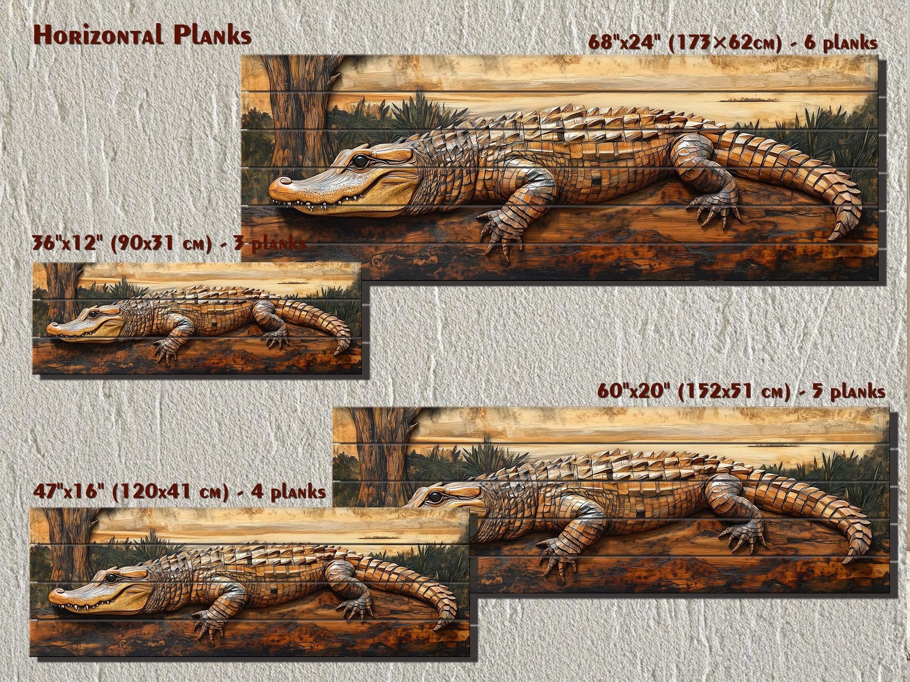 Our alligator rustic distressed wood wall art is printed on new solid wood and stretches across the panel in a powerful horizontal composition where the full length of the reptile rests along textured planks, its scaled body and low profile creating an immediate sense of strength and presence. The detailed rendering of the armored skin, ridged back, and heavy jaw gives the animal a lifelike intensity while the warm, weathered background introduces the character of aged timber without using reclaimed material. Subtle highlights along the spine and head lift the form from the surface and add dimension, making the scene feel carved into the wood rather than simply printed. The elongated layout follows the natural shape of the alligator and turns the artwork into a bold statement piece that visually anchors the wall. A distressed visual treatment moves across the plank lines, reinforcing the rugged man cave aesthetic while the real wood beneath remains smooth, clean, and durable. This reptile lodge wall decor blends wildlife realism with antique rustic styling, giving it the feeling of a collected piece from a backwoods retreat. Earthy tonal transitions in the background keep the focus on the animal while adding depth and atmosphere. The low, horizontal stance of the subject creates a grounded and steady visual rhythm. The overall mood of this alligator artwork is strong, raw, and built for interiors that favor character and substance.