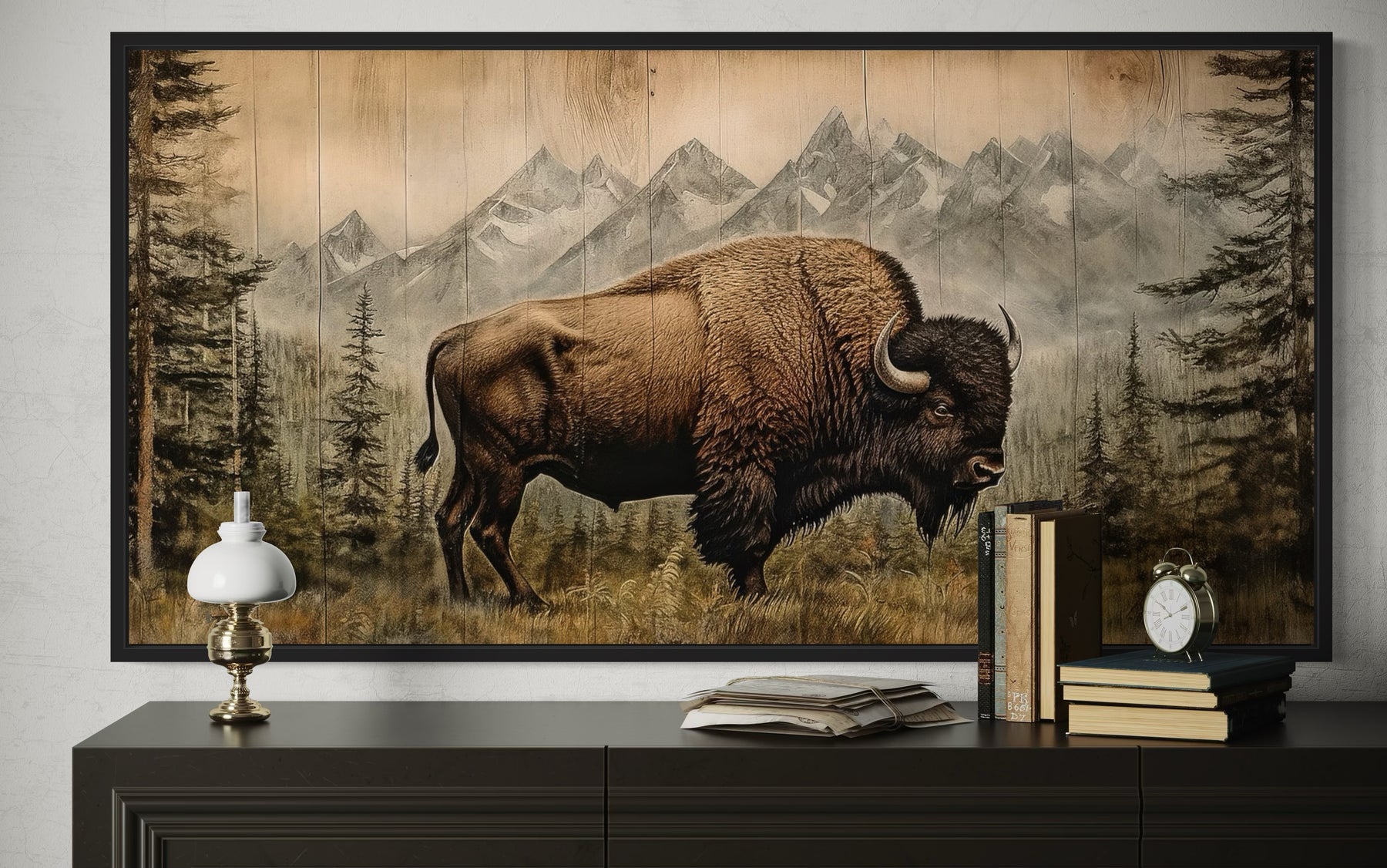 This American bison painting is an ideal choice for homes that value rustic elegance, Western charm, or nature-inspired decor. Its bold design makes it the perfect centerpiece for man caves, adding a commanding presence to walls above leather sofas or wooden furniture. In living rooms or dens, it pairs beautifully with earthy tones and textured accents, creating a cozy yet sophisticated atmosphere. For cabins or lodges, the wood panel effect enhances the natural, outdoorsy vibe, making the artwork feel right at home. This versatile piece also works well in modern spaces that seek a grounding, nature-inspired focal point. Its lifelike details and timeless theme make it a thoughtful gift for wildlife enthusiasts or lovers of the American West. Complete your home with this American bison painting, a stunning tribute to the beauty and power of the wild.