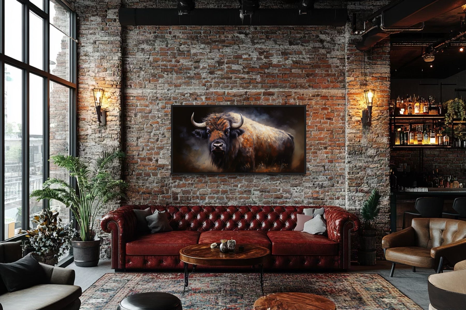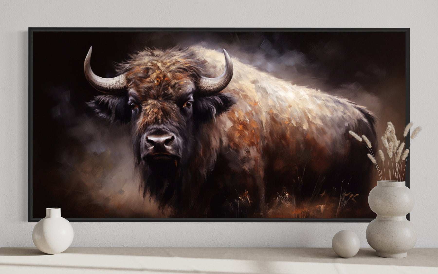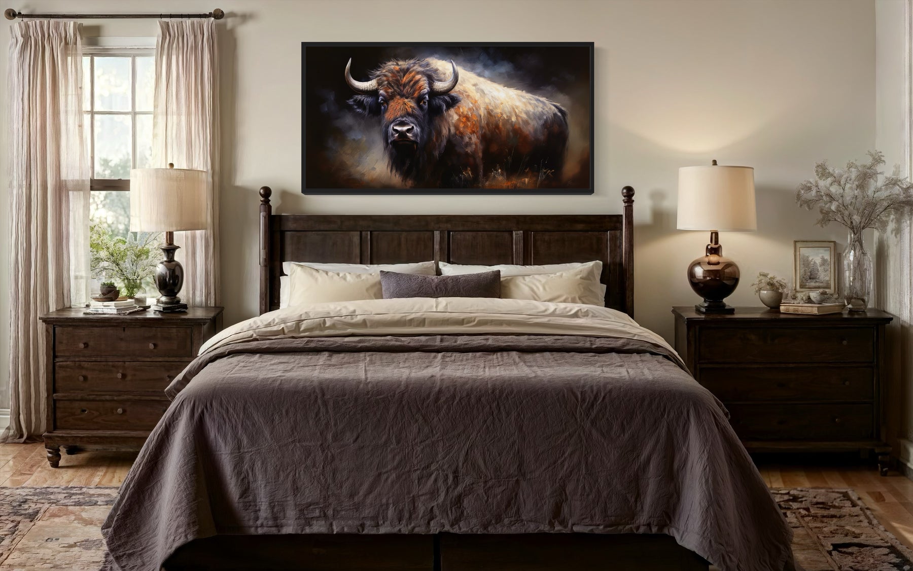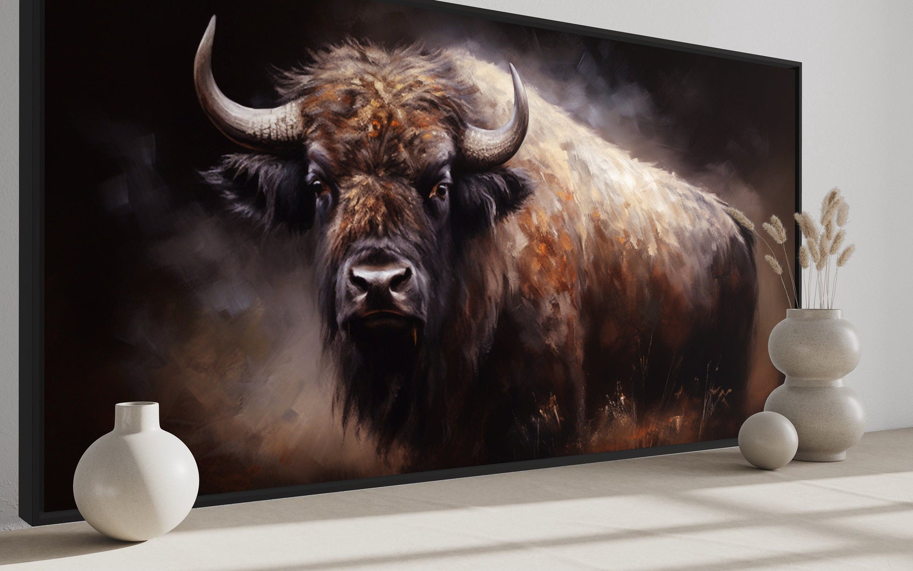The color palette of this buffalo painting is a rich tapestry of earthy browns, deep blacks, and warm tans, reflecting the buffalo's natural surroundings. Hints of muted beige and soft gray create depth, adding dimension to the rugged texture of the animal and its environment. The background contrasts beautifully with the bold, dark tones of the buffalo, allowing the figure to stand out dramatically. These organic colors bring warmth and grounding to any room, making the piece feel both inviting and powerful. The subtle gradients of light and shadow enhance the realism, giving the artwork a lifelike presence. This harmonious palette complements rustic, industrial, or even minimalist decor styles. Whether paired with wooden furniture or modern accents, this buffalo painting adds a timeless touch. Let the warm tones and dynamic contrasts of this piece transform your space into a celebration of nature’s elegance.