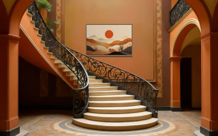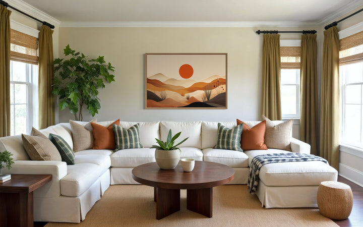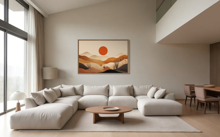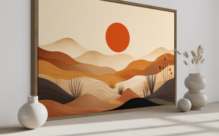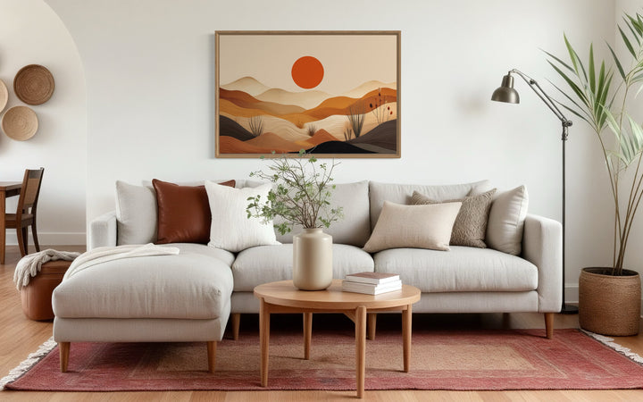 Our Arizona desert boho landscape southwestern canvas wall art evokes the serene beauty of rolling desert vistas. This captivating artwork features warm earth tones, rolling hills, and a radiant sun, blending modern boho aesthetics with a timeless southwestern charm. The abstract composition adds a contemporary edge while maintaining a deep connection to nature. Perfect for those who love desert-inspired decor, this piece draws you into a tranquil desert escape. Its minimalist design and harmonious color palette enhance its versatility, making it a standout addition to any room. Whether adorning a living room, bedroom, or study, this wall art creates an inviting and stylish atmosphere. Its combination of simplicity and elegance brings a touch of desert tranquility to your home. Let the Arizona desert boho canvas wall art infuse your space with warmth and serenity.