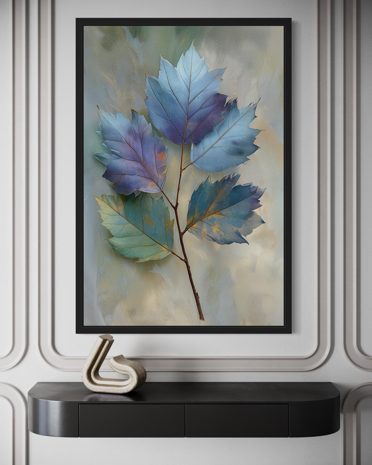 The Autumn Blue Leaf Botanical wall art unfolds with a palette that blends cool serenity and gentle warmth. Layers of soft sapphire and deep cobalt establish a strong foundation of crisp autumn blue. Gentle turquoise and teal create highlights reminiscent of early-morning light filtering through fall foliage. Muted emerald and soft sage add a subtle earthiness that keeps the design grounded in nature. Hints of dusty rose and faint amber warm the composition, evoking the quiet transition of seasons. A background of creamy ivory and faint gray provides airy contrast, letting each leaf stand out with sculptural clarity. This careful balance of hues makes the artwork glow in natural light and radiate richness under evening illumination. Fade-resistant inks keep every shade true, ensuring long-lasting brilliance. The harmonious interaction of blue and green tones with soft neutrals calms the senses while enriching the room’s visual depth. With each glance, the Autumn Blue Leaf Botanical canvas print reveals new layers of color and quiet autumn poetry.