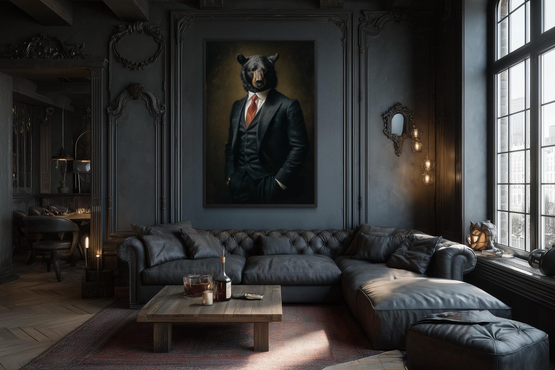 A framed canvas painting of a bear in a formal suit hangs in a dark, masculine living room.