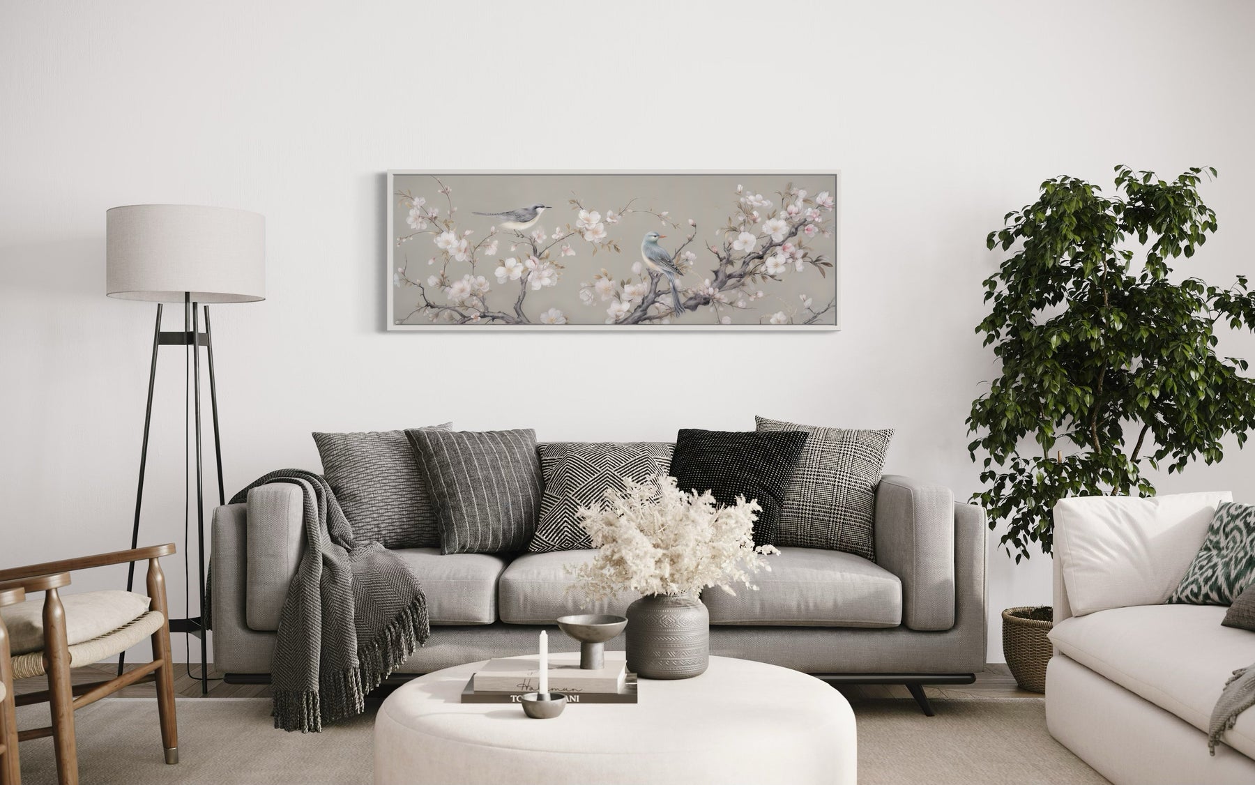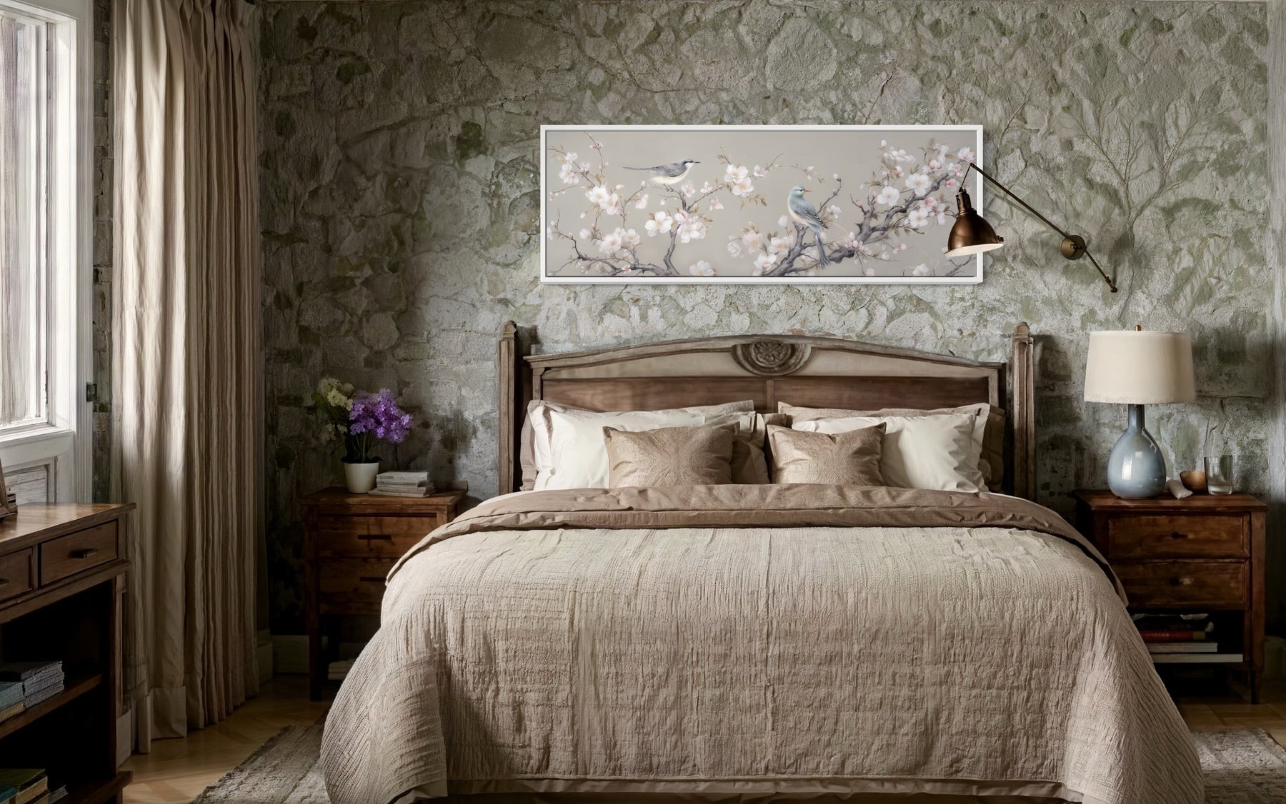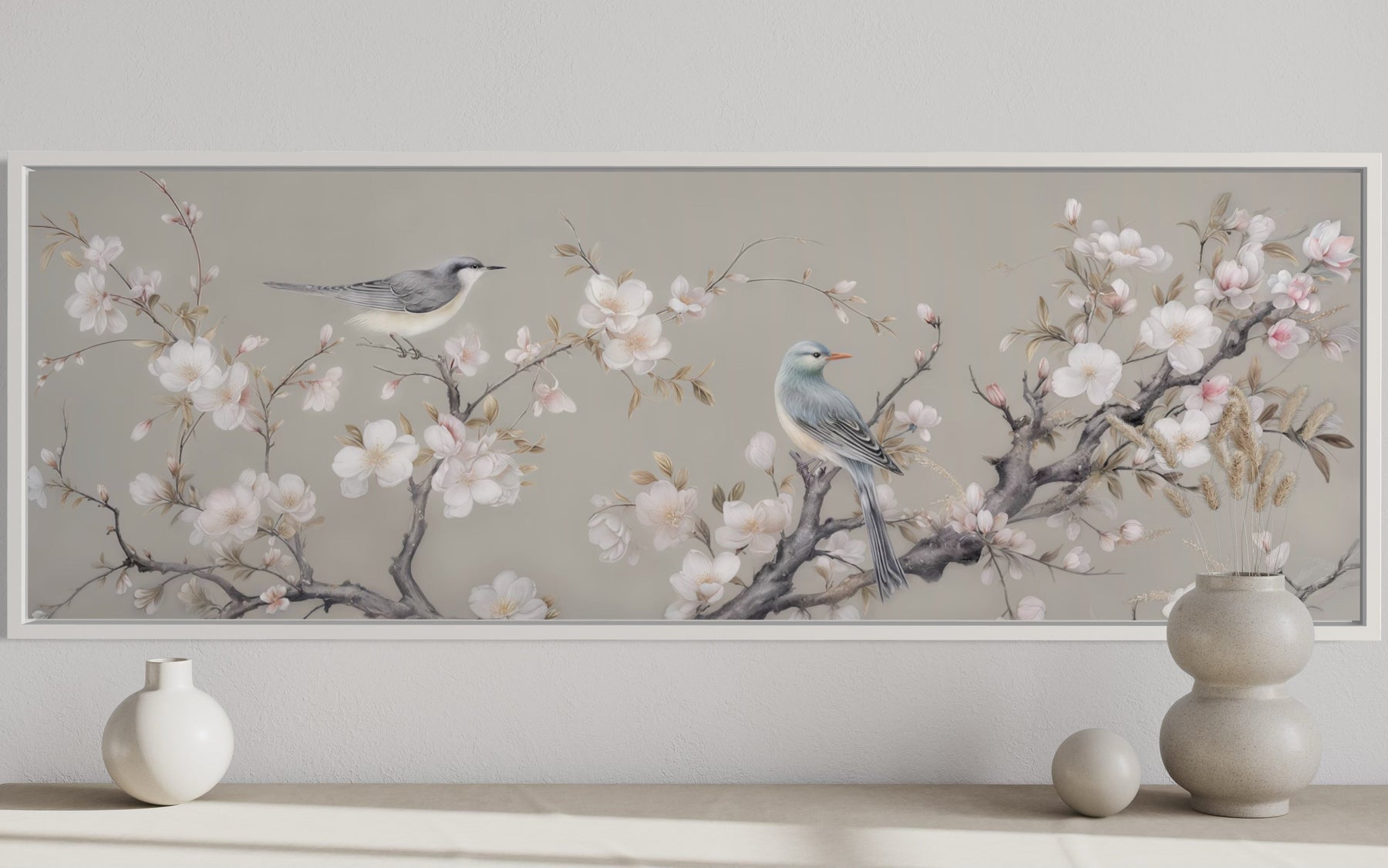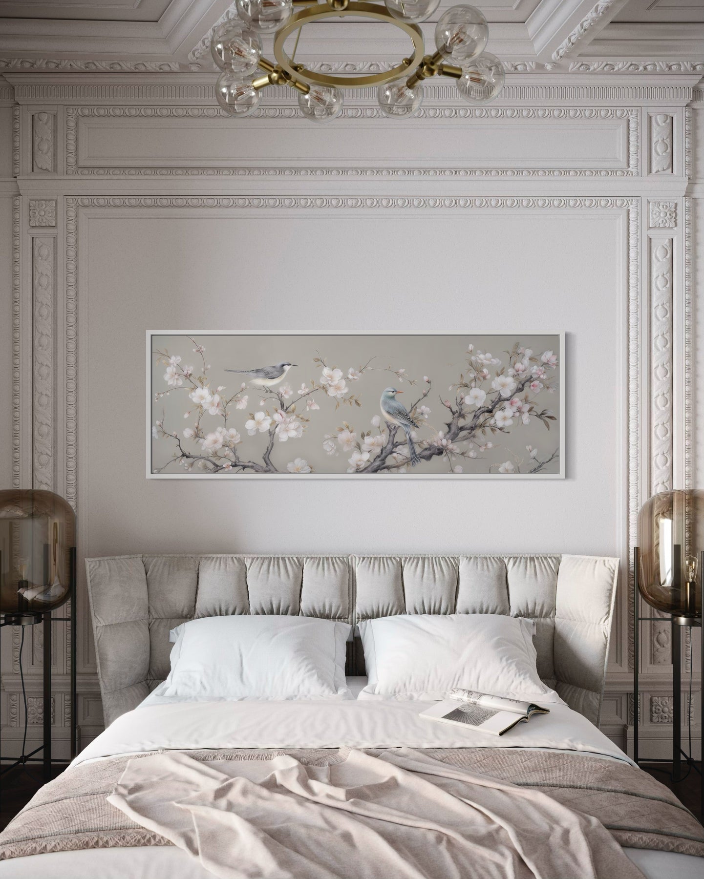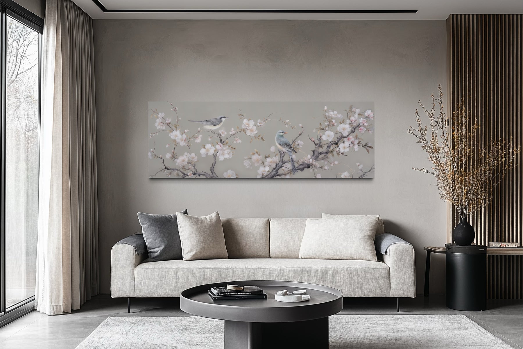 This birds on branch wall art fits perfectly into homes with a minimalist, nature-inspired, or contemporary aesthetic. Its horizontal layout makes it a great choice for above-bed decor, where it adds a touch of elegance without overwhelming the room. Nature lovers will adore how this piece brings the outdoors into their living spaces, making any room feel more grounded and serene. It's equally stunning when placed in living rooms, dining areas, or even hallways, where it becomes a calming focal point. The artwork's soft tones and natural elements make it versatile enough to complement a range of interior styles, from rustic to modern. Whether you're looking to add a finishing touch to your nature-themed home or seeking a gentle, peaceful piece to round out your decor, this blossoming branch painting is an ideal choice. Its delicate details and horizontal orientation make it a perfect fit for long walls and narrow spaces.