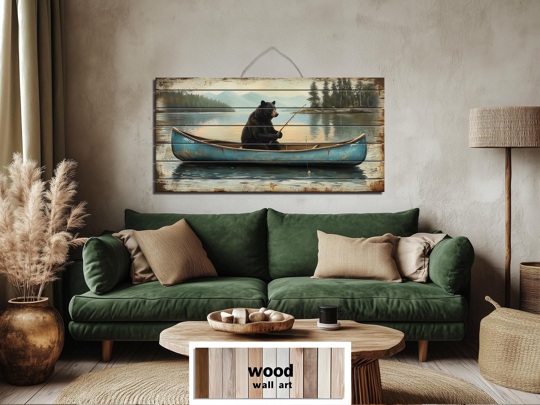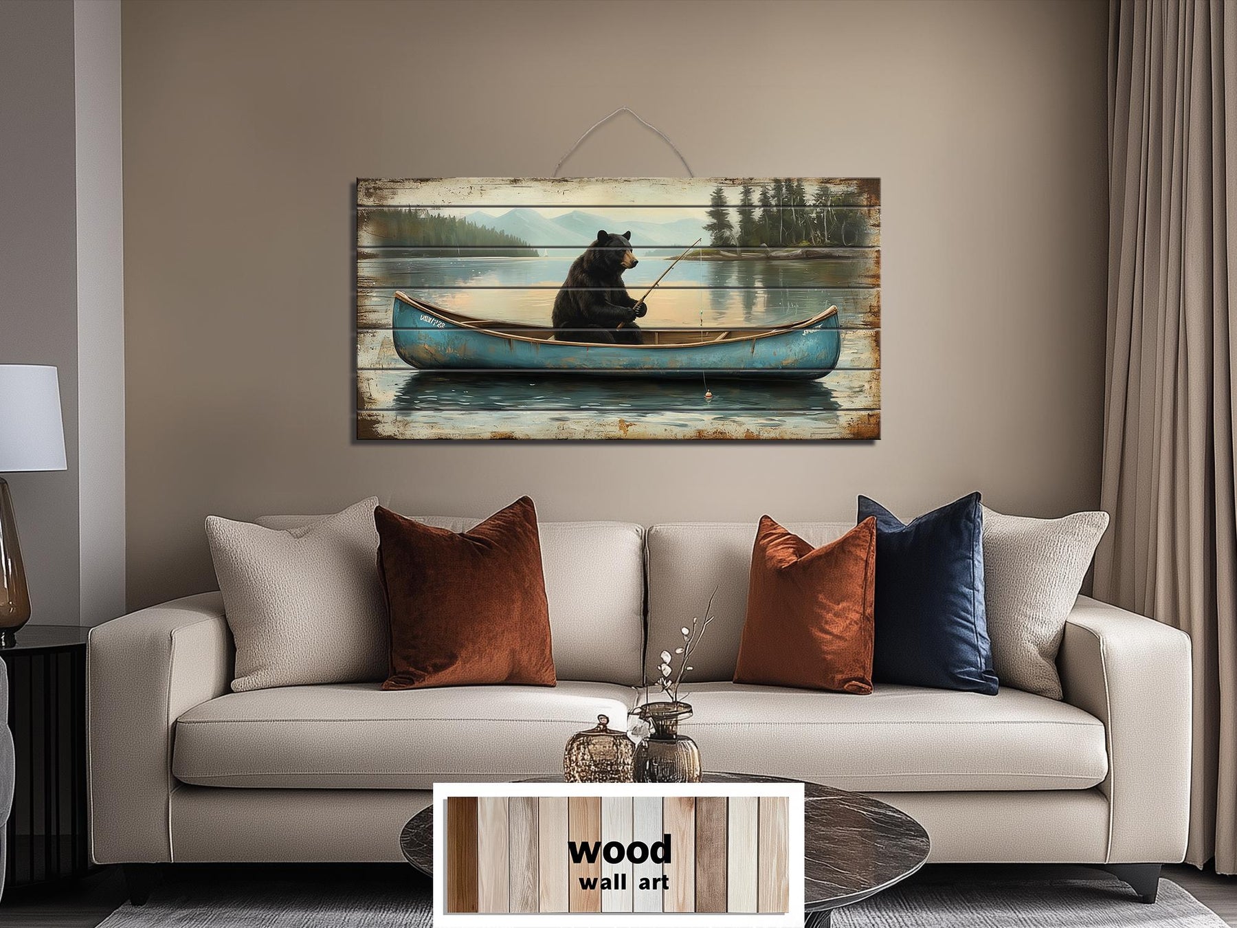 This rustic wall art is an ideal addition to a cozy cabin retreat or a lakeside getaway, especially where nature and personality shape the space. It fits seamlessly into homes that celebrate outdoor living, fishing culture, or wilderness humor, making it a perfect match for cabins, lodges, or fishing camps. In a man cave filled with antique rods, taxidermy mounts, and vintage tackle signs, it adds warmth and a narrative spark. The piece also complements bedrooms outfitted with plaid flannel, antler decor, and pinewood accents, where the scene reinforces a lived-in, natural aesthetic. In great rooms with river rock fireplaces and leather seating, the print provides a softer, more playful counterpoint to rougher textures. Even in modern rustic homes with shiplap walls and matte metal fixtures, this artwork introduces organic imagery that feels both authentic and intentional. The humorous twist of the bear fishing adds personality to a space, making it more than just decorative—it becomes a story. Its size and shape make it an excellent choice for mounting over a bed, sofa, or wood stove, where wide walls benefit from structured imagery. For lovers of the forest, the lake, and a touch of humor, this piece balances warmth with wilderness. Complete your cabin decor with this black bear in blue canoe wall art.