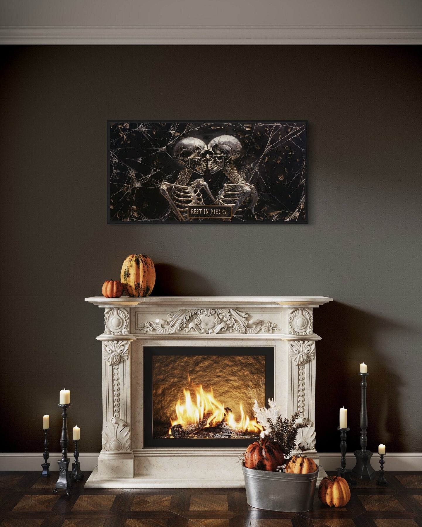 Infuse your home with a hauntingly elegant touch this Halloween season with this black and white skeleton wall art. Featuring a bold depiction of skeleton skulls accented by a chilling "Rest In Pieces" plaque, this artwork evokes the timeless allure of gothic aesthetics. Its intricate details and dark, moody vibe make it perfect for creating an atmosphere of mystery and intrigue. Designed to be a captivating centerpiece, this wall art effortlessly complements seasonal decorations or stands alone as a dramatic statement. Whether you're transforming your living room, fireplace mantel, or entryway, this piece exudes a sophisticated yet spooky charm. Ideal for those who appreciate the darker side of art, it offers a refined way to celebrate the Halloween spirit. Add a layer of intrigue to your decor with this striking skeleton wall art, perfect for elevating your space during the Halloween season.
