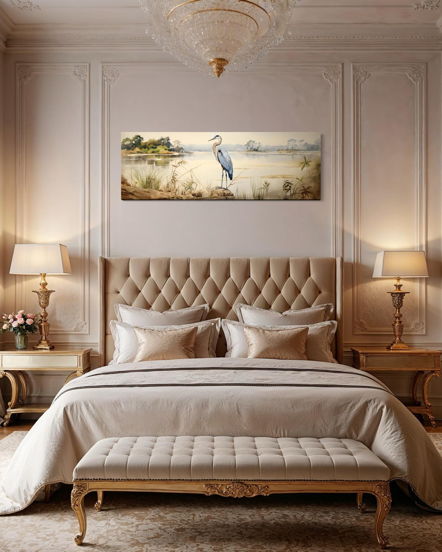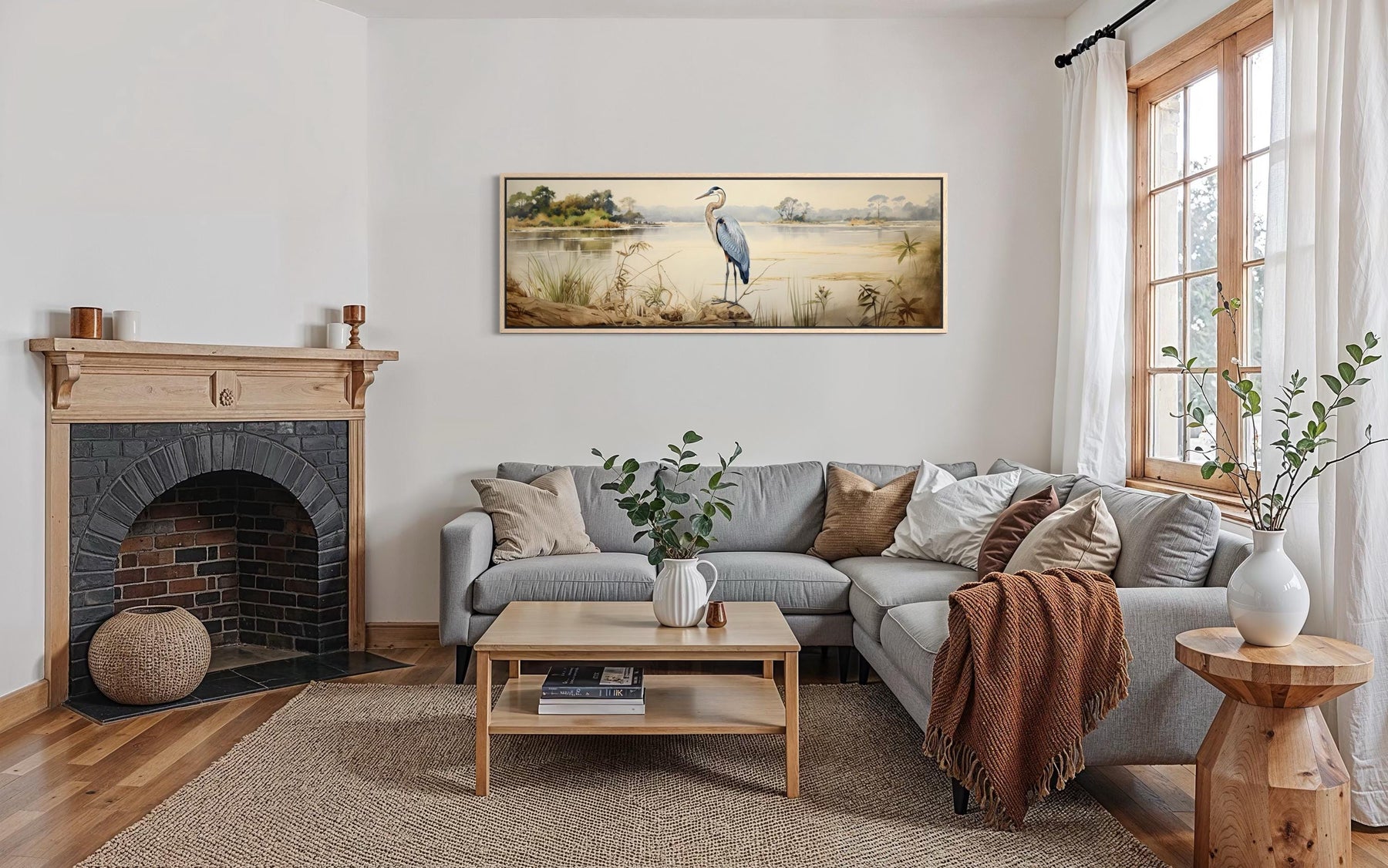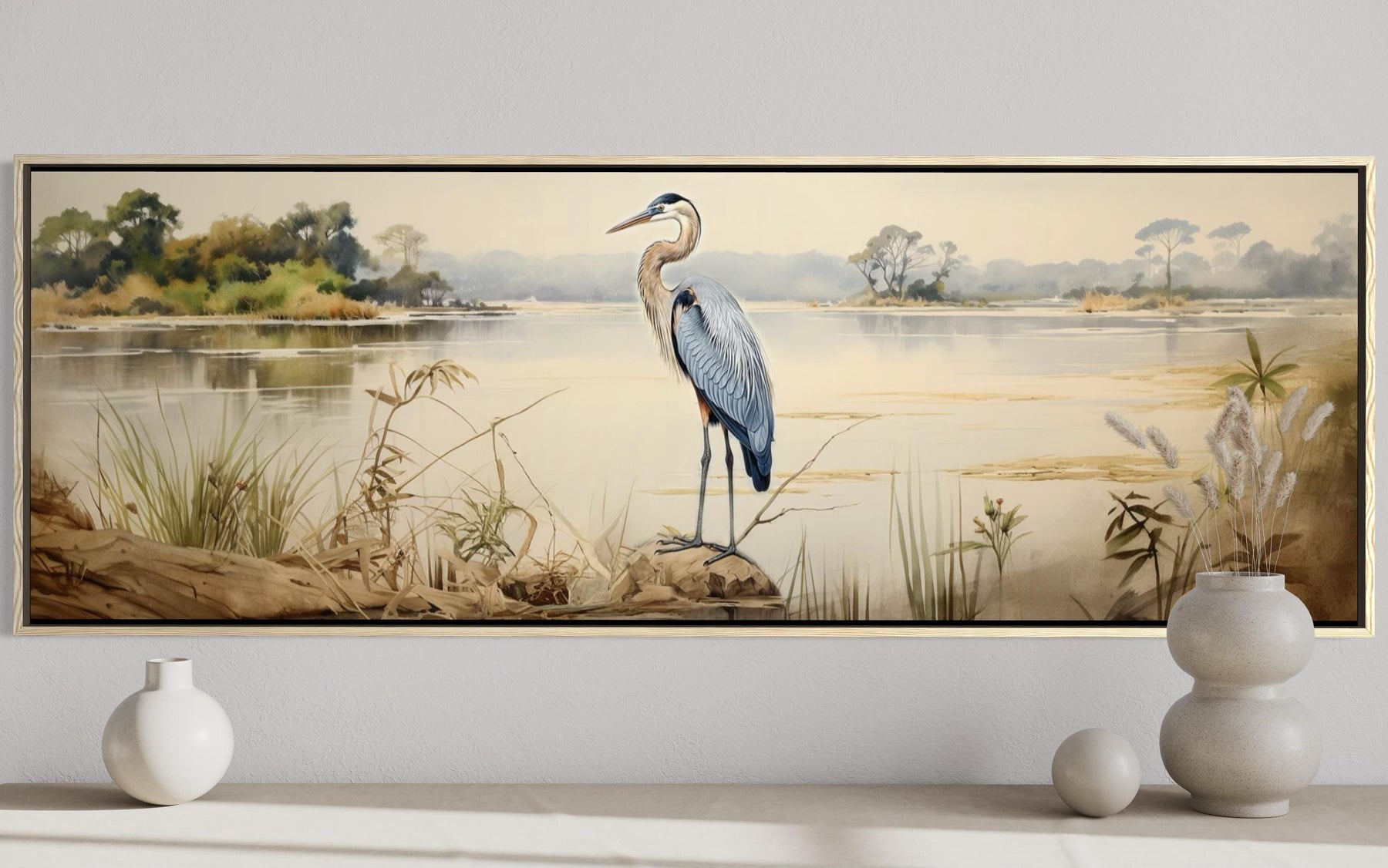 This Blue Heron by the Lake artwork is ideal for coastal, modern farmhouse, and contemporary homes that value softness, simplicity, and nature-inspired refinement. Its long horizontal shape makes it the perfect choice for placement above a sofa, bed, or mantel, filling wide wall spaces with peaceful elegance. In coastal interiors, it harmonizes beautifully with sandy neutrals, driftwood accents, and linen textures, bringing the calm of shorelines indoors. In modern farmhouse spaces, its muted color scheme complements rustic wood tones, woven materials, and neutral palettes, grounding the décor in organic tranquility. For minimalist homes, its clean lines and atmospheric tones create a sense of airiness, expanding the visual space while maintaining warmth. Its balanced design fits equally well in bedrooms, living rooms, or open dining areas where calm ambiance is desired. The painting’s subtle detail allows it to blend with both traditional and modern aesthetics, serving as a timeless reminder of nature’s still beauty. Its panoramic layout encourages relaxation, reflection, and breathing space within any environment. This Blue Heron by the Lake Long Horizontal canvas wall art brings a touch of quiet grace, balance, and sophistication to any room inspired by the harmony of nature.