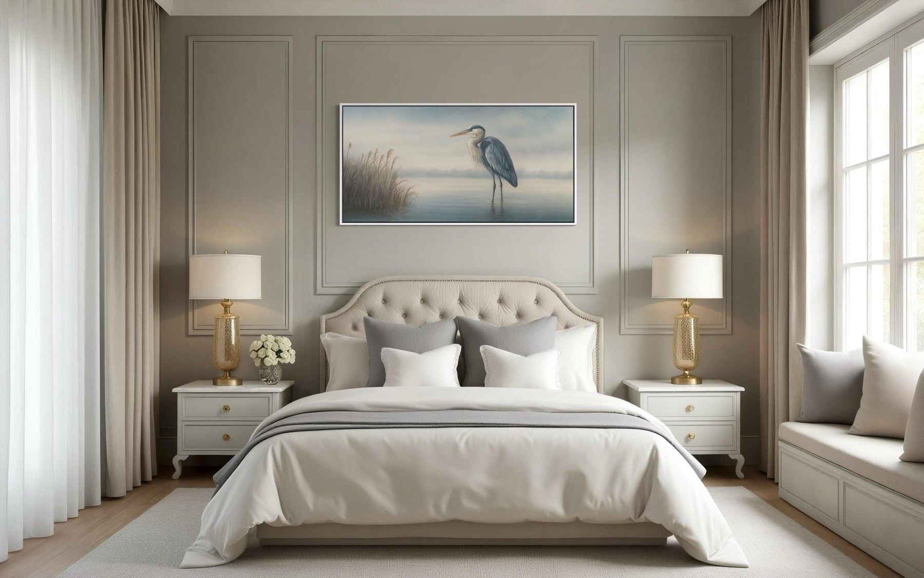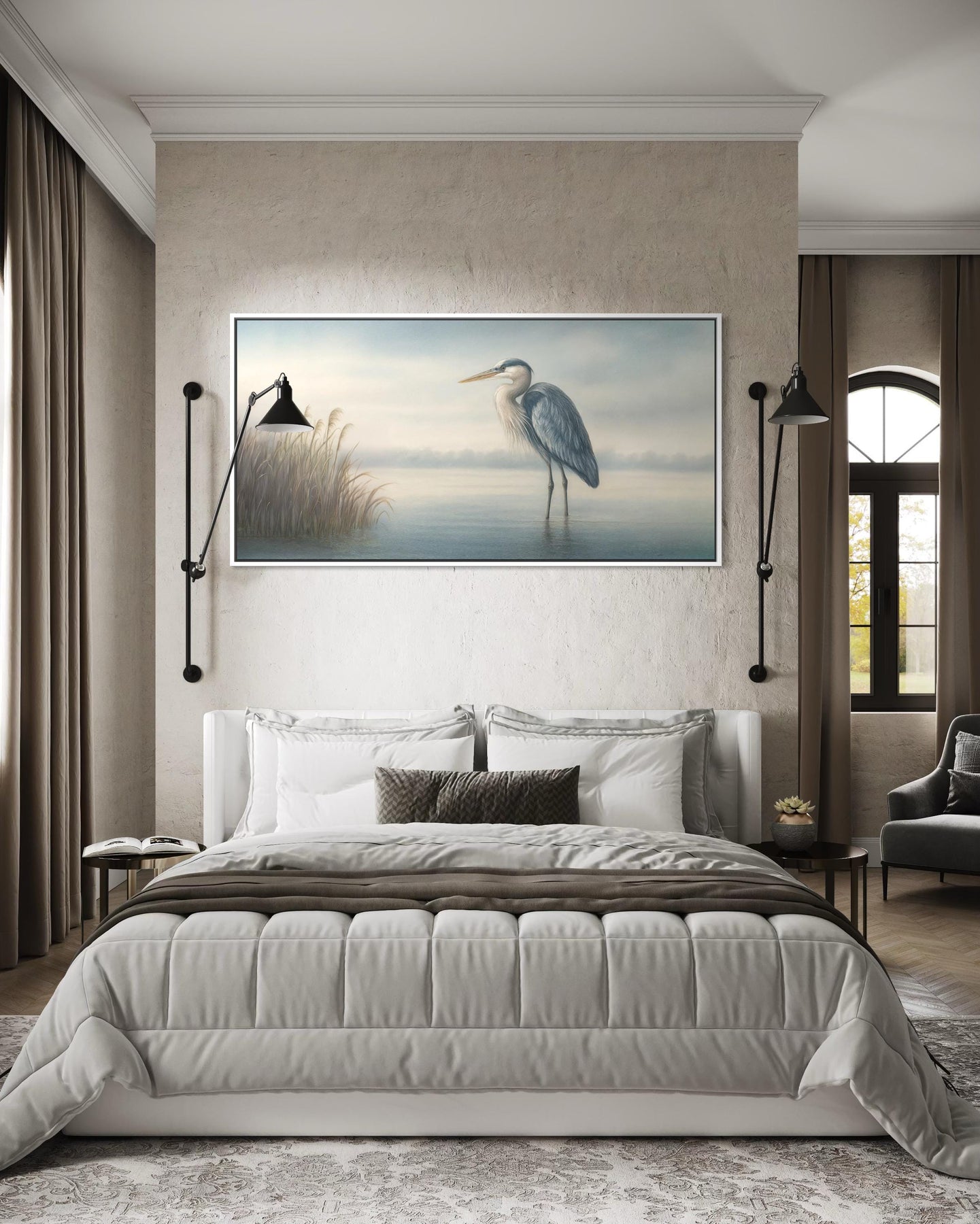 This Blue Heron in Misty Lake artwork is ideal for coastal, minimalist, or contemporary homes that value calmness, light, and refined simplicity. In coastal interiors, it pairs beautifully with soft linen tones, driftwood accents, and ocean-inspired textures, echoing the stillness of seaside mornings. In modern homes, it complements clean lines and monochrome décor, adding warmth and depth without disrupting the aesthetic balance. The framed design lends sophistication suitable for living rooms, bedrooms, or spa-inspired bathrooms seeking quiet luxury. Its tranquil imagery creates a natural focal point above sofas, beds, or mantels, filling the room with a sense of light and space. In minimalist environments, it serves as a meditative centerpiece—gentle, contemplative, and perfectly composed. The subtle color palette and airy composition make it equally fitting for office spaces, reading corners, or guest rooms designed to evoke serenity. Its refined frame and timeless subject matter ensure it harmonizes with both rustic textures and sleek modern finishes. This Blue Heron in Misty Lake Framed canvas wall art brings peaceful sophistication to any home, inviting viewers to pause, breathe, and experience the still beauty of nature’s quiet moments.