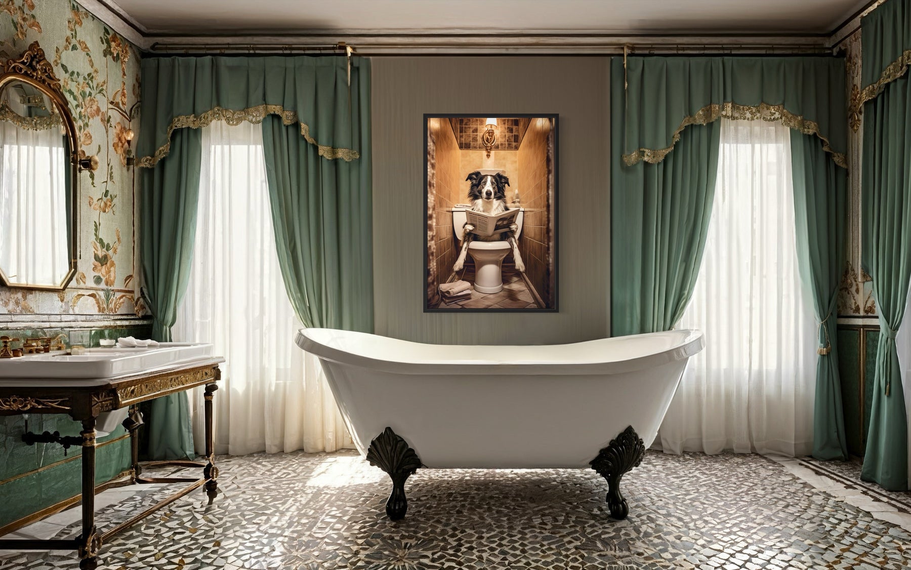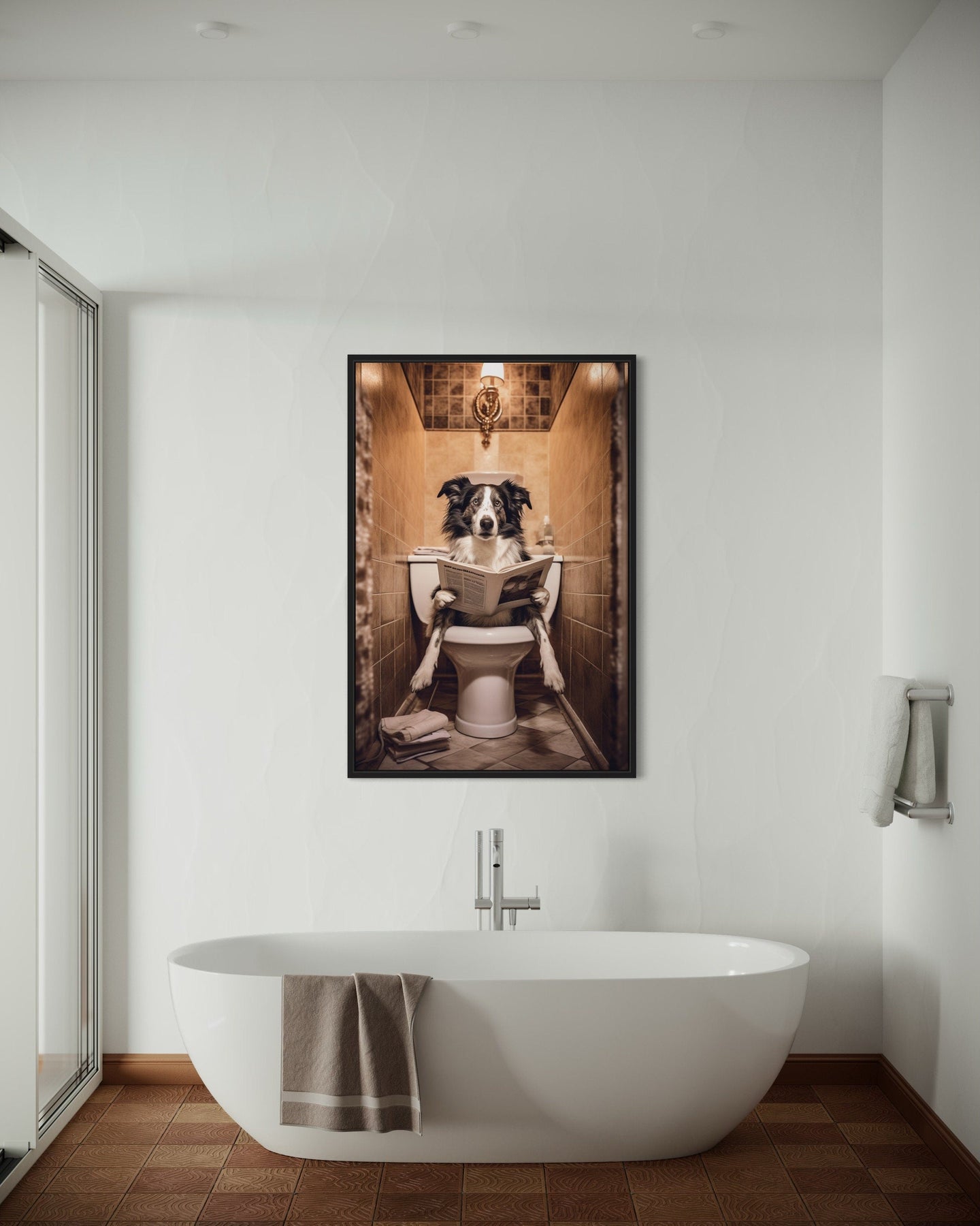 This Border Collie on the toilet picture delivers the perfect mix of humor and charm for your bathroom decor. The detailed artwork depicts a thoughtful Border Collie sitting on a toilet, deeply engaged in reading a newspaper. With its playful concept and realistic illustration, this piece adds an unexpected and delightful twist to any bathroom. The Border Collie’s attentive expression, combined with the unique setting, creates a whimsical vibe that's bound to bring smiles. This wall art is designed as a high-quality canvas print, ensuring durability and a professional finish. The artwork seamlessly blends rustic and modern styles, making it versatile yet eye-catching. Perfect for pet lovers and anyone who appreciates quirky home decor, this Border Collie dog painting is a fun conversation piece.