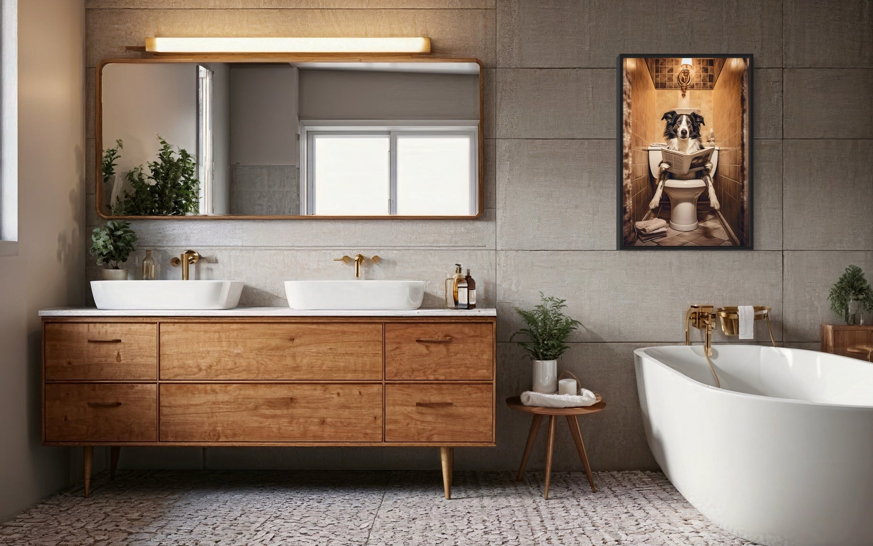 This Border Collie dog canvas wall art is the ideal addition to rustic, farmhouse, or eclectic-style bathrooms. Its playful theme and warm color palette make it a great fit for pet-friendly homes and spaces with a touch of humor. It pairs wonderfully with wooden accents or contemporary fixtures, offering a balance of character and charm. This art is especially fitting for guest bathrooms, where its quirky design can entertain visitors and spark conversation. It also complements modern homes with a fun and casual vibe, adding personality to minimalistic settings. Perfect for dog lovers, this piece celebrates the Border Collie’s intelligence and charm in a lighthearted way. Whether for your main bathroom or a powder room, this Border Collie on the toilet artwork transforms the space into a delightful retreat.
