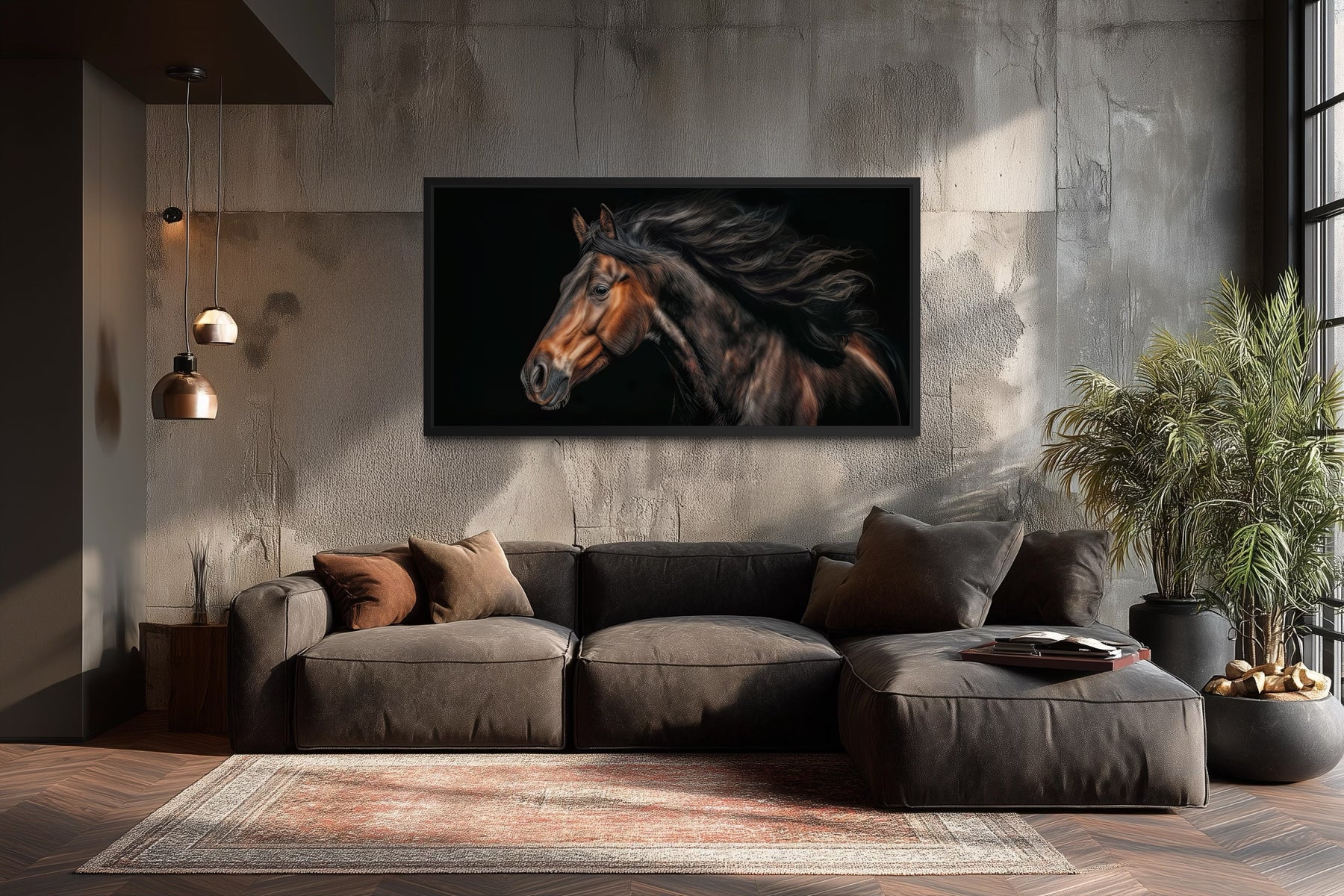 The color palette of this framed wall decor blends natural richness with dramatic contrast, creating an atmosphere of warmth and depth. Shades of deep brown and chestnut dominate the composition, enhanced by soft gradients of amber and bronze that capture the sheen of the horse’s coat under gentle light. The background consists of textured black and charcoal tones, adding intensity and focus to the central subject while creating a sense of quiet power. Subtle touches of warm gray and muted beige provide balance, preventing the darker tones from overwhelming the viewer. The earthy palette evokes both nature and refinement, making it perfect for interiors that lean toward rustic, Western, or modern-industrial themes. The interplay of light and shadow adds dimension, producing a moody yet sophisticated tone that adapts beautifully to changing light throughout the day. Each color transition is meticulously printed to preserve the original painting’s nuance, from the horse’s golden highlights to the deep reflections in its eyes. The harmonious mix of warm and dark hues radiates comfort while maintaining a strong visual presence. This carefully controlled palette ensures that the artwork stands out without clashing with other decor elements. The result is a timeless, balanced composition that enriches any wall with understated drama and enduring charm through this brown horse wall art.
