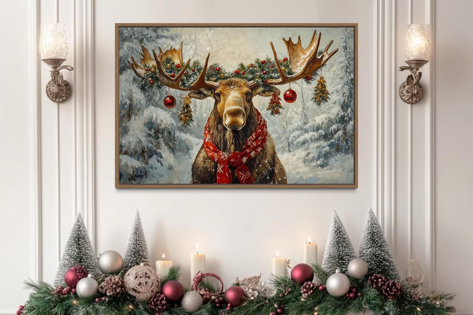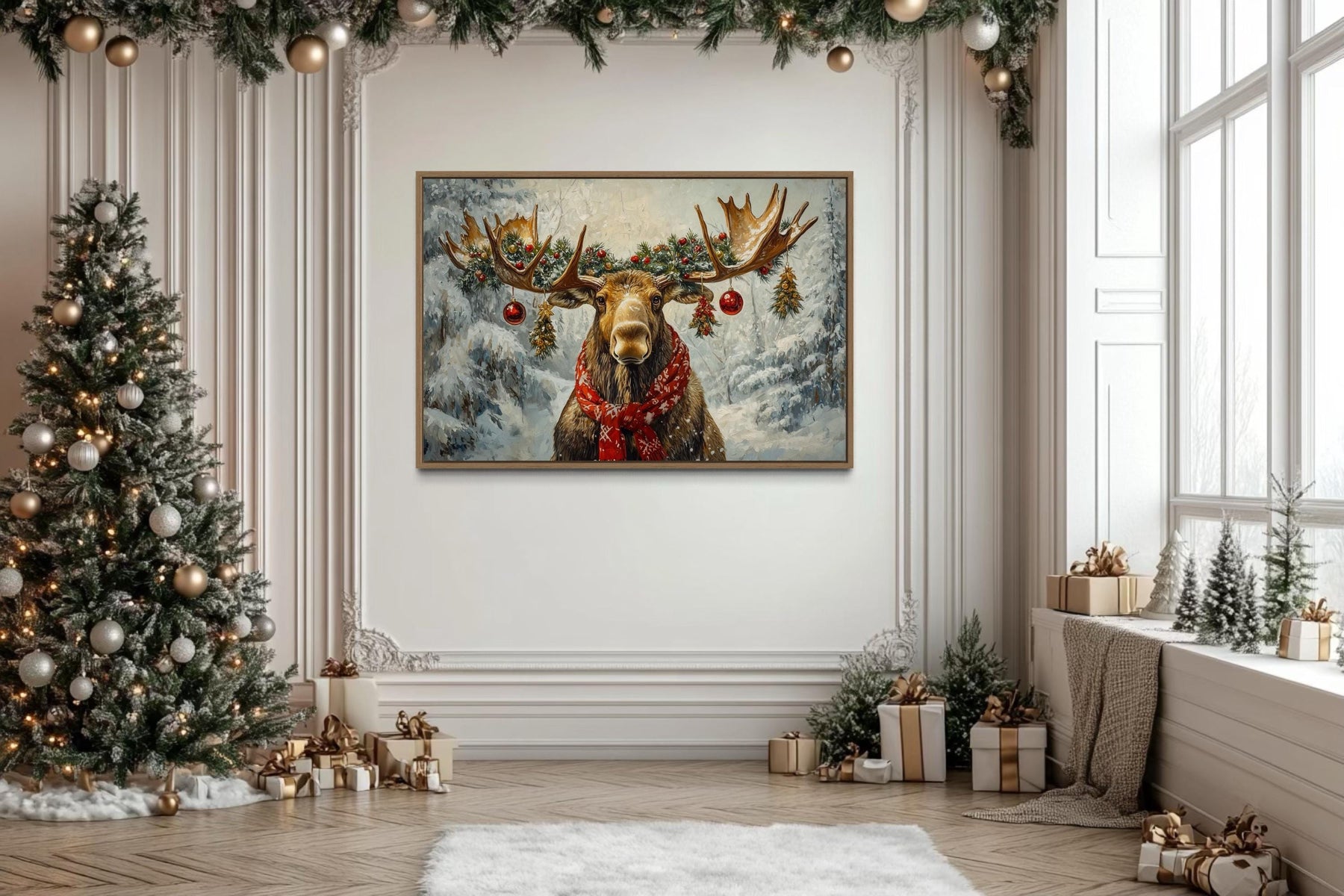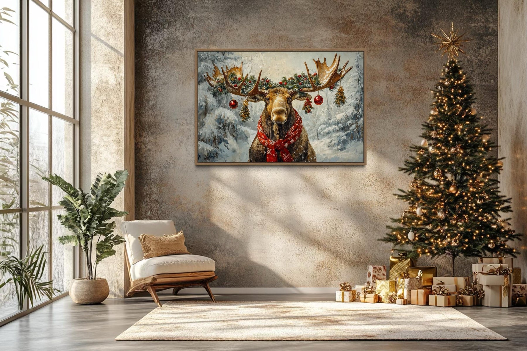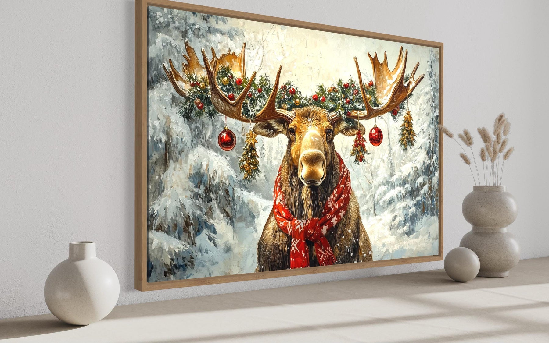 Our Christmas Moose With Red Scarf And Ornaments canvas wall art delivers playful charm and festive warmth to holiday decorating. This cheerful Christmas painting captures a friendly moose wearing a bright red scarf, its antlers decorated with sparkling ornaments and tiny lights, creating a heartwarming winter scene. Printed as a high-quality canvas print, it brings every brushstroke of snowflakes and frosty background to life, adding depth and seasonal delight. The design is filled with whimsical details that invite smiles and spark conversation, making it a memorable Christmas wall decor centerpiece. Perfectly sized for living rooms, hallways, or dining spaces, it blends rustic woodland character with joyful Christmas energy. The moose’s gentle expression and charming pose symbolize the peaceful magic of winter celebrations. Whether part of a holiday gallery wall or displayed as a stand-alone statement piece, it captures the wonder of the season with enduring beauty. This canvas wall art becomes an instant favorite that returns to your home year after year to brighten the holidays. Our Christmas Moose With Red Scarf And Ornaments canvas wall art is a delightful celebration of nature and Christmas joy.