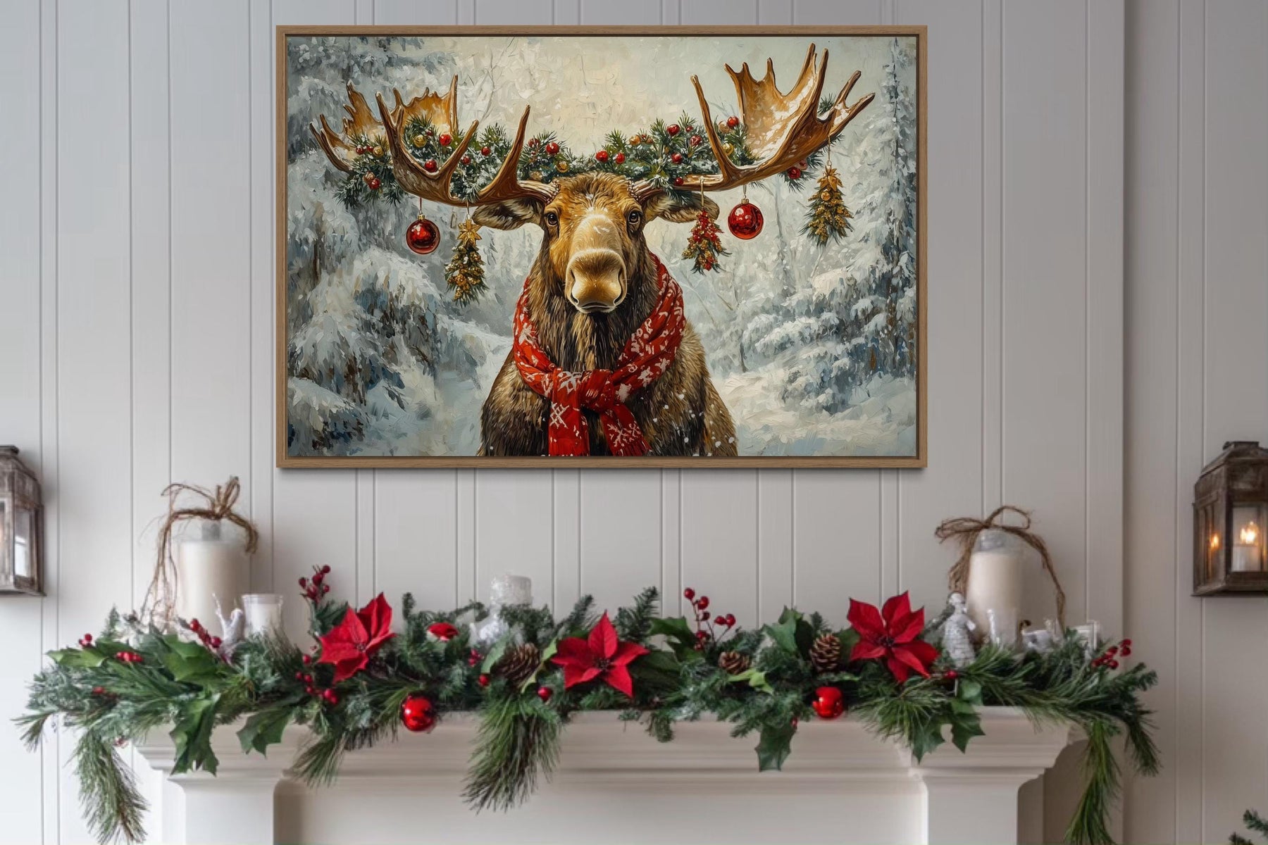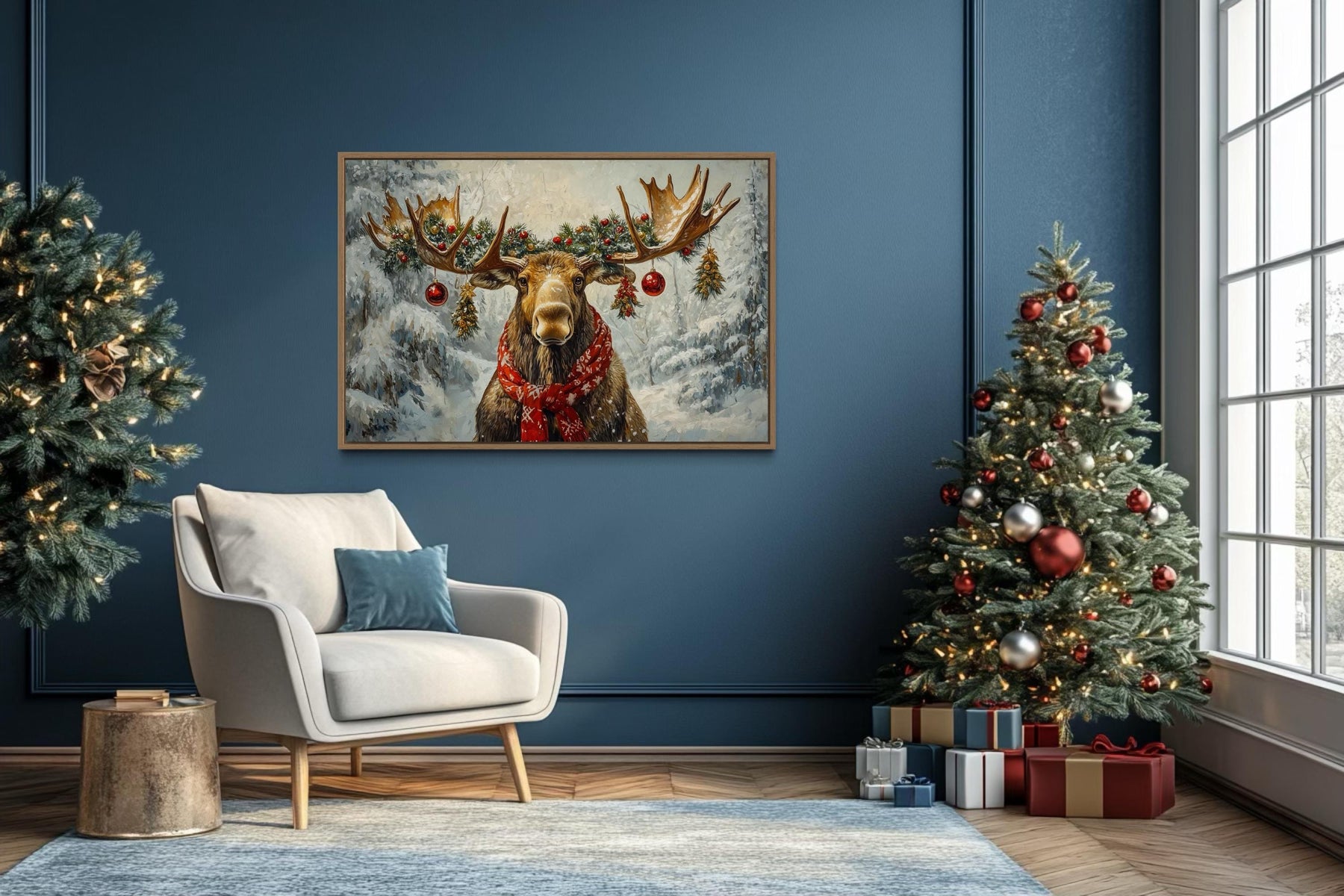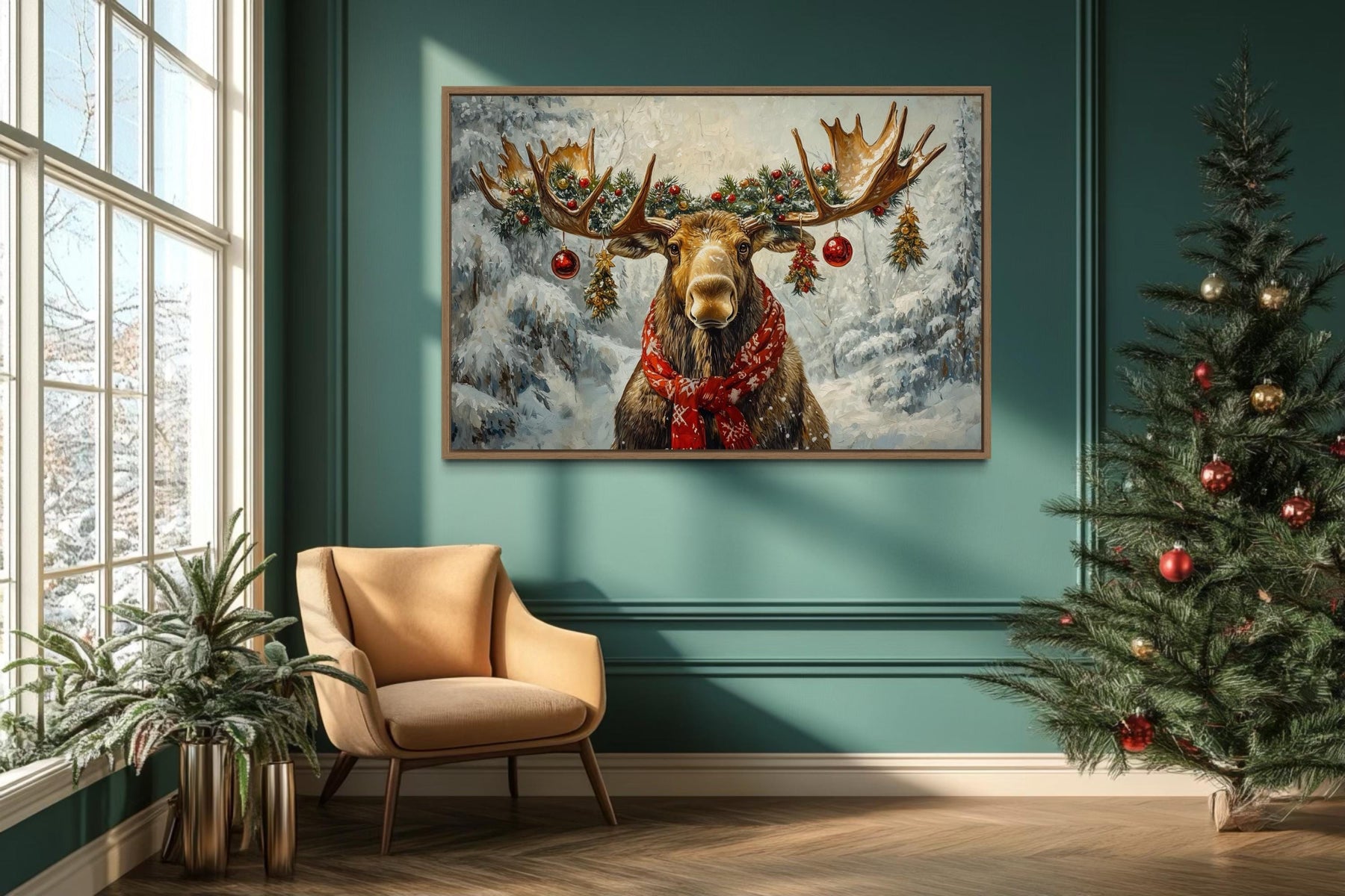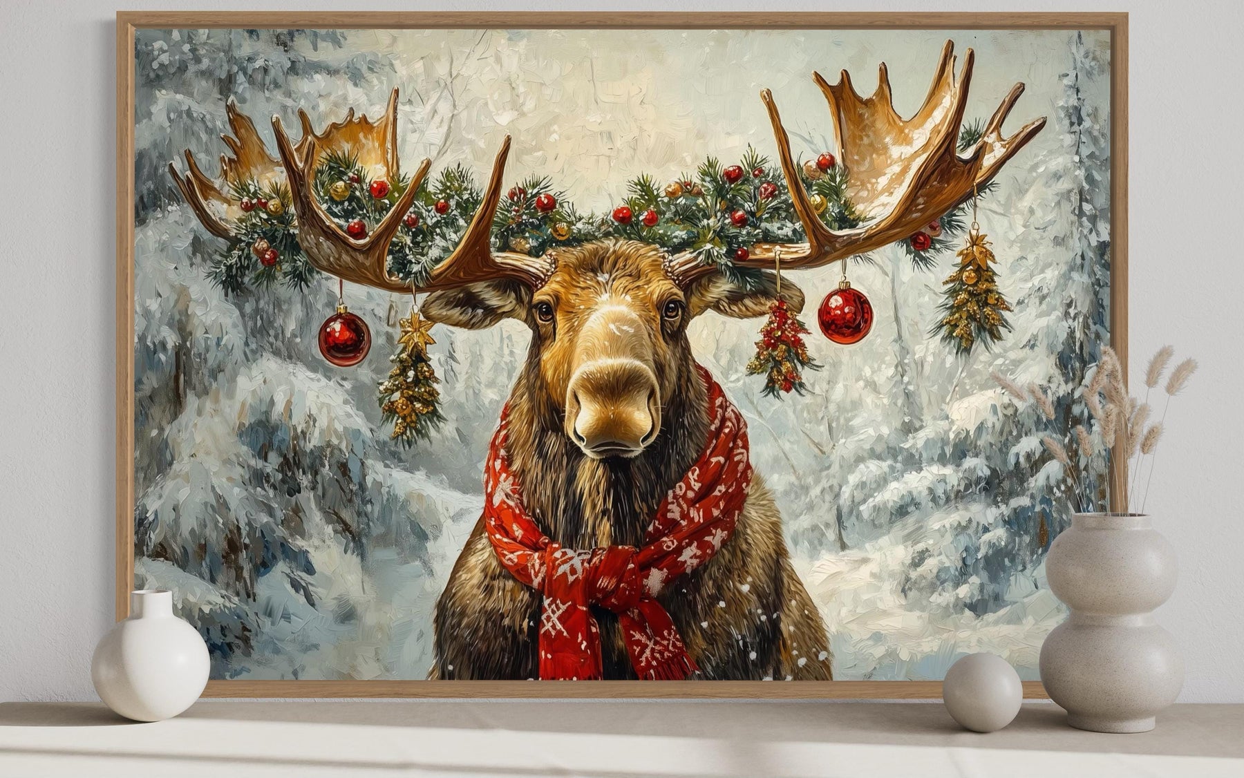 Our Christmas Moose With Red Scarf And Ornaments canvas wall art delivers playful charm and festive warmth to holiday decorating. This cheerful Christmas painting captures a friendly moose wearing a bright red scarf, its antlers decorated with sparkling ornaments and tiny lights, creating a heartwarming winter scene. Printed as a high-quality canvas print, it brings every brushstroke of snowflakes and frosty background to life, adding depth and seasonal delight. The design is filled with whimsical details that invite smiles and spark conversation, making it a memorable Christmas wall decor centerpiece. Perfectly sized for living rooms, hallways, or dining spaces, it blends rustic woodland character with joyful Christmas energy. The moose’s gentle expression and charming pose symbolize the peaceful magic of winter celebrations. Whether part of a holiday gallery wall or displayed as a stand-alone statement piece, it captures the wonder of the season with enduring beauty. This canvas wall art becomes an instant favorite that returns to your home year after year to brighten the holidays. Our Christmas Moose With Red Scarf And Ornaments canvas wall art is a delightful celebration of nature and Christmas joy.
