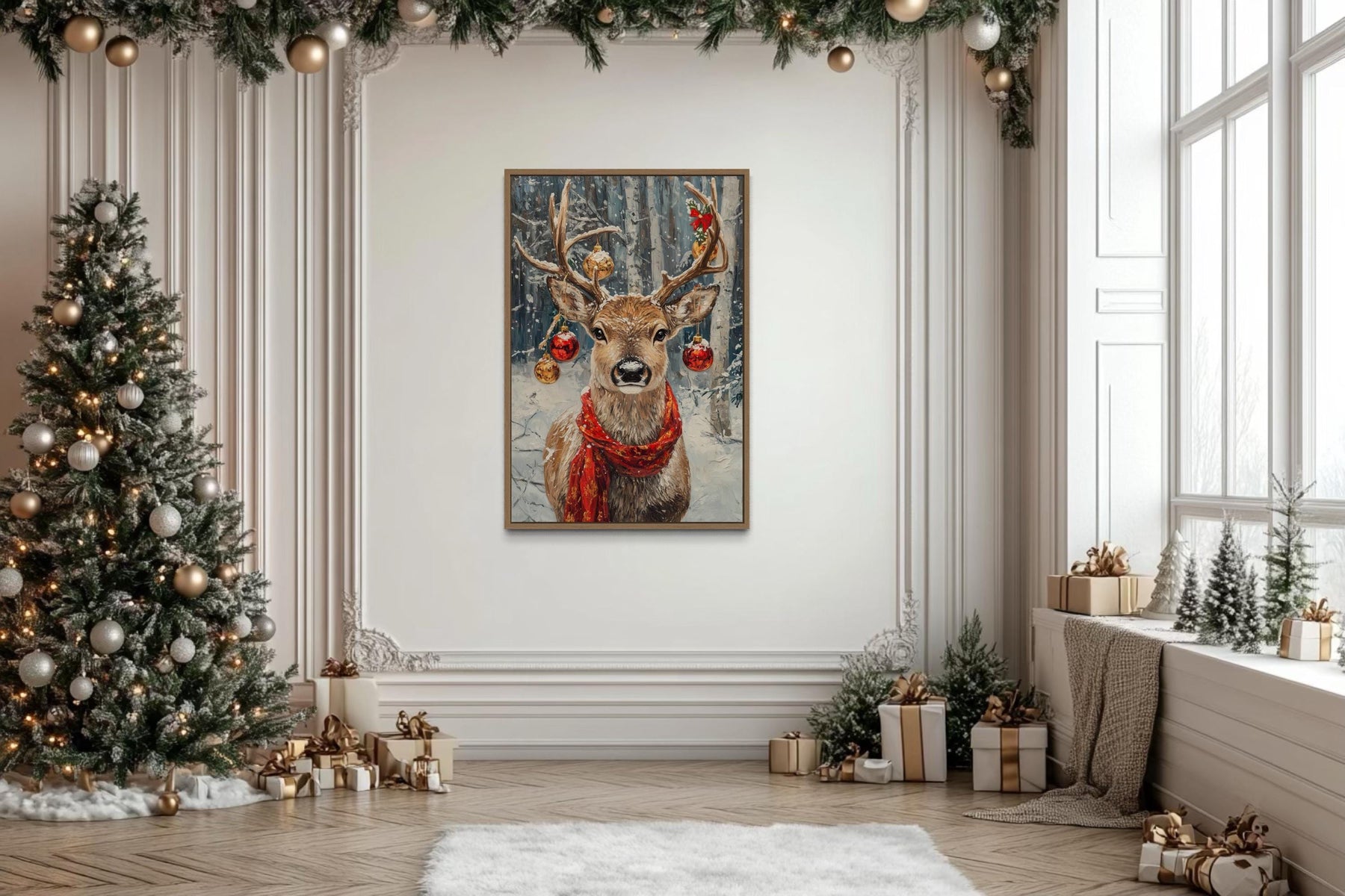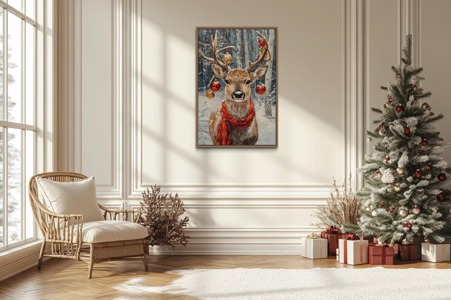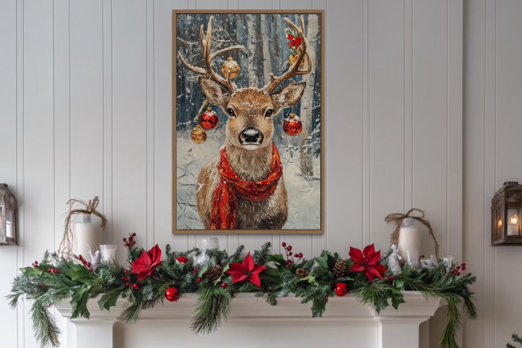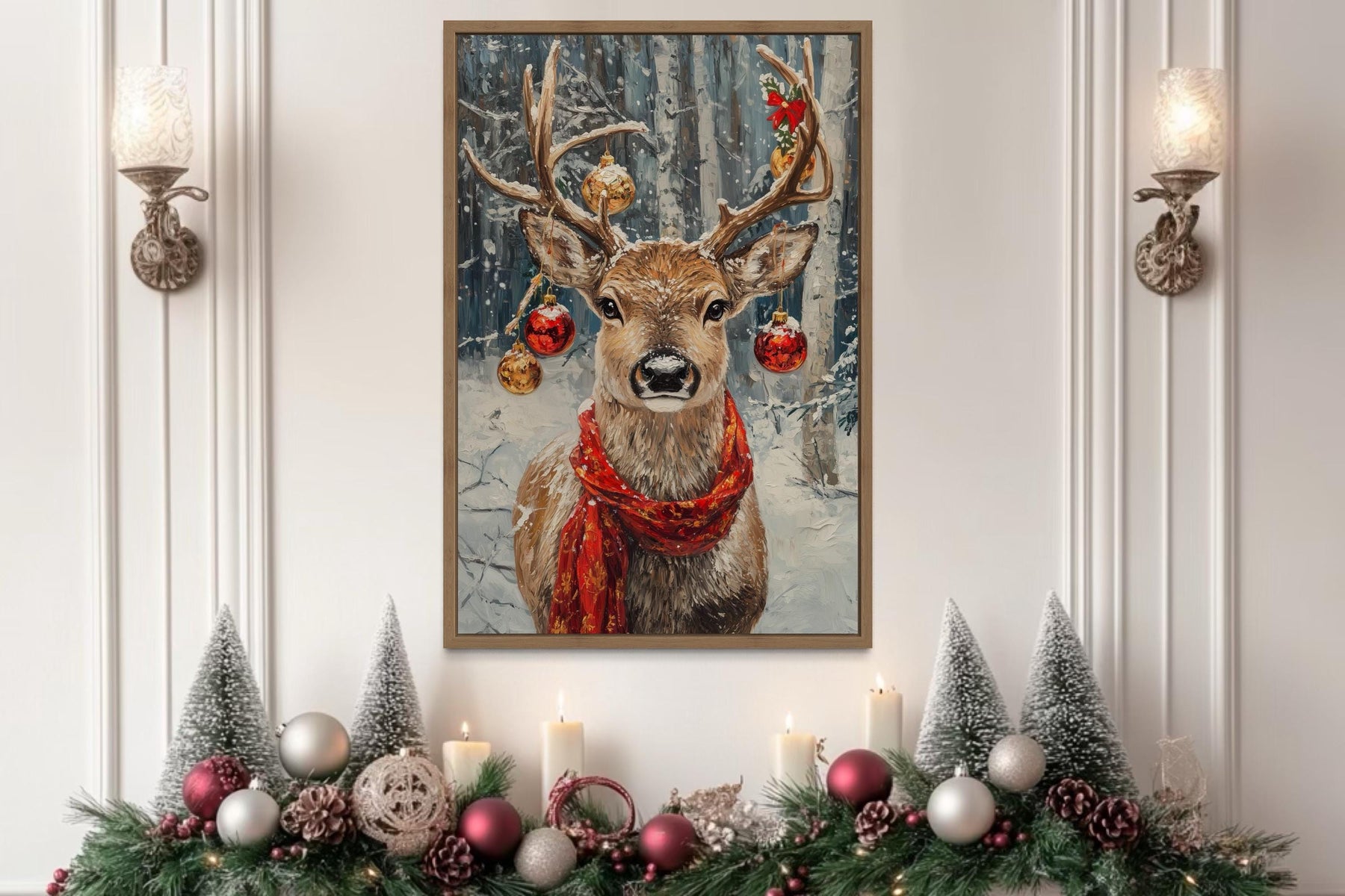 Our Christmas Reindeer With Red Scarf And Ornaments canvas wall art brings festive charm and rustic elegance together in a stunning holiday centerpiece. This joyful painting captures a proud reindeer wearing a bright red scarf, its antlers gracefully adorned with sparkling ornaments that shimmer with seasonal magic. The detailed textures give the impression of natural fur and frosty winter surroundings, while the smooth canvas print ensures lasting quality and vivid color. A snowy forest background adds depth and atmosphere, creating the perfect winter wonderland scene. Gentle shading highlights the reindeer’s confident stance and the cheerful ornaments, making every detail pop. The rustic holiday style blends classic Christmas imagery with contemporary art, offering a warm, inviting touch for the season. Perfect as a single statement piece or combined with other holiday decor, this Christmas Reindeer With Red Scarf And Ornaments painting creates a magical focal point that captivates family and guests alike. With its festive spirit and high-quality finish, this Christmas Reindeer With Red Scarf And Ornaments canvas print completes your seasonal decor and begins the holidays with Christmas Reindeer With Red Scarf And Ornaments wall art.