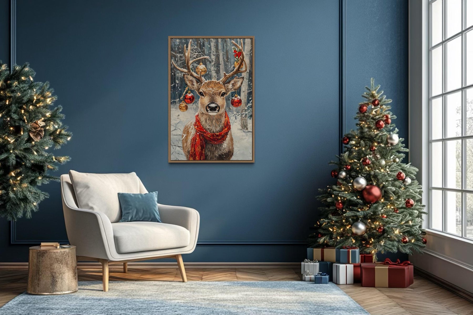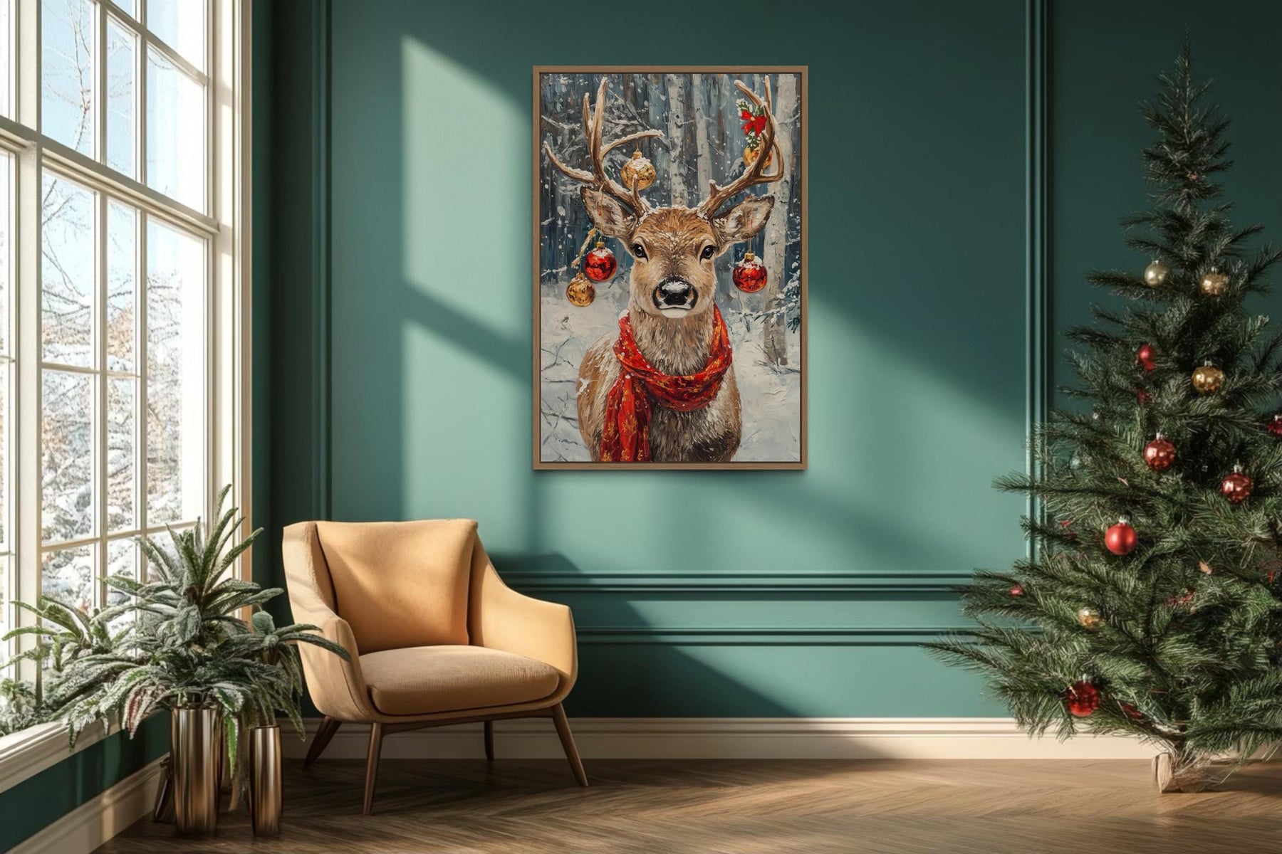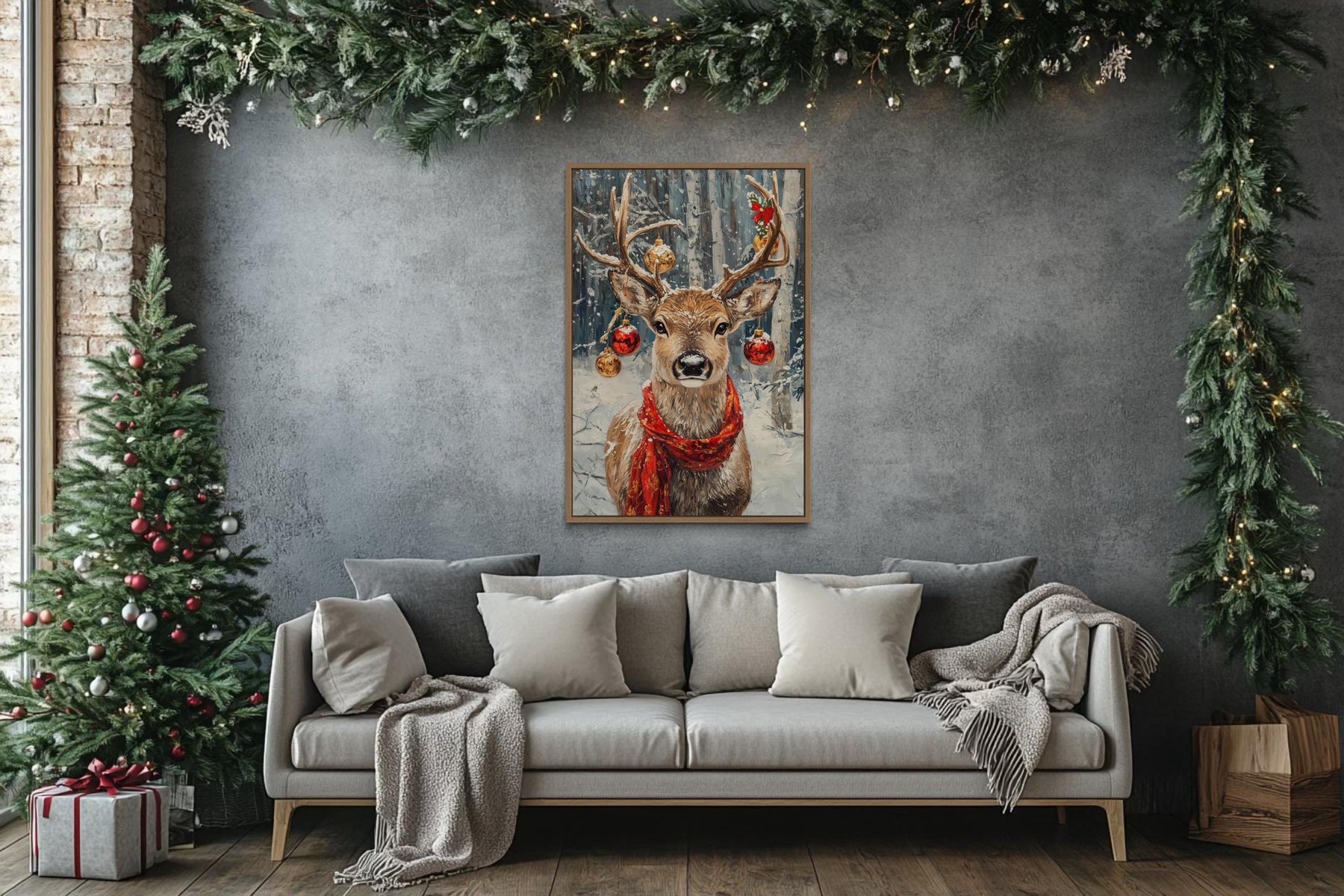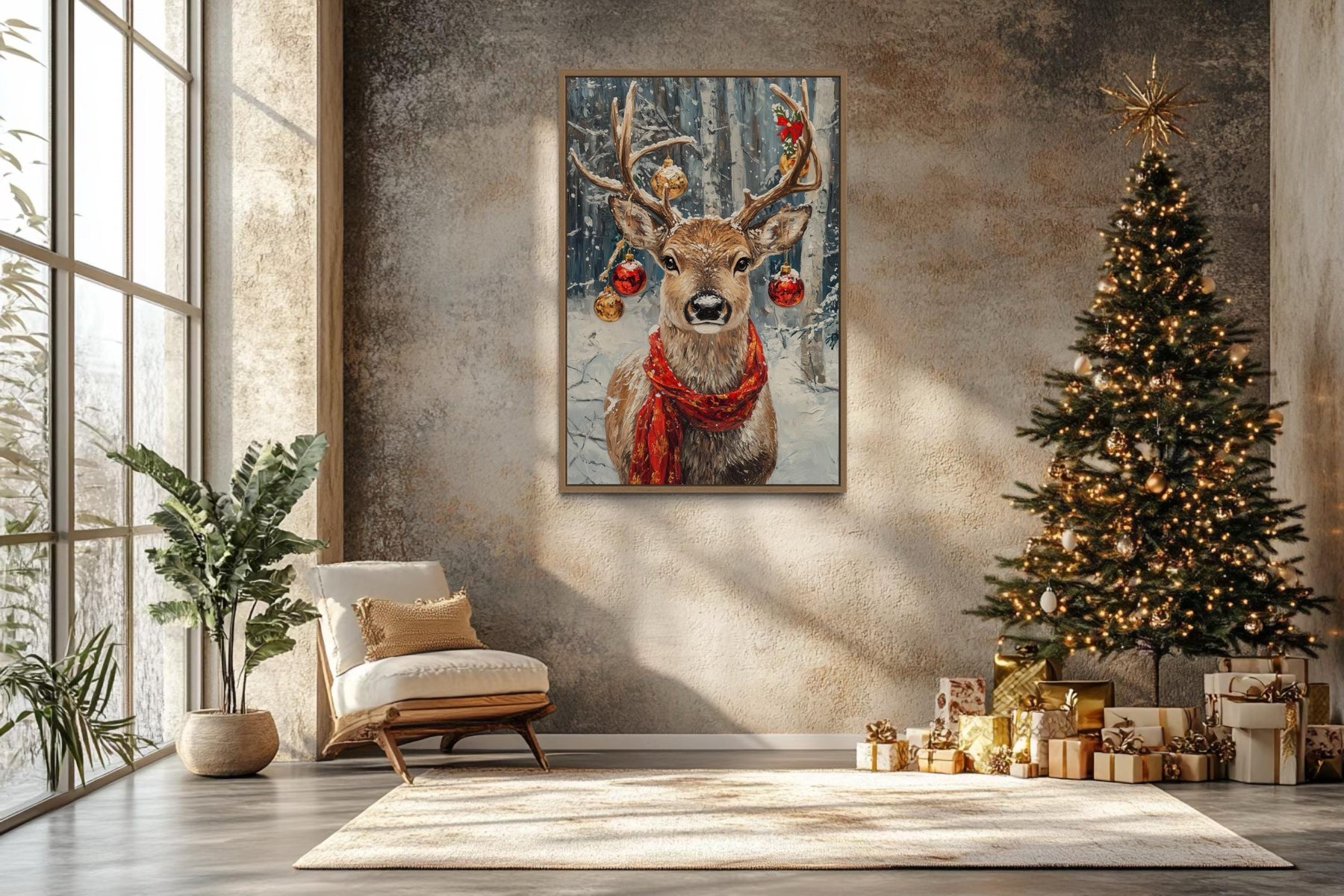 Our Christmas Reindeer With Red Scarf And Ornaments canvas wall art brings festive charm and rustic elegance together in a stunning holiday centerpiece. This joyful painting captures a proud reindeer wearing a bright red scarf, its antlers gracefully adorned with sparkling ornaments that shimmer with seasonal magic. The detailed textures give the impression of natural fur and frosty winter surroundings, while the smooth canvas print ensures lasting quality and vivid color. A snowy forest background adds depth and atmosphere, creating the perfect winter wonderland scene. Gentle shading highlights the reindeer’s confident stance and the cheerful ornaments, making every detail pop. The rustic holiday style blends classic Christmas imagery with contemporary art, offering a warm, inviting touch for the season. Perfect as a single statement piece or combined with other holiday decor, this Christmas Reindeer With Red Scarf And Ornaments painting creates a magical focal point that captivates family and guests alike. With its festive spirit and high-quality finish, this Christmas Reindeer With Red Scarf And Ornaments canvas print completes your seasonal decor and begins the holidays with Christmas Reindeer With Red Scarf And Ornaments wall art.