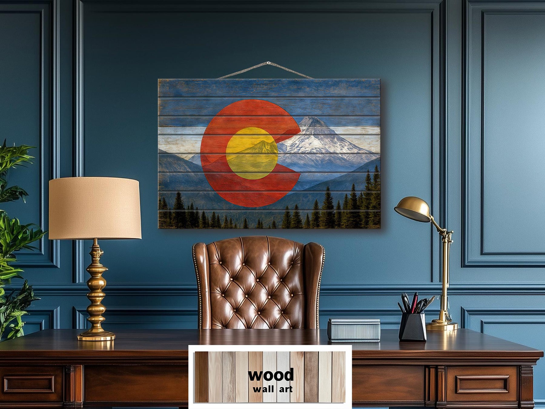 Our Colorado Flag And Rockies Mashup distressed wood wall art showcases a bold fusion of the iconic Colorado flag layered over a panoramic view of the Rocky Mountains, and this Colorado Flag And Rockies Mashup distressed wood wall art immediately stands out as a powerful tribute to the state’s natural beauty. The design is printed on new wood planks, but the artwork itself features a distressed, weathered look with soft cracks, worn edges, and rustic textures that mimic aged wooden signage. The large red “C” from the flag is positioned proudly in the center, filled with a warm golden circle that glows against the cool mountain landscape behind it. Snow-capped peaks stretch across the middle of the artwork, with tall evergreen trees anchoring the foreground and giving the scene a rugged outdoor feel. The flag appears as if painted directly onto the wood, blending seamlessly with the background while still remaining vibrant and recognizable. The blue sky merges with streaks of white, creating a breezy, open-air atmosphere that feels alive and expansive. Soft fading, chipped-paint effects, and gentle surface imperfections create that intentionally imperfect rustic charm customers love. The mashup of state pride and mountain scenery creates a unique visual identity—half flag, half landscape, all Colorado personality. This piece feels artistic, adventurous, and emotionally tied to mountain life. From the first glance, it captures the viewer with its bold composition and rugged beauty, completing the entire scene with the dynamic feel of Colorado Flag And Rockies Mashup artwork.
