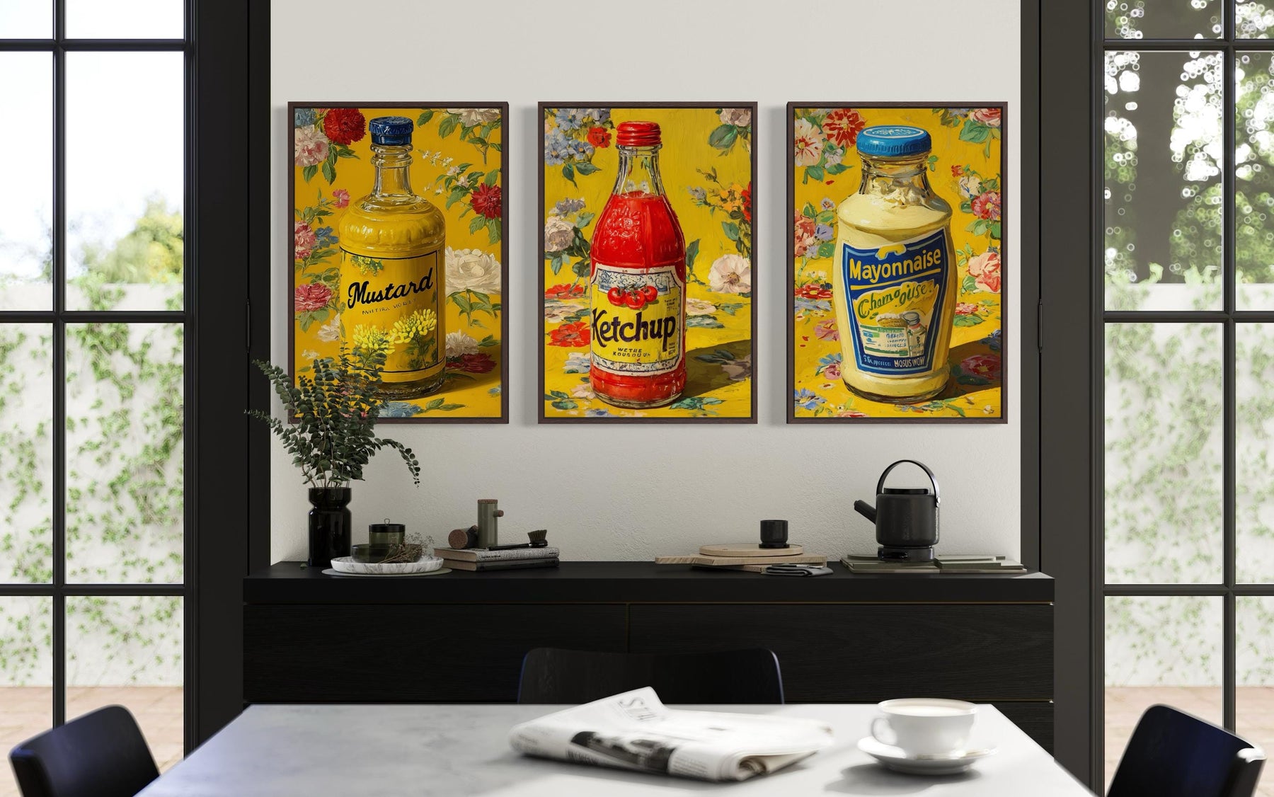 Condiments Wall Art Set of 3, Ketchup, Mustard, and Mayonnaise Retro Food Prints