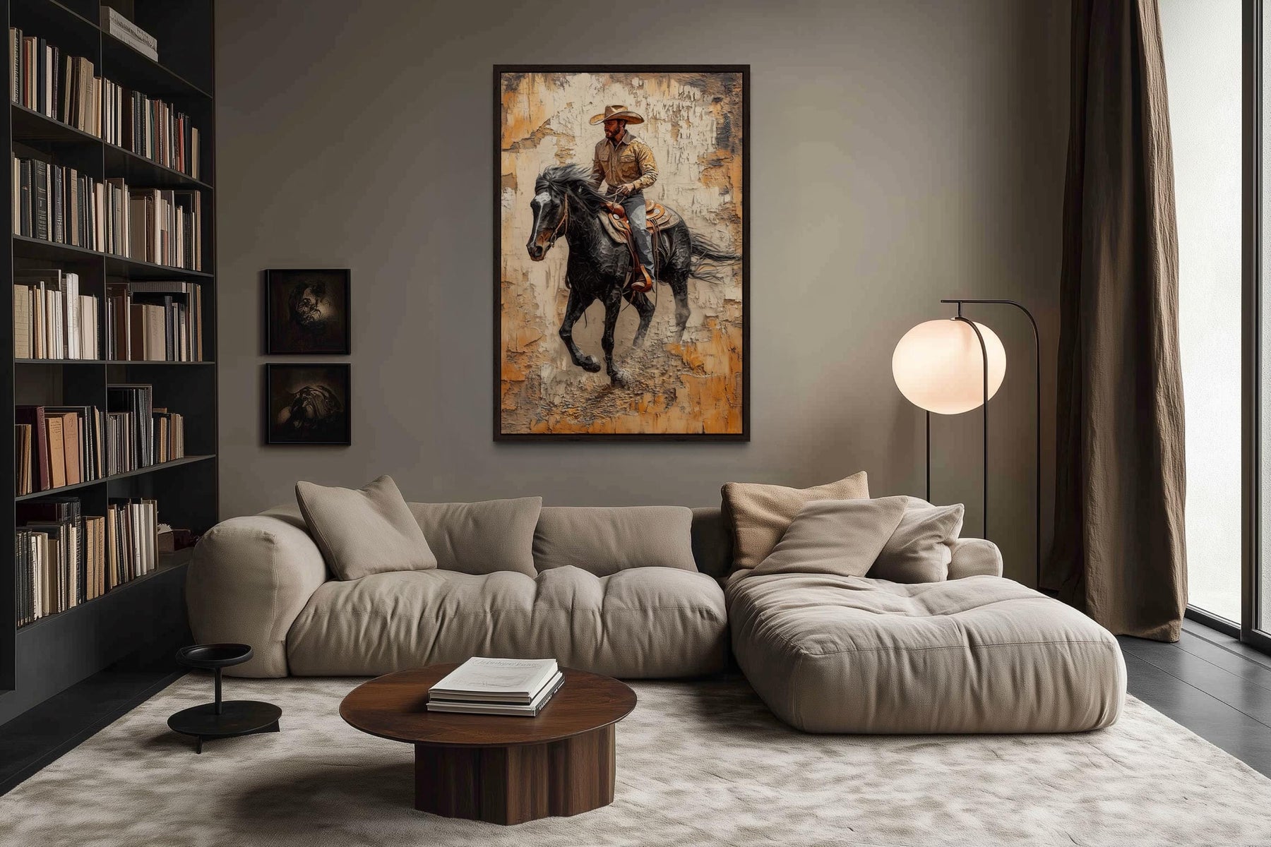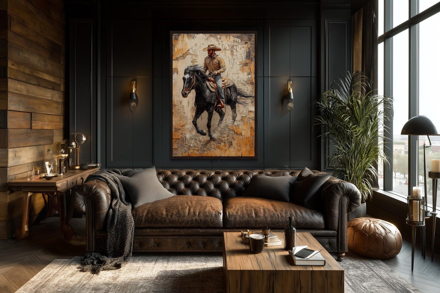 Our Cowboy on Horseback wall decor is the perfect centerpiece for western and rustic interiors where strength and tradition matter. It blends beautifully with reclaimed wood furniture, leather seating, and stone fireplaces, creating an environment that feels both rugged and welcoming. Ideal for ranch-style homes, cabins, or western-themed man caves, this canvas print reinforces a sense of open skies and untamed spirit. Its bold imagery and lifelike motion make it equally striking in game rooms or home offices designed with country character. The western painting pairs naturally with iron accents, cowhide rugs, and earthy textiles, highlighting the classic charm of frontier living. Even in contemporary lofts, it stands out as a powerful contrast to sleek lines and modern furnishings. Each glance invites appreciation of the craftsmanship and storytelling woven into the art. Whether displayed above a mantle, along a hallway, or as part of a western gallery wall, it creates a warm, adventurous mood. Art lovers and collectors who honor the cowboy tradition will find lasting inspiration in its rich detail. Our Cowboy on Horseback western rustic canvas wall art embodies the enduring courage and freedom of the western frontier.