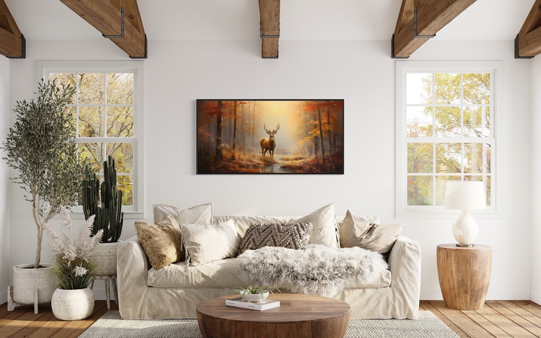 This deer in autumn forest wall art is a perfect choice for rustic cabins, nature-inspired homes, or woodland-themed spaces. Its large size and bold composition make it an ideal focal point above a fireplace, in a living room, or as part of a gallery wall. Pair it with wooden furniture, plaid textiles, and cozy accents to amplify its warm and inviting appeal. The natural subject and earthy tones resonate with those who appreciate wildlife and the changing seasons, adding a touch of outdoor serenity to interior spaces. Its timeless design fits seamlessly into both traditional and contemporary decor settings, making it a versatile option for various home styles. Whether you’re designing a retreat-like space or enhancing your everyday living area, this artwork adds depth and character. Transform your room into a peaceful woodland haven with this deer in autumn forest painting, celebrating the elegance of wildlife and the beauty of autumn.