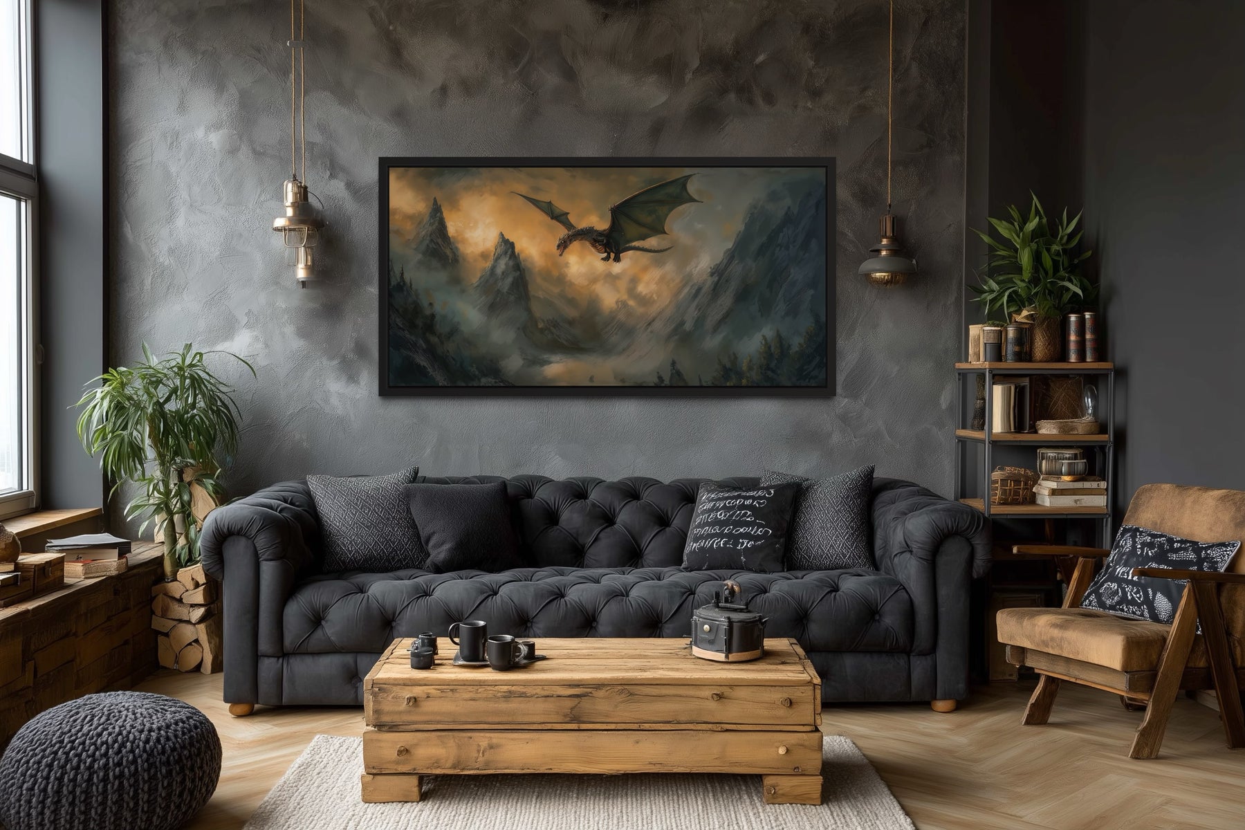 Immerse yourself in a world of fantasy with this dragon flying over mountains painting. This framed canvas print captures the awe-inspiring sight of a majestic dragon soaring above rugged mountains, bringing a touch of mythical wonder to your decor. The intricate detailing of the dragon's wings and the towering peaks creates a captivating visual masterpiece. This artwork is perfect for spaces that embrace fantasy themes or bold statement pieces. Whether displayed in a living room, man cave, or home office, it infuses your space with grandeur and mystique. The panoramic layout allows the scene to stretch across your wall, drawing viewers into the mythical world it portrays. The combination of fantasy and natural beauty makes this piece both imaginative and elegant. Transform your space into a sanctuary of adventure with this stunning dragon canvas print.