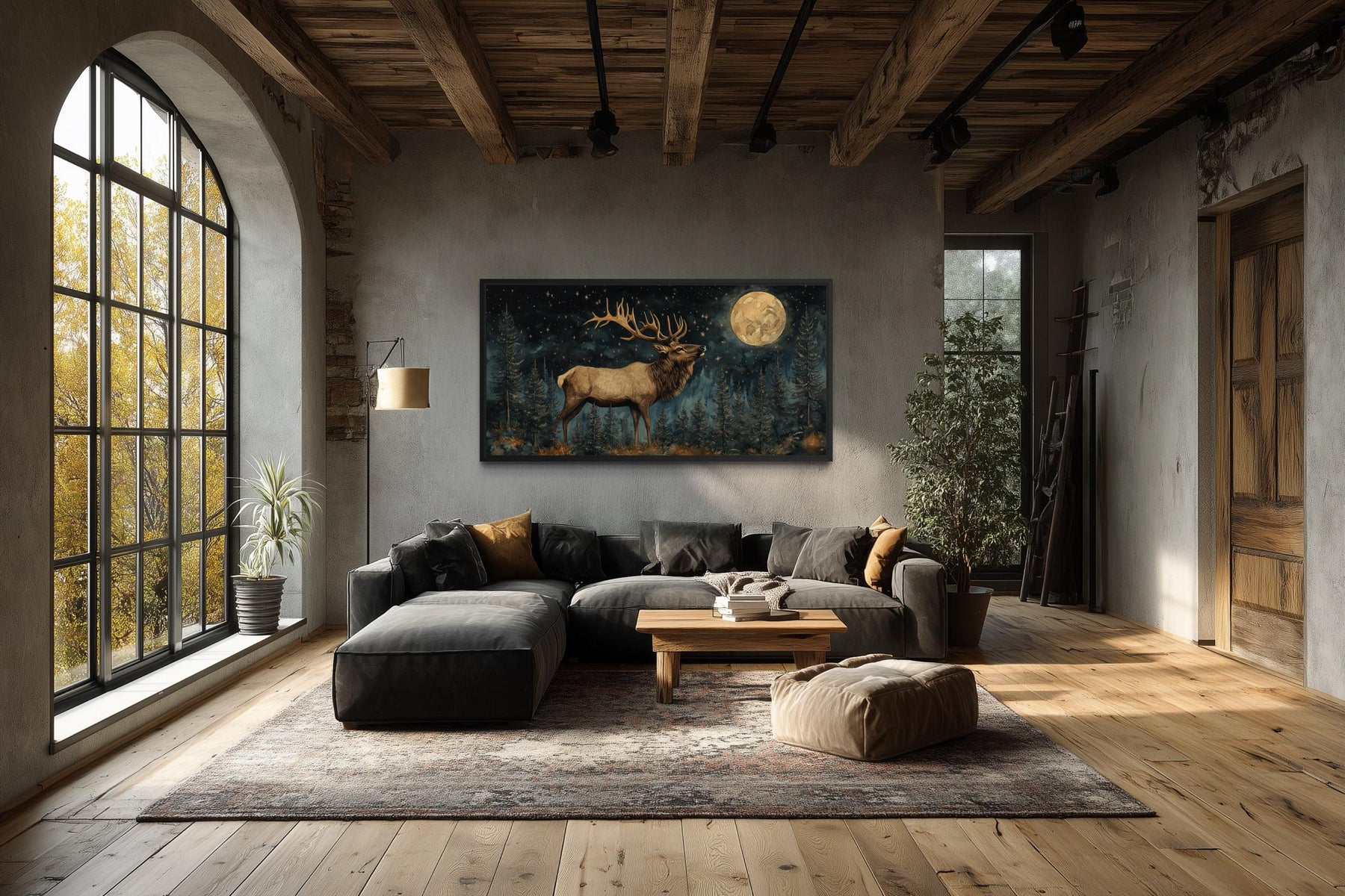 A horizontal canvas print of an elk in a moonlit forest hangs in a rustic, earth-toned living room.