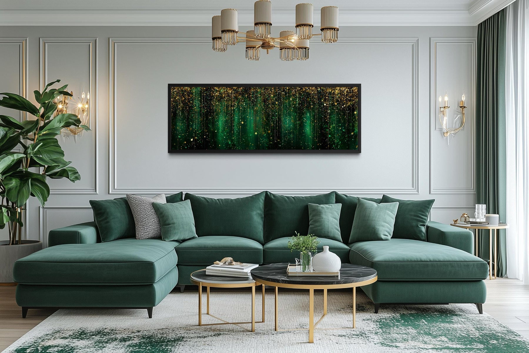 This emerald-toned abstract wall art works beautifully in luxurious interiors or bold, moody color palettes. Ideal for bedrooms with dark green accents or gold-framed headboards, it instantly completes the space above a king or queen bed. In a living room setting, it fits beautifully above velvet couches, marble coffee tables, or metallic light fixtures. If your home includes touches of Art Deco, glam, or modern maximalism, this piece offers a confident visual anchor. It also blends well with jewel-toned interiors and upscale lounge or dining rooms that embrace deep color. Long and narrow, it stretches across wider wall spaces without feeling overpowering or crowded. The abstract motif is flexible—it feels organic in nature-themed rooms and luxurious in more formal settings. Lighting it with warm-toned sconces or chandeliers enhances the metallics and brings out depth in the greens. Whether in a master suite or a formal sitting area, it creates a luxurious yet grounded focal point. The final effect is complete with this emerald green wall art.