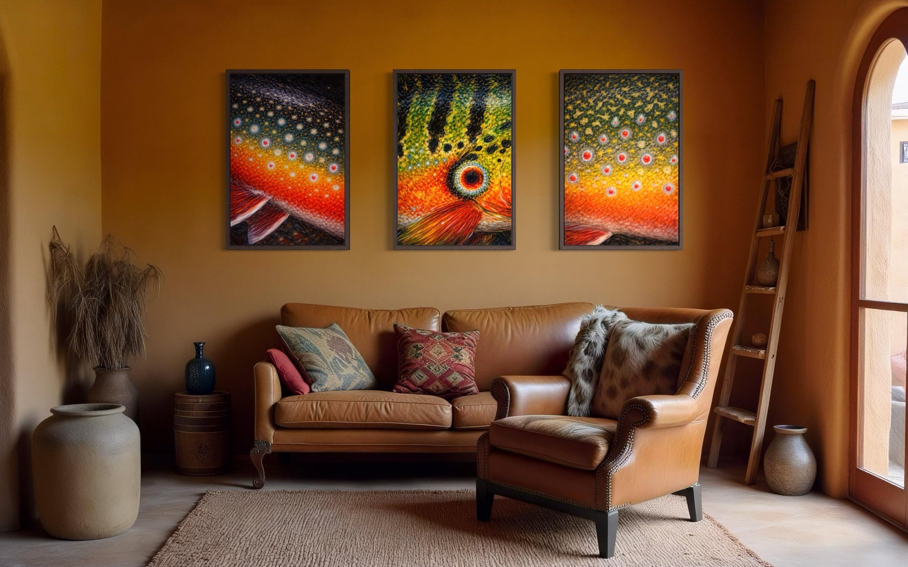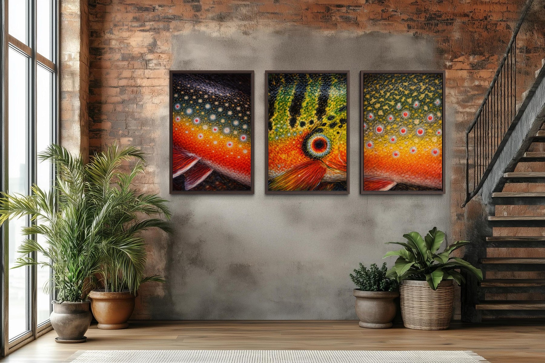 Fish Skin wall art brings a bold, vibrant celebration of freshwater fishing culture to the wall through a striking set of three panels featuring detailed fish skin patterns inspired by Arctic char, peacock bass, and brook trout. Each panel focuses entirely on the natural markings, scales, and color transitions found in these fish, turning real fishing species into graphic, art-forward compositions. The skins are enlarged and stylized so the texture, dots, and flowing patterns become the main visual subject rather than a literal fish portrait. Bright gradients, layered scale details, and organic rhythm give the artwork an energetic, almost abstract look while still staying true to fishing heritage. The three panels are designed to work together as a cohesive set, creating a strong horizontal presence across the wall. This Fish Skin painting style feels modern yet rooted in outdoor tradition, blending cabin character with contemporary design. The artwork feels dynamic and alive, as if the colors are still moving beneath water. Each panel has its own identity while still clearly belonging to the same visual family. The overall effect is bold, graphic, and unmistakably fishing inspired. This Fish Skin wall art turns fish patterns into statement artwork rather than simple décor.