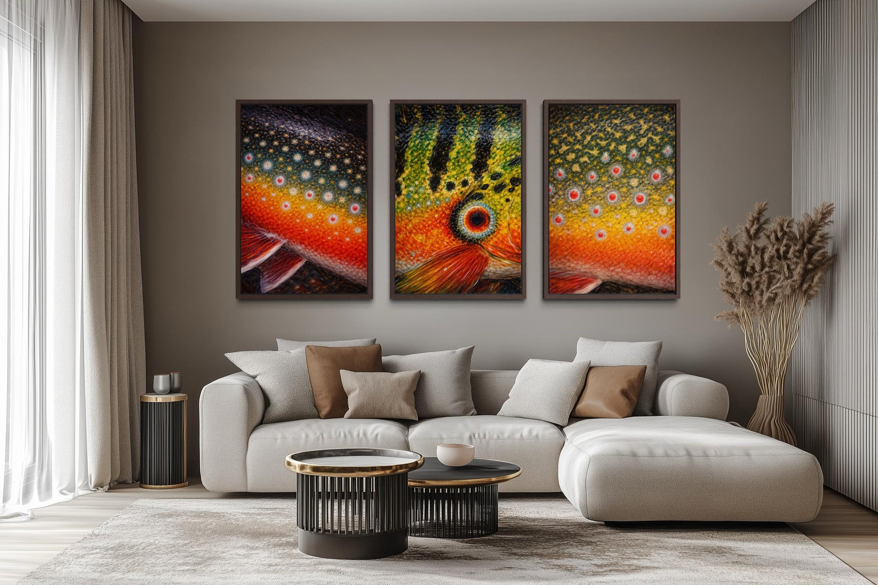 Set of three framed wall art panels featuring vibrant fish skin patterns in a modern living room.