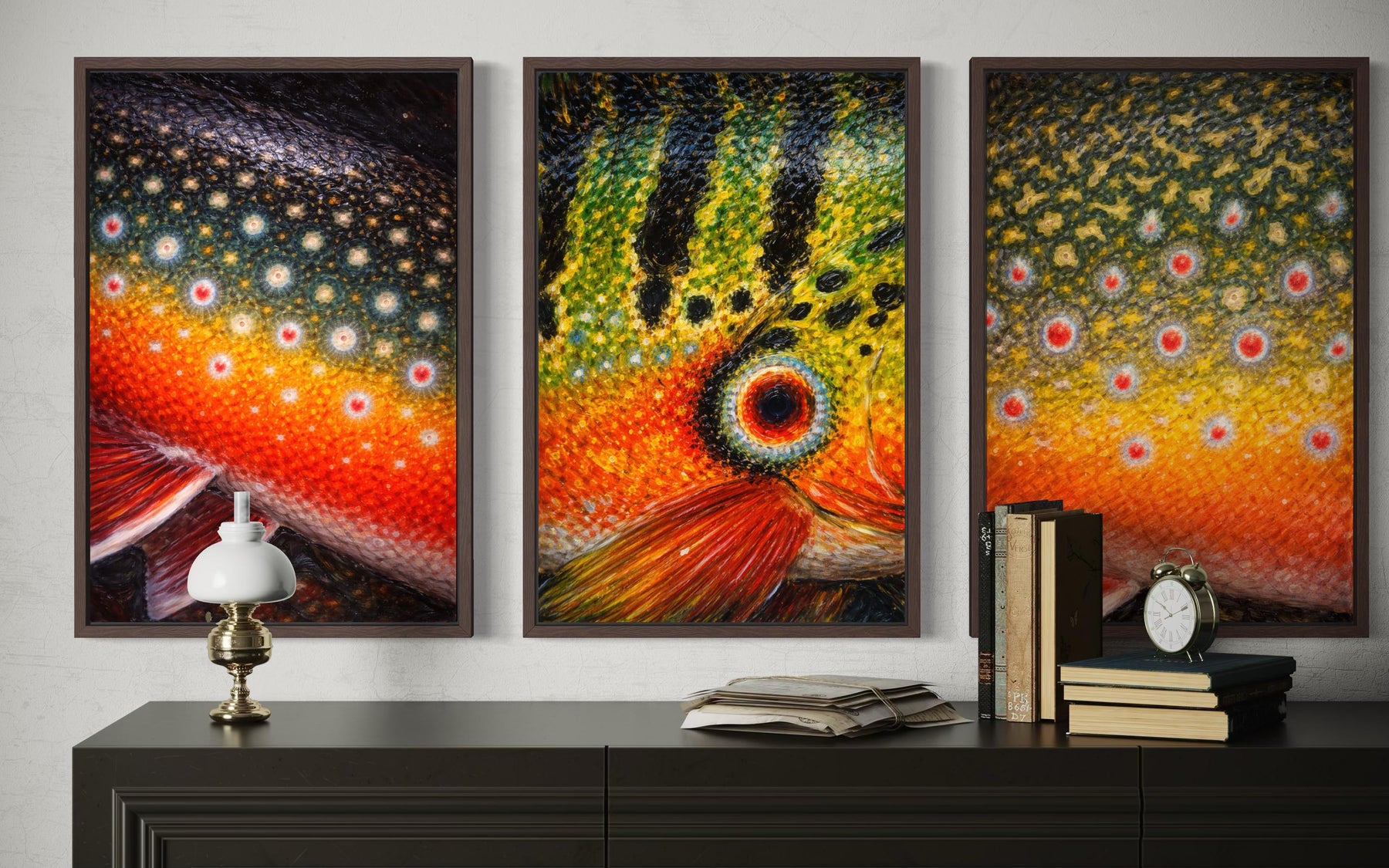 Three framed wall art panels featuring vibrant fish skin patterns of Arctic char, bass, and trout.