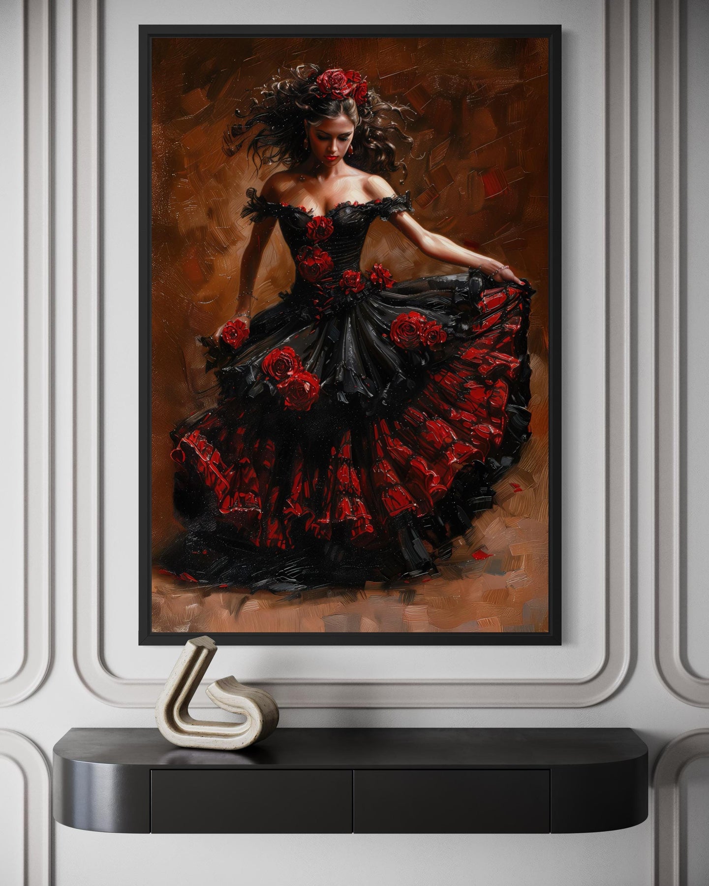 Our Flamenco Dancer Framed Canvas wall art captures the raw emotion, rhythm, and soul of traditional Spanish performance through movement so vivid it seems to leap beyond the frame. The painting centers on a powerful female figure mid-dance, her crimson and black gown twisting into waves of energy that defy stillness, conveying the heartbeat of flamenco itself. Every fold of fabric seems to pulse with life, the vibrant skirt flaring outward in a hypnotic motion that brings the viewer into the tempo of the dance. The artist’s brushwork is masterfully textured, layering light and shadow to create both depth and immediacy, as though the dancer’s next step might echo through the room. Her posture, fierce yet graceful, embodies both confidence and surrender to the rhythm, a duality that defines flamenco’s spirit of passion and defiance. The surrounding background is painted in moody tones of darkness, allowing the luminous warmth of her skin and dress to blaze forth like embers in a dimly lit tavern. The framing enhances the theatrical effect, transforming this Flamenco Dancer painting into a moment of captured intensity that commands the viewer’s attention with every glance. You can almost sense the swish of fabric, the stomp of her heels, and the faint shimmer of light reflecting from her earrings as she moves with unrestrained pride. Each detail—the lifted chin, the outstretched arm, the motion of the ruffles—reveals discipline and artistry balanced perfectly with passion. This Flamenco Dancer Framed Canvas wall art is not merely a depiction of dance; it is a celebration of vitality, tradition, and the timeless power of feminine strength expressed through motion and form.
