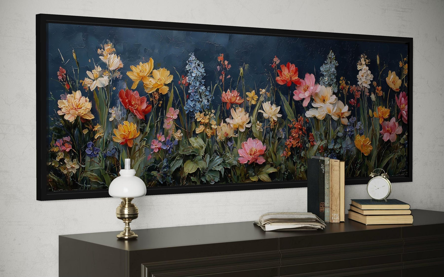 The rich palette in this wildflowers wall decor creates an immersive garden atmosphere, blooming with contrast, color, and softness. The deep navy background isn’t just a setting—it brings depth, mood, and an elevated tone that pushes the florals forward in a dramatic and beautiful way. Petals of coral, soft peach, blush pink, golden yellow, and burnt orange burst across the scene, anchored by stems and leaves in layered greens from sage to olive. Blue and violet details add a cool-toned contrast that balances the warmth of the brighter blooms. White blossoms and subtle ivory tips are placed sparingly to give air and highlights to the fuller color sections. The range of greens ties the composition together, giving structure and botanical realism to the overall piece. While vibrant, none of the tones feel overly artificial or saturated—everything is painted with just the right amount of softness and shading. These colors make the artwork flexible in both dark-walled spaces where it glows, and light interiors where it adds depth and energy. In rooms with navy, charcoal, or slate walls, it becomes moody and dramatic, while in beige or white settings, it adds bright contrast. All together, the colors in this long horizontal botanical decor make it the perfect anchor for a stylish room.