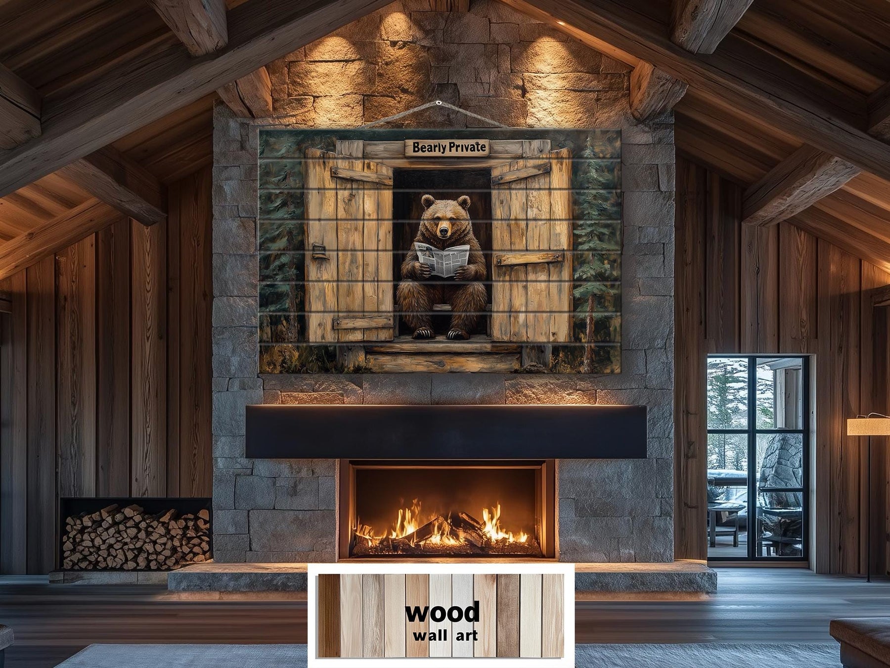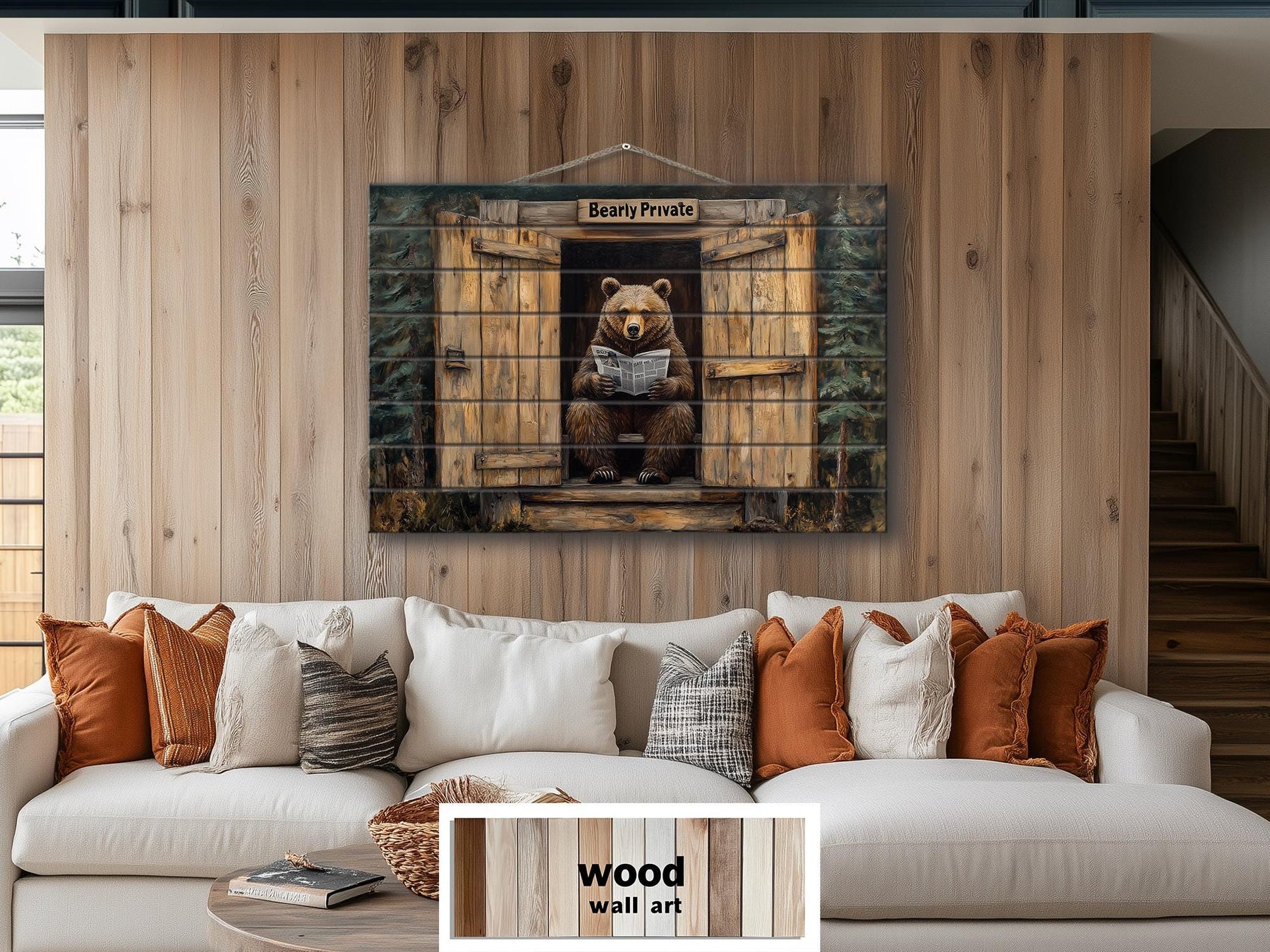 Our Funny Bear In Outhouse wall art is perfect for rustic cabins and man caves where humor mixes naturally with country-inspired décor. In a cabin, this playful design fits beautifully against log walls, stone fireplaces, antler décor, pine furniture, and warm flannel textiles. The woodland theme blends into environments decorated with nature scenes, wildlife accents, and rustic lodge accessories. This artwork becomes an instant conversation starter in vacation cabins, mountain lodges, lake houses, or forest retreats. For man caves, its humor adds personality and a laid-back vibe, especially in spaces styled with leather seating, dark woods, or vintage signs. It enhances rooms with outdoorsy personality, appealing to people who love camping, hunting, wildlife, or simply funny art that doesn’t take itself too seriously. It stands out as the perfect piece for bathrooms in rustic homes as well, adding cheeky charm without being over-the-top. The playful design delivers character, warmth, and laughter while staying true to country aesthetics. This unforgettable piece completes any lodge-style retreat with the rustic charm of Funny Bear In Outhouse wall art.
