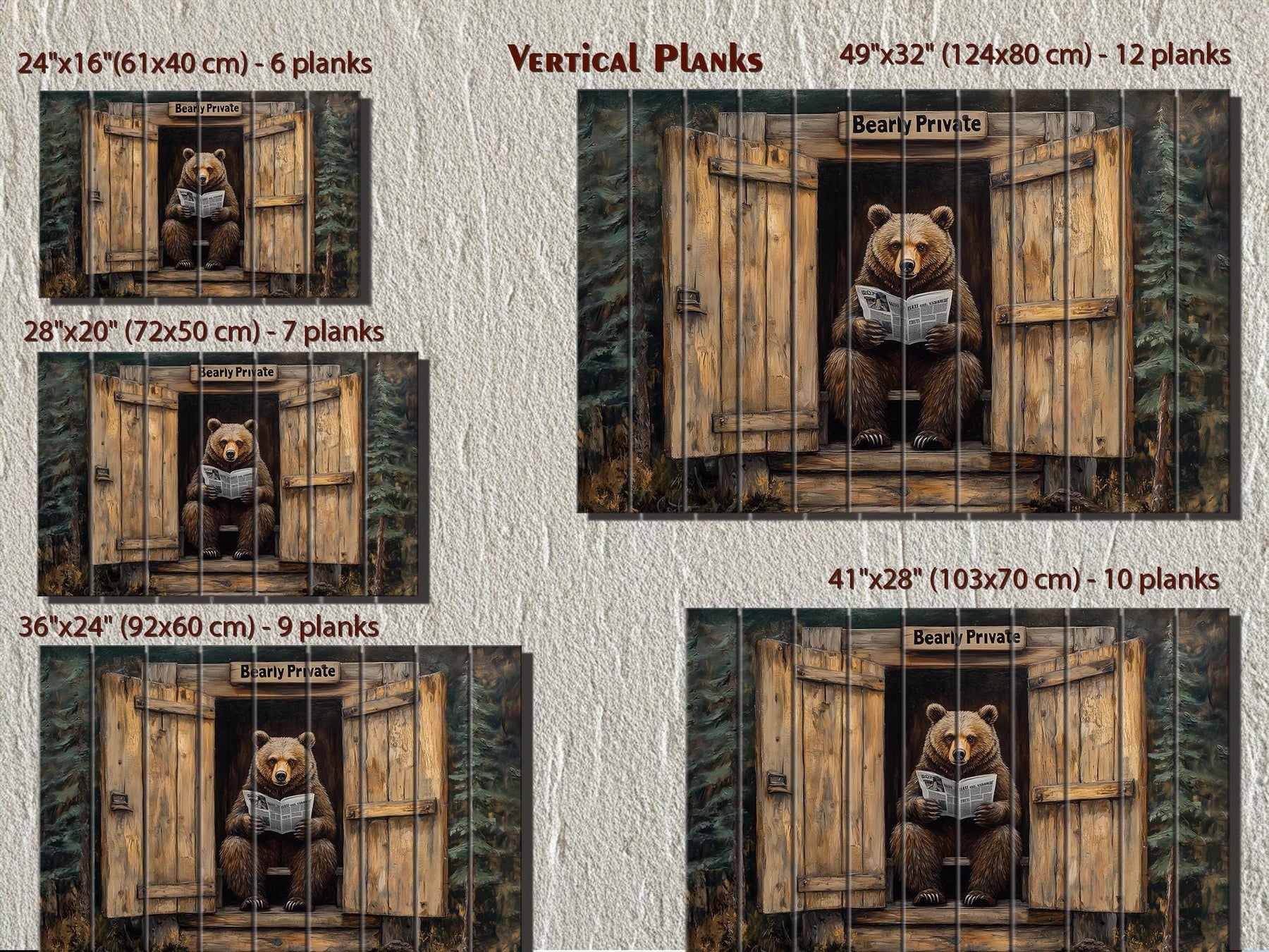 Our Funny Bear In Outhouse distressed wood wall art brings a hilarious and charming woodland scene to life with a rustic look printed directly onto new wood planks, and this Funny Bear In Outhouse distressed wood wall art instantly sets a playful mood the moment you see it. At the center of the design is a big brown bear sitting inside an outhouse with the door slightly open, giving a mischievous expression that makes the entire piece feel warm and humorous. The background features a faux-wood texture printed to look aged, cracked, and weathered, but the wood itself is brand new, smooth, and high-quality. The distressed details add personality, making it look like a vintage country cabin sign pulled straight from a cozy forest lodge. The outhouse structure is drawn with rustic boards, metal hinges, and a whimsical crescent moon cutout that enhances the playful storytelling. The bear’s expression feels animated and full of attitude, making anyone who walks into the room stop and laugh. Surrounding details like pine trees, wood grain effects, and subtle shading complete the rural forest atmosphere. The artwork feels intentionally imperfect for style, with crackle-like edges and faded patches that heighten its retro charm. It reads as a humorous country-themed illustration with a fun, cabin-style twist. This delightful woodland scene finishes with an irresistible touch of humor carried all the way through with Funny Bear In Outhouse artwork.