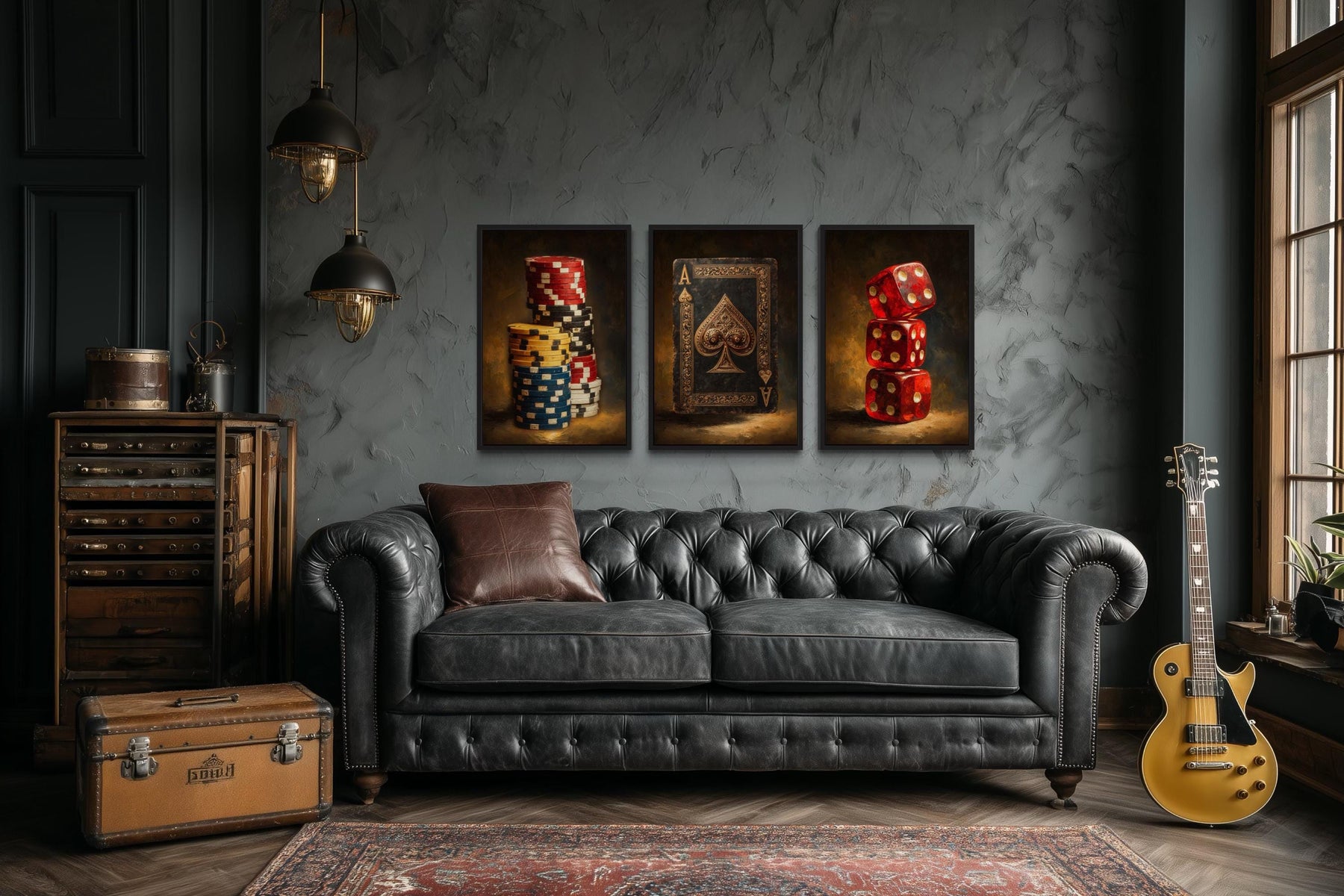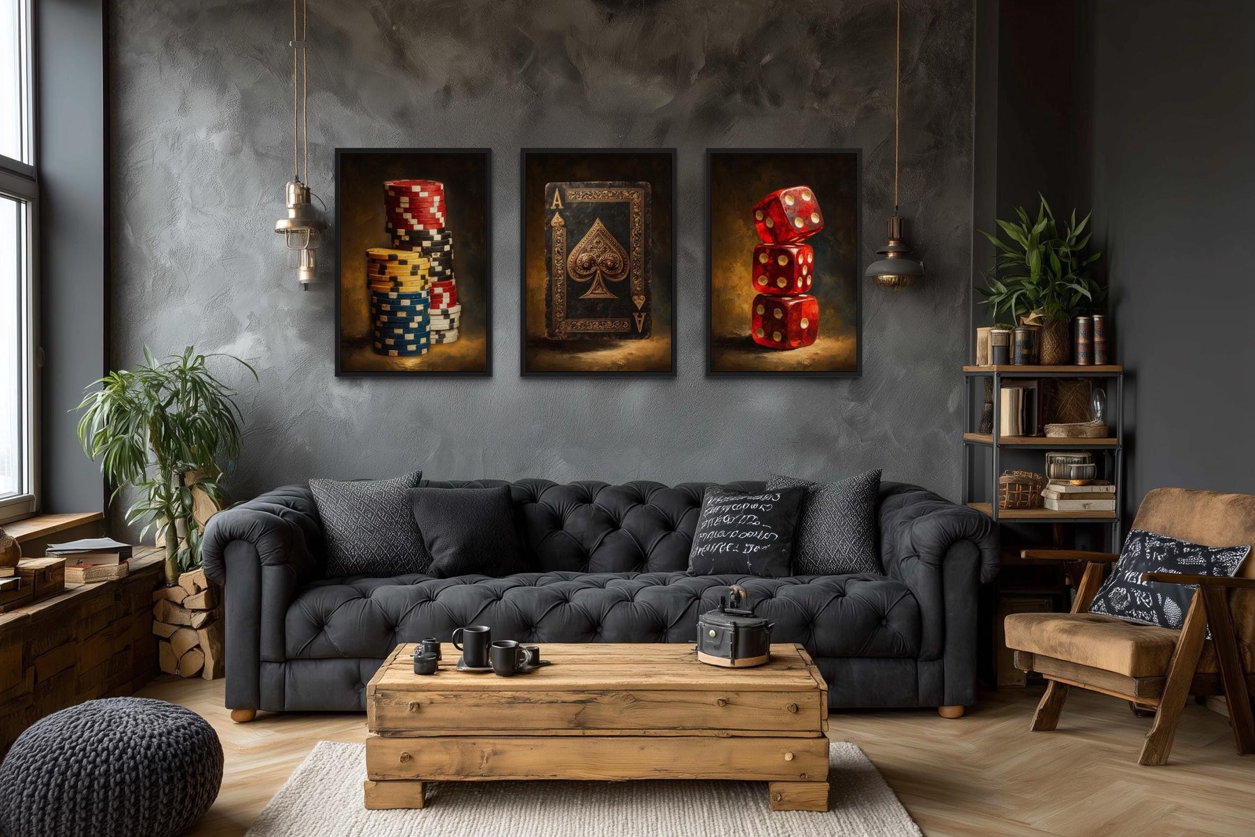 Our set of 3 game room wall decor depicting casino poker chips, ace of spades playing card, and red dice canvas wall art delivers high-stakes excitement and bold modern style in a single striking trio. This game room wall art set includes three dramatic panels: one focused on a glowing tower of poker chips, one showcasing a legendary ace of spades playing card, and one highlighting bright red dice mid-roll. Each piece is meticulously designed with rich detail and dynamic lighting, creating the feel of a luxury casino right in your own space. The vivid imagery captures the anticipation of a big win, from the shine of polished chips to the intricate patterns of the classic card. Subtle textures and layered shading add depth, giving every element a lifelike presence that stands out from any angle. Printed on premium canvas, this set blends contemporary digital artistry with the tactile charm of a fine painting, ensuring long-lasting clarity and vibrancy. The dramatic composition and bold colors bring energy and motion, ideal for creating a lively focal point in your entertainment area. Whether you are a poker enthusiast, a lover of Las Vegas glamour, or simply want to bring a playful edge to your décor, this game room wall decor set offers excitement and sophistication. The game room wall decor set of 3 poker chips, ace of spades, and red dice canvas print transforms ordinary walls into an immersive casino-inspired gallery.