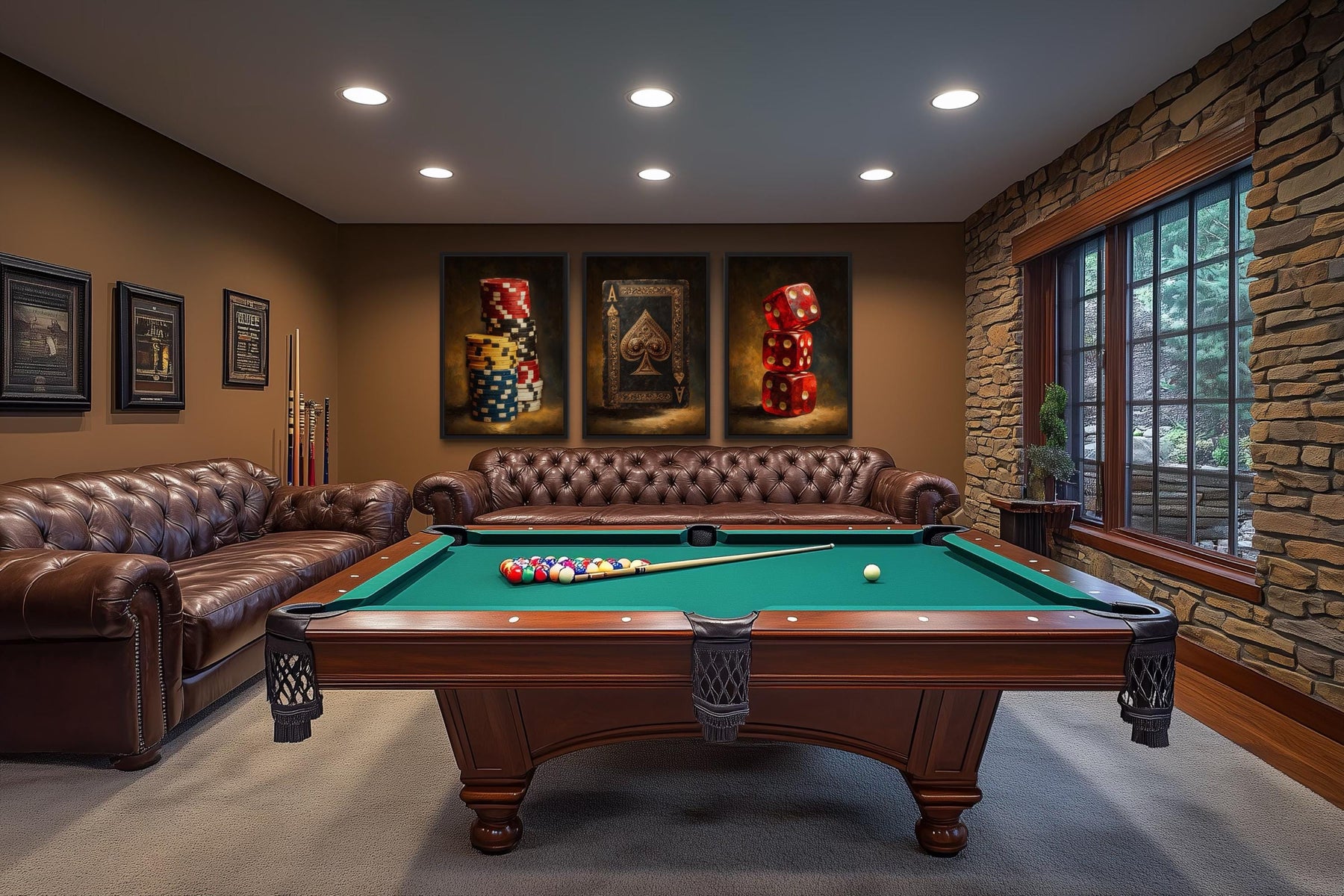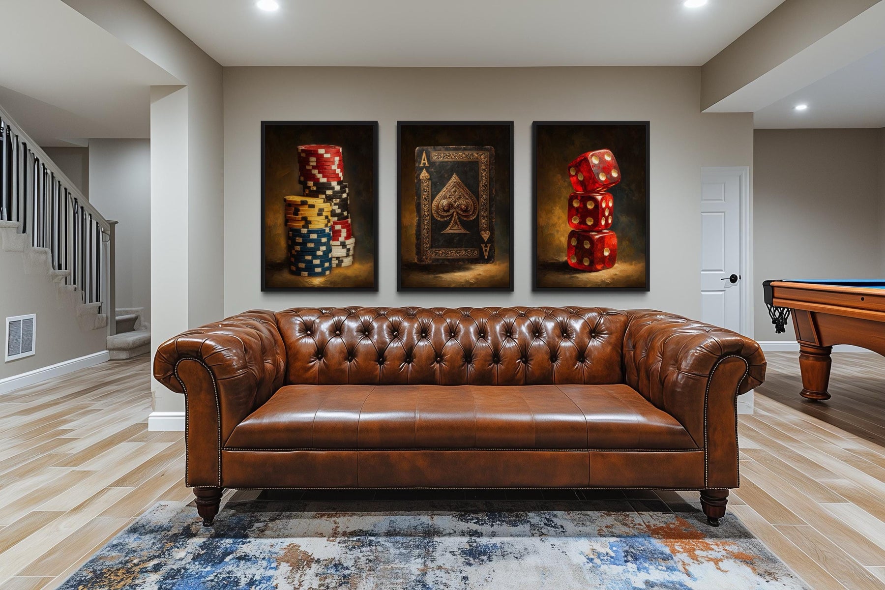 This casino poker chips wall art set is designed for game rooms, man caves, and entertainment lounges that thrive on bold personality and dynamic energy. In a dedicated poker or billiards room, it pairs perfectly with leather seating, dark wood accents, and rich textures, setting a high-stakes mood for tournaments and late-night games. Hung above a bar or alongside a pool table, it adds instant excitement, turning casual get-togethers into unforgettable nights. For man caves or modern entertainment areas, the strong lines and glowing highlights provide a dramatic contrast to sleek furnishings and minimalist color schemes. Its bold imagery complements neon signs, vintage slot machines, and sports memorabilia, making it easy to create a cohesive gaming-inspired environment. Urban lofts and contemporary apartments can use this set as a vibrant centerpiece, infusing industrial spaces with a burst of playful sophistication. Collectors of casino art and poker enthusiasts will appreciate its lifelike details and immersive design that celebrate the world of gaming. Whether displayed in a private club room or a lively home bar, it creates a powerful visual impact that keeps the excitement of the casino alive. The game room wall decor set of 3 poker chips, ace of spades, and red dice canvas print completes any entertainment space with modern energy and stylish casino flair.