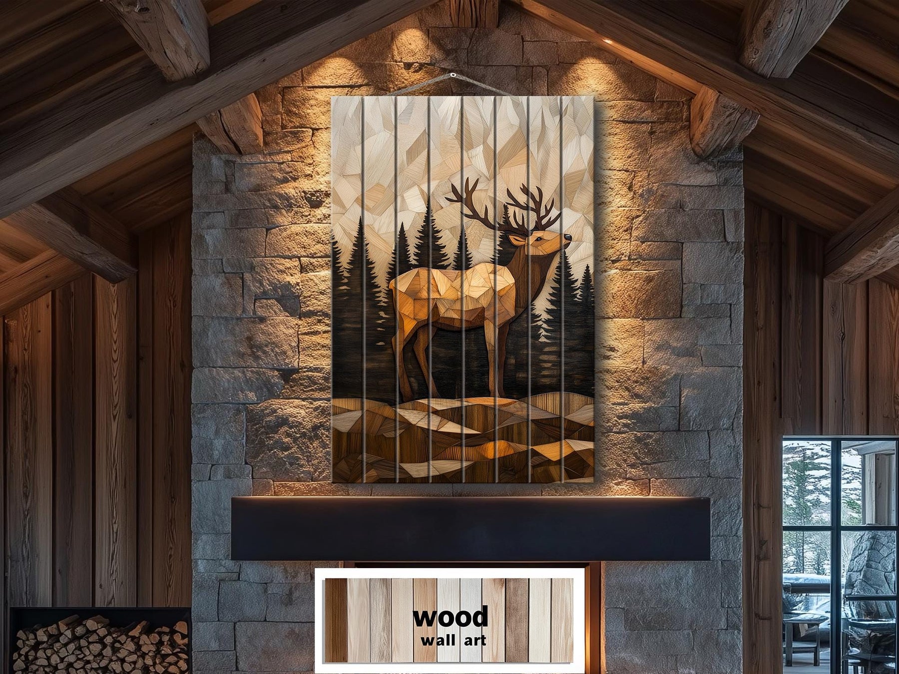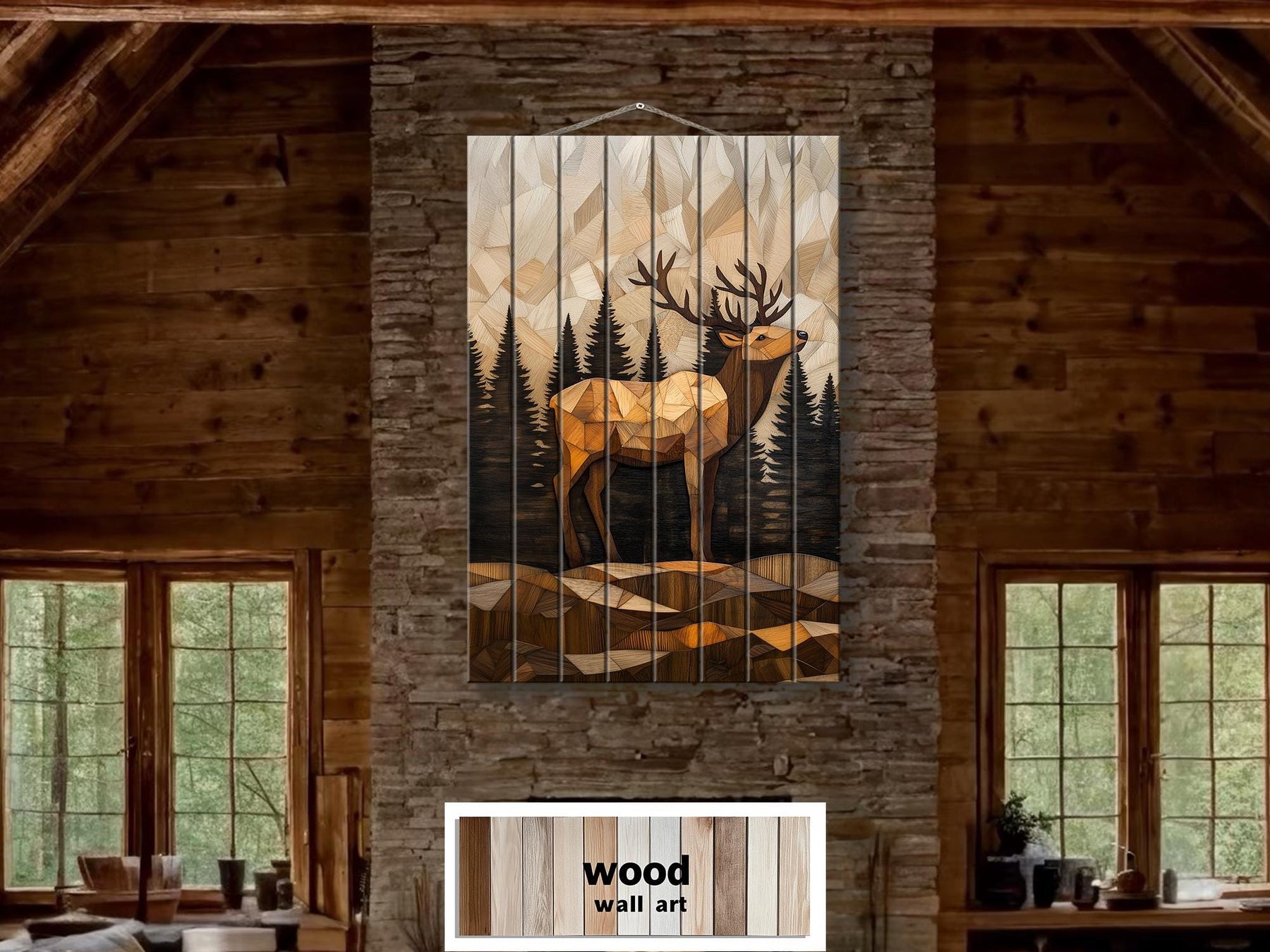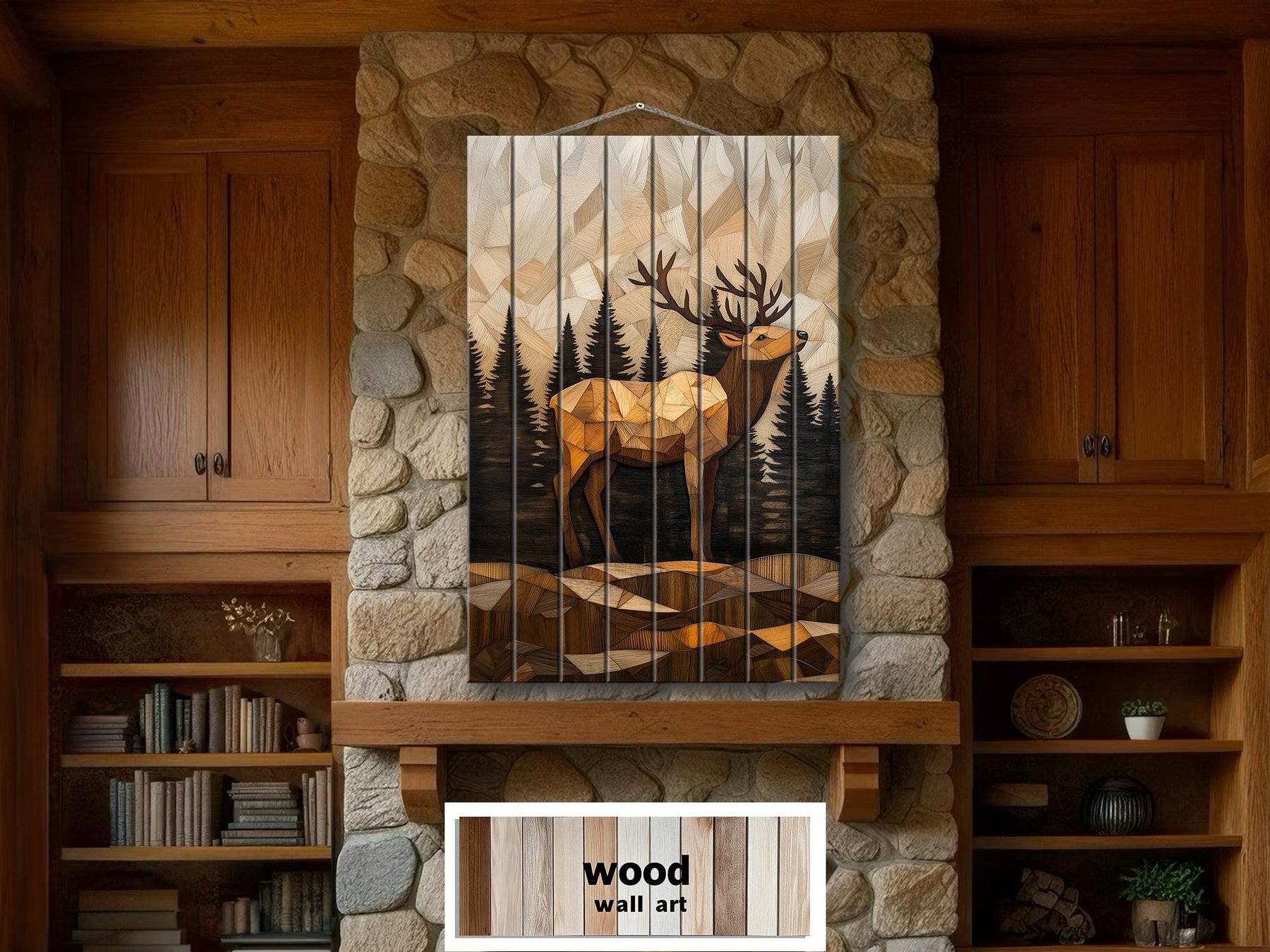The color palette of this geometric elk in the forest distressed wood wall art draws on the rich tones of the outdoors, creating a sense of natural tranquility. Warm browns and deep wood grains set a rustic base, accented by earthy greens that echo pine trees and moss-covered forest floors. Subtle hints of amber and gold reflect dappled sunlight, while charcoal and black geometric lines add crisp definition to the elk silhouette. The distressed painting technique softens and layers these hues, giving the piece an authentic, time-worn character without compromising vibrancy. The interplay of warm and cool shades gives the impression of a forest alive with changing light and shadow. Every printed layer is carefully balanced to preserve the natural look of the wood, allowing its organic texture to complement the colors. This harmonious mix of forest-inspired tones ensures the art enhances a variety of interiors, from traditional rustic rooms to more modern, eclectic spaces. With its enduring pigments and timeless aesthetic, the artwork’s palette evokes a calm woodland retreat in every season.