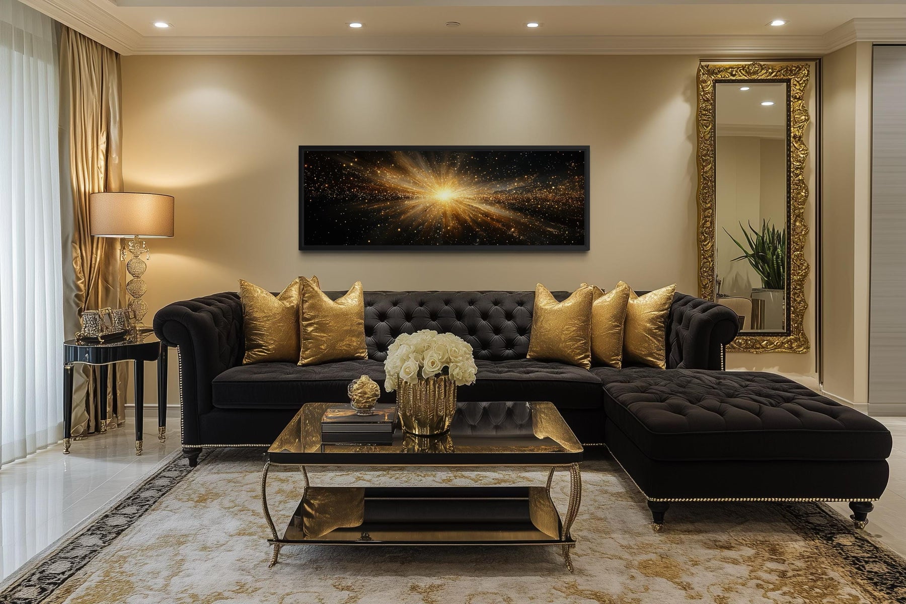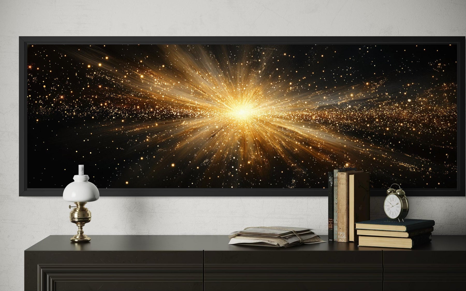 This abstract starburst wall decor works especially well in interiors that embrace bold modern design and dramatic color contrasts. In a bedroom above the bed, the wide canvas print creates a strong visual centerpiece that immediately draws attention. The glowing gold rays contrast beautifully with dark bedding, black furniture, or warm neutral interiors. Living rooms styled with modern furniture and metallic accents benefit from the artwork’s dramatic focal point. The luminous burst of light pairs naturally with interiors that include gold fixtures, warm lighting, or dark decorative elements. Because the composition spreads horizontally, the canvas fills wide wall areas while maintaining balanced visual movement. The abstract design allows the artwork to complement both contemporary and transitional interior styles. The glowing rays introduce energy without disrupting the overall harmony of the room. When placed above a sofa, console, or bed, the artwork anchors the space with a bold visual statement. In modern interiors seeking dramatic contrast and luminous design, this abstract gold starburst canvas wall art becomes an unforgettable piece of wall decor.
