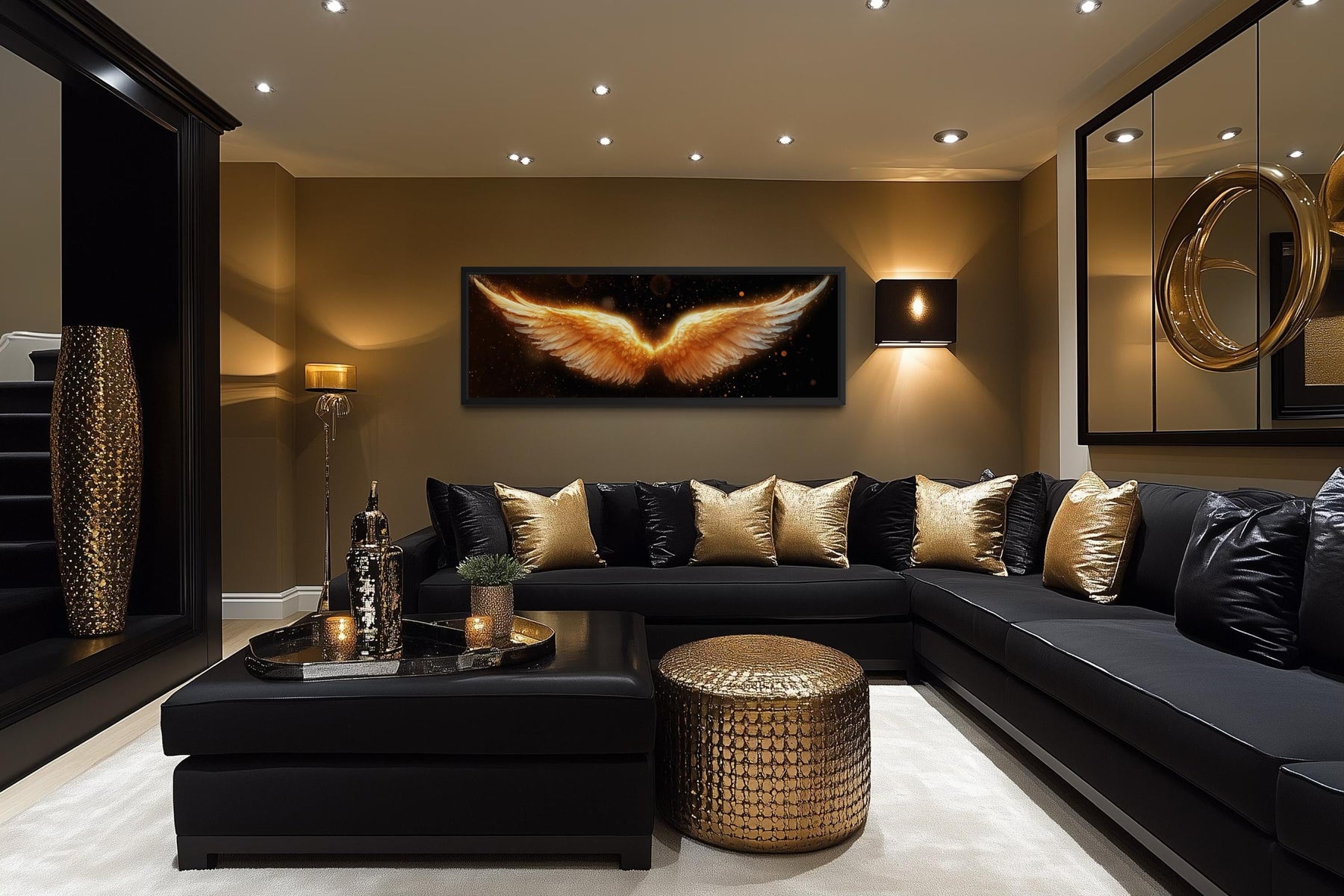 Created for interiors that embrace drama and refinement, this Golden Angel Wings wall decor is especially suited for a black and gold luxury bedroom where layered textiles, upholstered headboards, and ambient lighting enhance its glowing presence. Positioned above a bed, the wings naturally frame the sleeping area and create a visual headboard effect that feels both protective and indulgent, turning the space into a boutique-hotel inspired retreat. The horizontal format works beautifully with wide furniture and low silhouettes, reinforcing the sense of openness and symmetry that defines modern glam design. In a dedicated luxury bedroom setting the artwork pairs effortlessly with velvet cushions, mirrored nightstands, warm metallic accents, and soft neutral bedding, allowing the gold tones to echo throughout the space. The spiritual symbolism of wings adds an emotional dimension that makes the room feel personal and serene while still maintaining a bold visual identity. Because of its scale and strong contrast, the piece thrives in interiors that use dark palettes and controlled lighting rather than bright casual spaces. The presence of the glowing form against black introduces a cinematic atmosphere that transforms evening lighting into part of the décor experience. This is not a piece for eclectic multi-color rooms but for carefully curated environments where every element contributes to a cohesive and luxurious mood. The modern yet timeless aesthetic also makes it ideal for master bedrooms designed around symmetry and statement décor rather than minimal or rustic themes. The final effect is a space that feels intimate, elevated, and visually unforgettable, anchored by Golden Angel Wings canvas wall art.