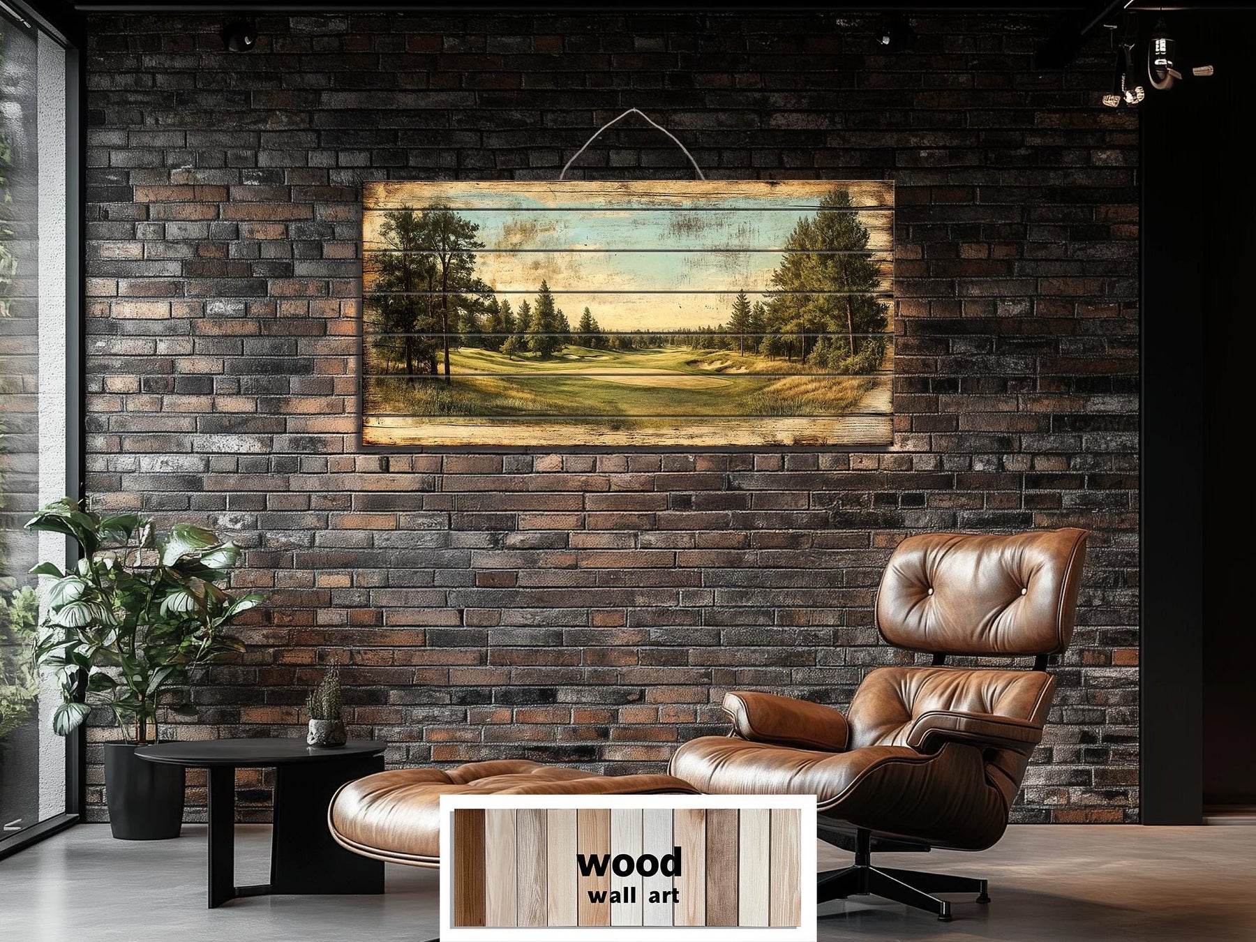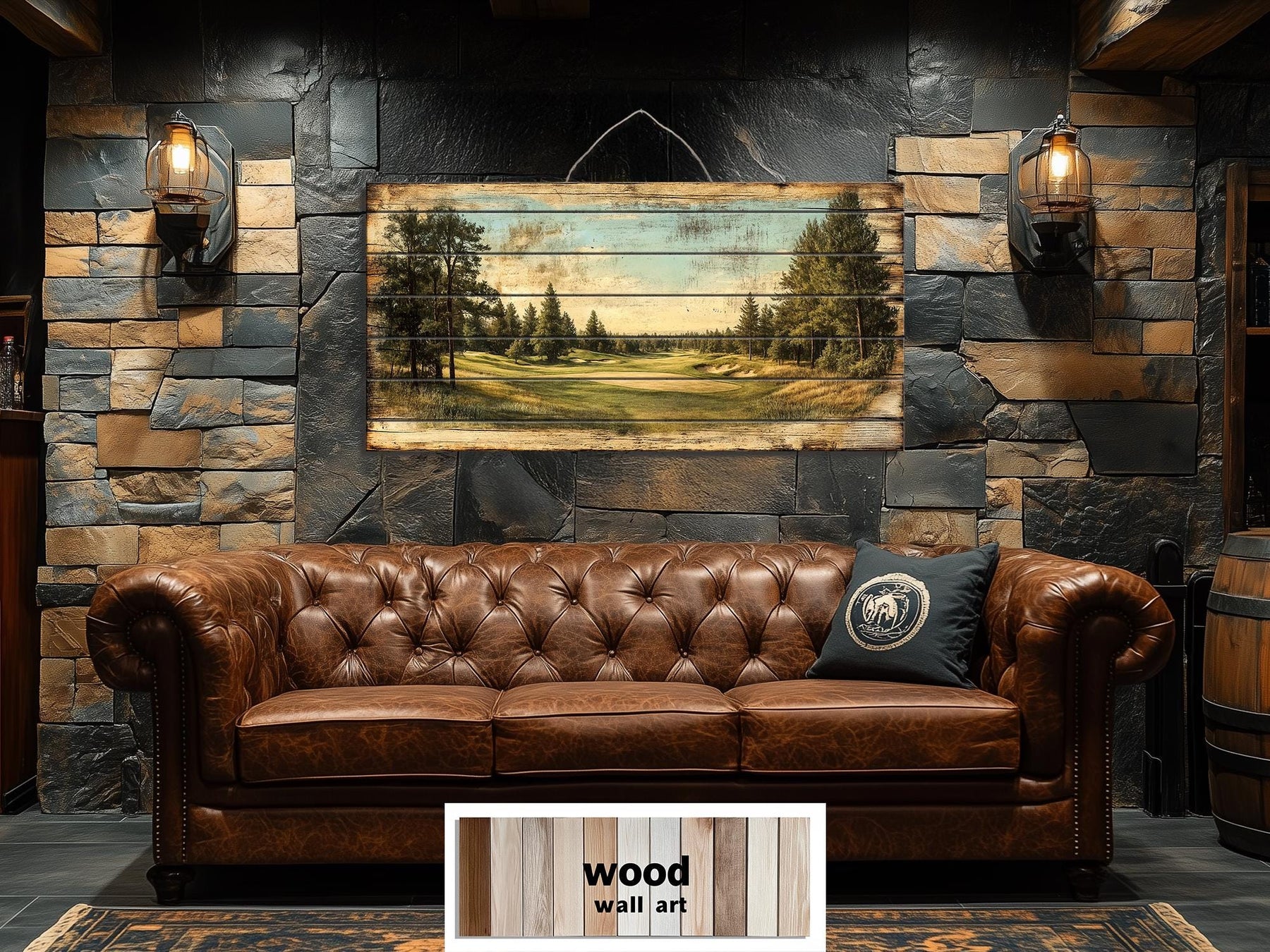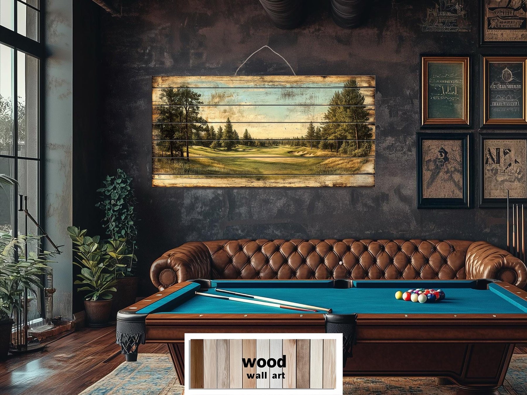 This distressed golf artwork is crafted for man caves, study spaces, golf lounges, and masculine rooms that appreciate tradition and quiet excellence. Whether hung above a leather sofa, framed by dark bookcases, or paired with memorabilia from a favorite course, it anchors the space with character and refinement. The wide, horizontal format works particularly well over low-profile furniture, home bar areas, or beneath shelving where a panoramic composition adds both style and structure. Its aged visual effect fits beautifully with exposed brick, iron fixtures, wood grain textures, and other materials often found in masculine or industrial interiors. In rooms with warm ambient lighting, this piece glows gently without reflecting harsh light, thanks to its matte texture and muted palette. For golf enthusiasts, the scene invites relaxation and pride—a quiet homage to the game that demands both skill and patience. It also works well in more elevated rustic interiors, such as mountain lodges or lakeside cabins, where understated artwork sets a mood without clashing with antique finishes or heritage pieces. This piece offers the perfect balance between sport and serenity, making it a favorite for men who value both. Even in modern homes, it becomes a visual retreat—a personal reminder of time spent chasing the perfect drive. Complete your man cave with this golf course distressed wood wall art.