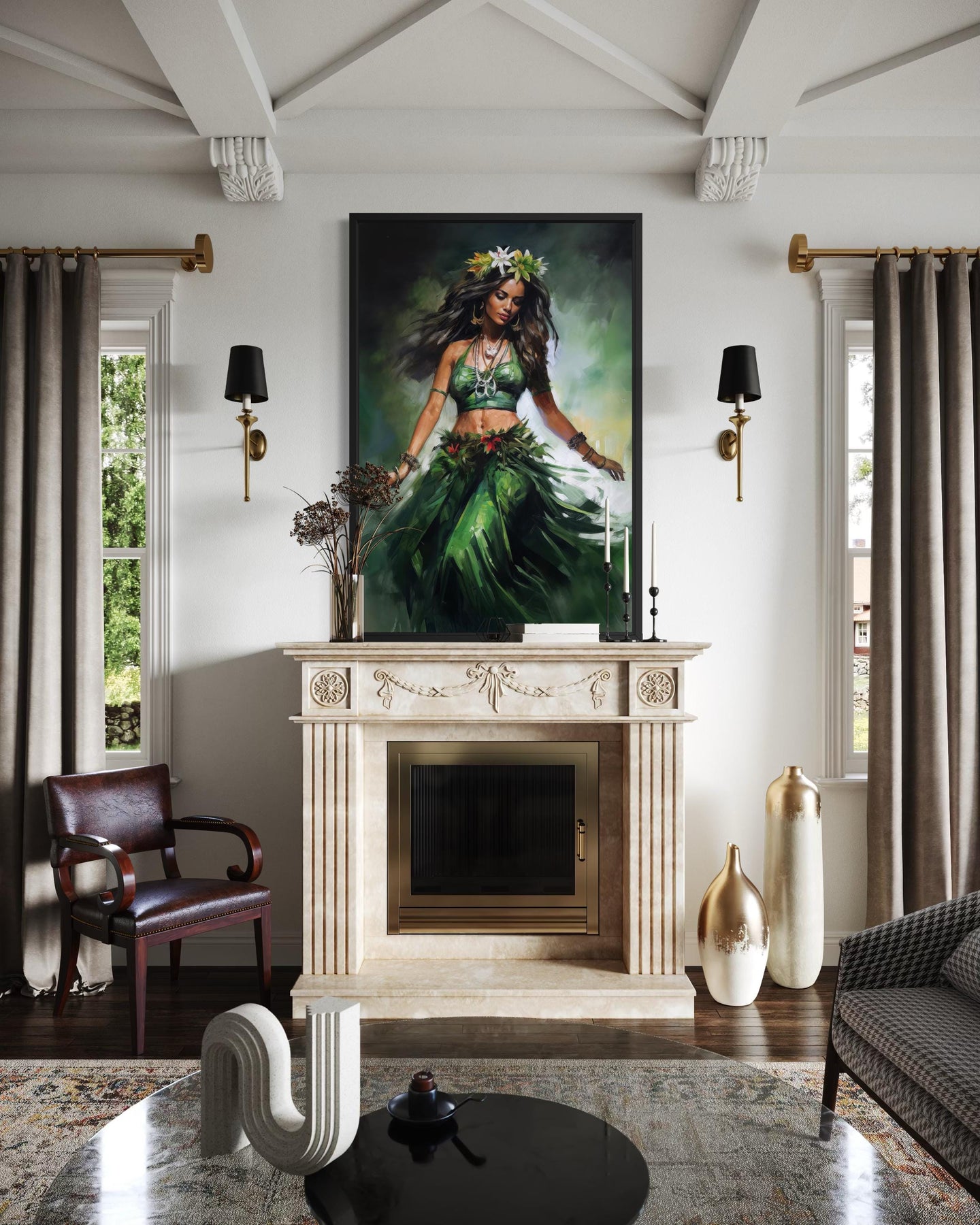 This artwork works particularly well in interiors inspired by tropical travel, island culture, or coastal living where expressive imagery helps define the atmosphere of the space. A coastal living room becomes an ideal location because the vibrant dancer immediately introduces energy and cultural storytelling into the environment. Placed above a sofa, console, or decorative table, the vertical composition gives the artwork strong presence while drawing the eye upward across the wall. Tropical themed interiors that feature natural wood furniture, woven textures, and warm lighting complement the island spirit of the painting beautifully. The subject also resonates with collectors who appreciate cultural dance and artistic representations of traditional celebrations. Vacation homes, beach houses, and coastal apartments often benefit from artwork that reflects the spirit of island life and warm ocean climates. Because the scene focuses on movement and human expression, the painting becomes a conversation piece that immediately attracts attention. Rooms designed around travel memories or tropical decor naturally support the lively personality of the dancer. The rich greens and dramatic lighting also pair well with darker interior palettes where the artwork can stand out boldly. The overall effect is a vibrant cultural centerpiece that brings the rhythm and spirit of the islands into the room through Hawaiian Hula Dancer canvas wall art.